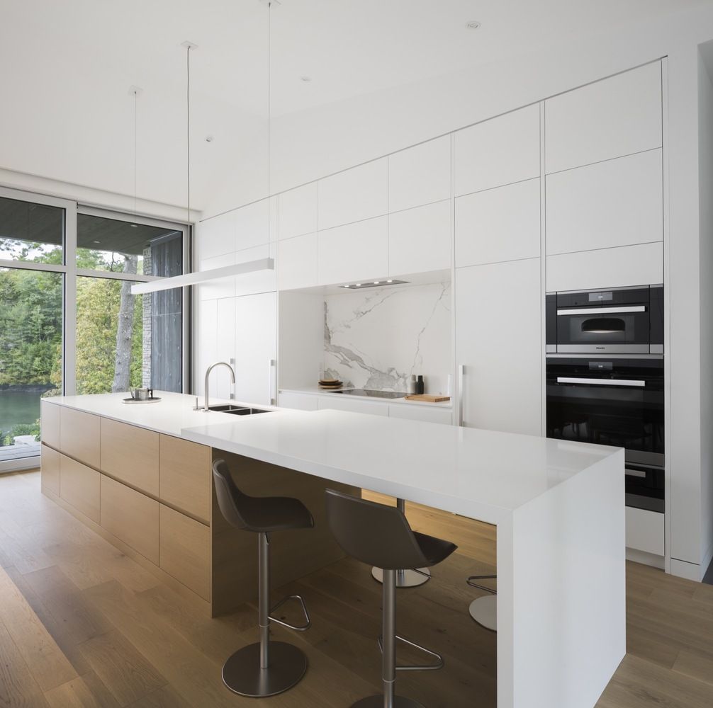 Kuchnia oraz wbudowane meble przy kominku, które ukrywają telewizor, zostały zaprojektowane z ogromną dbałością o każdy detal i doskonale maskują wszystkie techniczne aspekty tego pomieszczenia. Biel kuchni jest przedłużeniem ścian i sufitów, ale wyspa wychodzi bardziej z podłogi, która wykończona jest dużymi deskami z białego dębu. Całość tworzy wrażenie niezwykłej lekkości, przy jednoczesnej dbałości o detale, która typowa bywa zwykle dla najwyższej klasy hoteli.