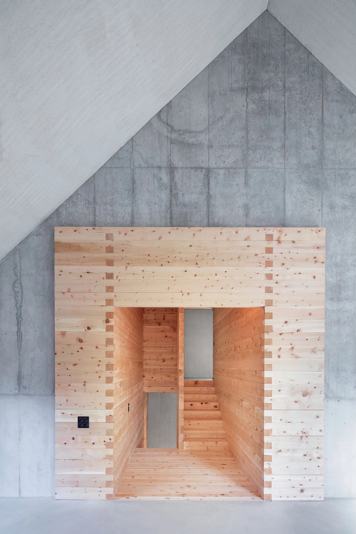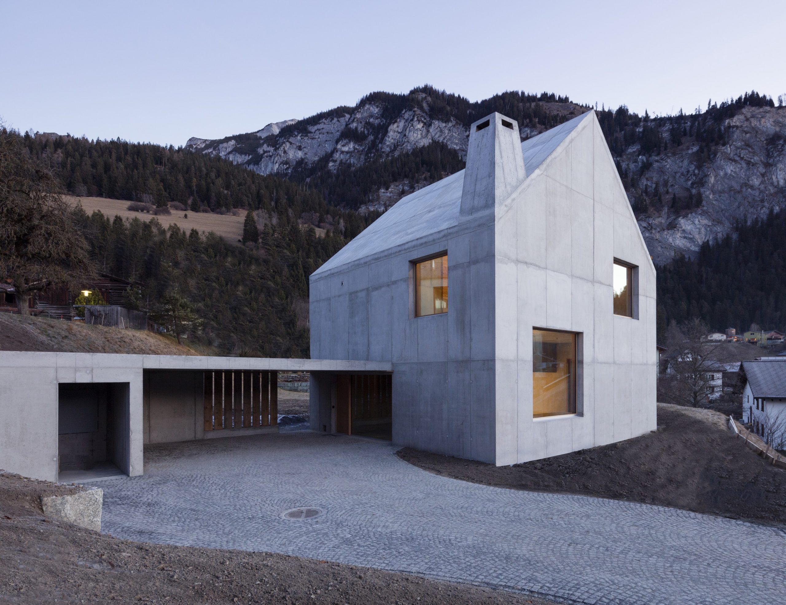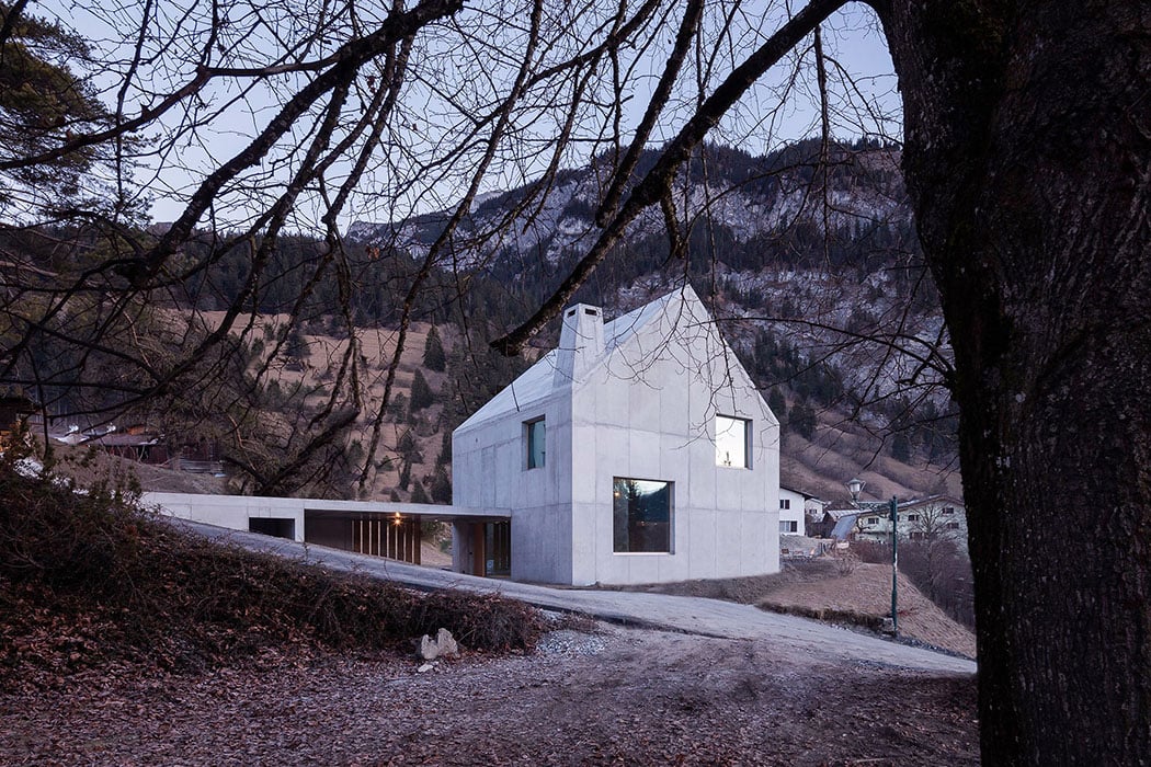 Bryła budynku ma niemal kwadratowy plan i stromy dach, co nadaje mu elegancki, monolityczny charakter, zbliżony do formy nowoczesnej stodoły. Boczny, parterowy aneks łagodnie wkomponowano w teren, wyznaczając główne wejście i dwa zadaszone miejsca parkingowe. Konstrukcję nośną tworzy zewnętrzny żelbetowy pierścień oraz płyty stropowe. Wewnątrz znajduje się drewniany, niekonstrukcyjny rdzeń, pełniący funkcję przestrzenno-materiałowego kontrastu. Izolacja wewnętrzna została pokryta tynkiem mineralnym, a odcień betonu nawiązuje do lokalnego cementu, co wzmacnia związek budynku z miejscem.
