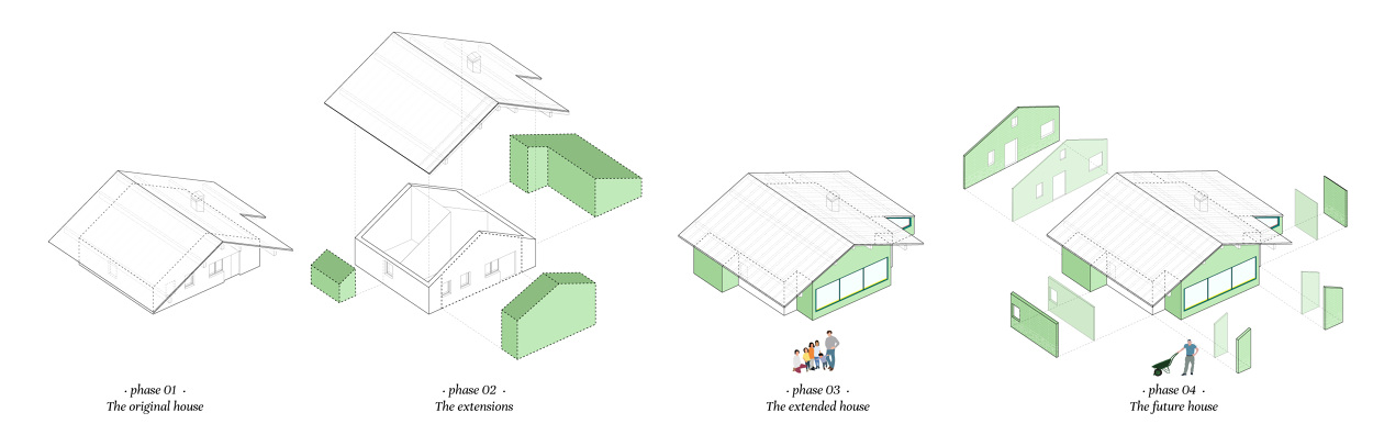 Dom, pierwotnie wybudowany w latach 70. jako domek letniskowy, nie posiadał żadnego ocieplenia ani bezpośredniego związku z krajobrazem czy otoczeniem. Mając to na uwadze, projekt opiera się na potrójnej strategii, która pozwala stopniowo rozbudowywać, łączyć i izolować termicznie dom, dbając zarówno o komfort, zużycie energii, jak i cieszenie się jego wiejskim charakterem.