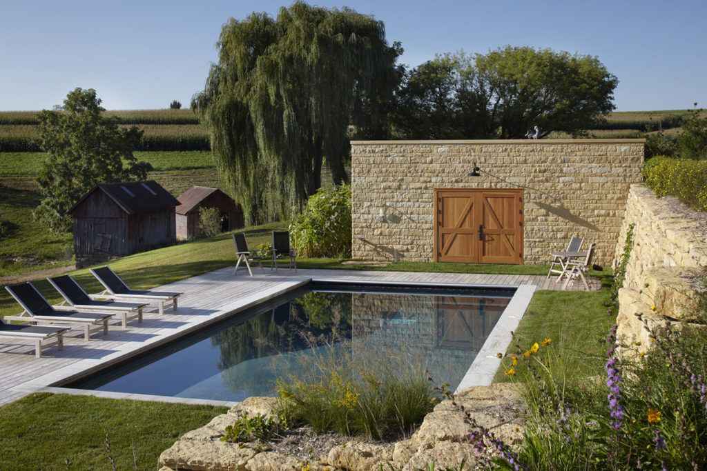 Odzyskane drewno i kamień wykorzystano do wykonania mebli, detali architektonicznych oraz elementów konstrukcyjnych. Szczególną uwagę zwraca wapienny kominek w salonie oraz kamienny mur przy basenie, które powstały z materiałów pochodzących z dawnej stodoły. Właściciele marzyli także o przestronnej kuchni zdolnej pomieścić około 20 gości, sprzyjającej spotkaniom rodzinnym i wakacyjnym przyjęciom. Architekt Bill Bickford we współpracy z firmą Traditional Carpentry, Inc. zaprojektował unikalne rozwiązania stolarskie, w tym przesuwne drzwi do sypialni głównej, wykonane ze starego billboardu zamontowanego na specjalnych szynach.