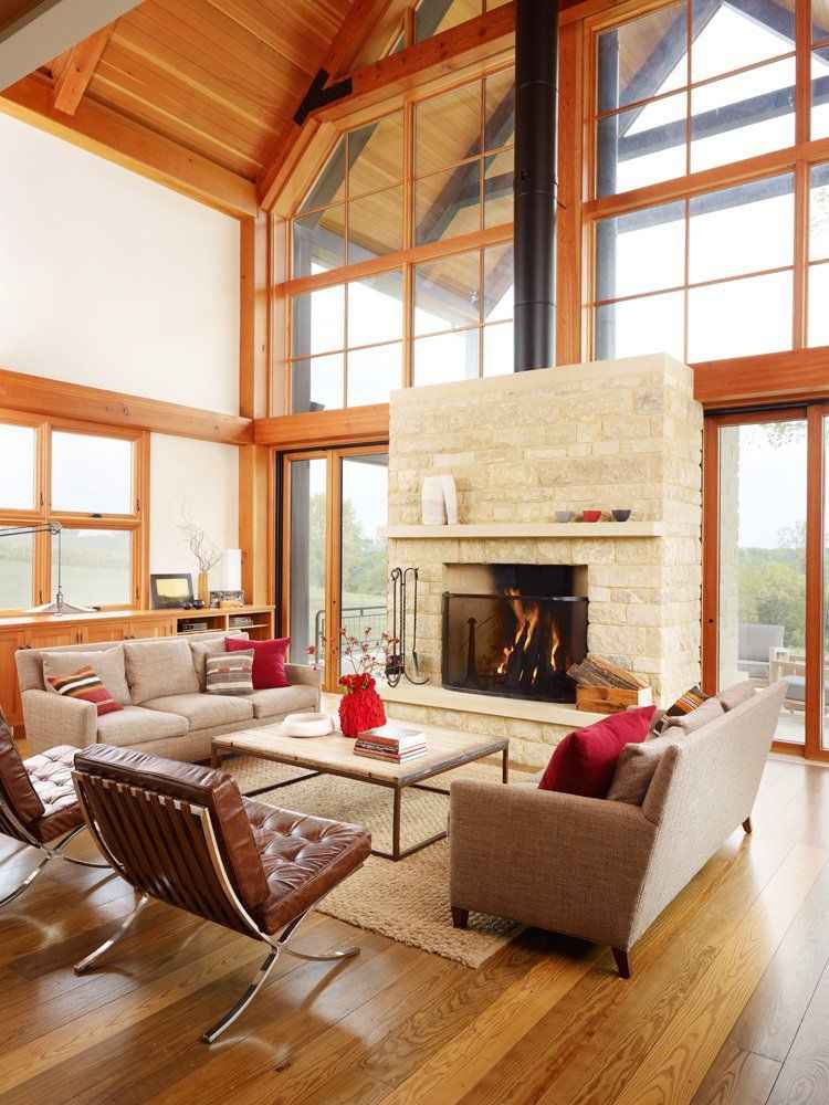 Projekt przygotowany przez pracownię Northworks z Chicago umiejętnie łączy klasyczną estetykę stodoły z komfortem nowoczesnego domu wypoczynkowego. Podłogi wykonano z unikatowych desek uratowanych z dna jeziora Superior, co dodatkowo podkreśla ekologiczny charakter realizacji. Wysokie sufity, otwarty plan i naturalne światło nadają wnętrzom lekkości i przestronności. Dom zachowuje kameralny klimat podczas codziennego użytkowania, a jednocześnie z łatwością mieści ponad 25 osób, pozostając funkcjonalnym i przytulnym przykładem koncepcji nowoczesna stodoła w amerykańskim wydaniu.