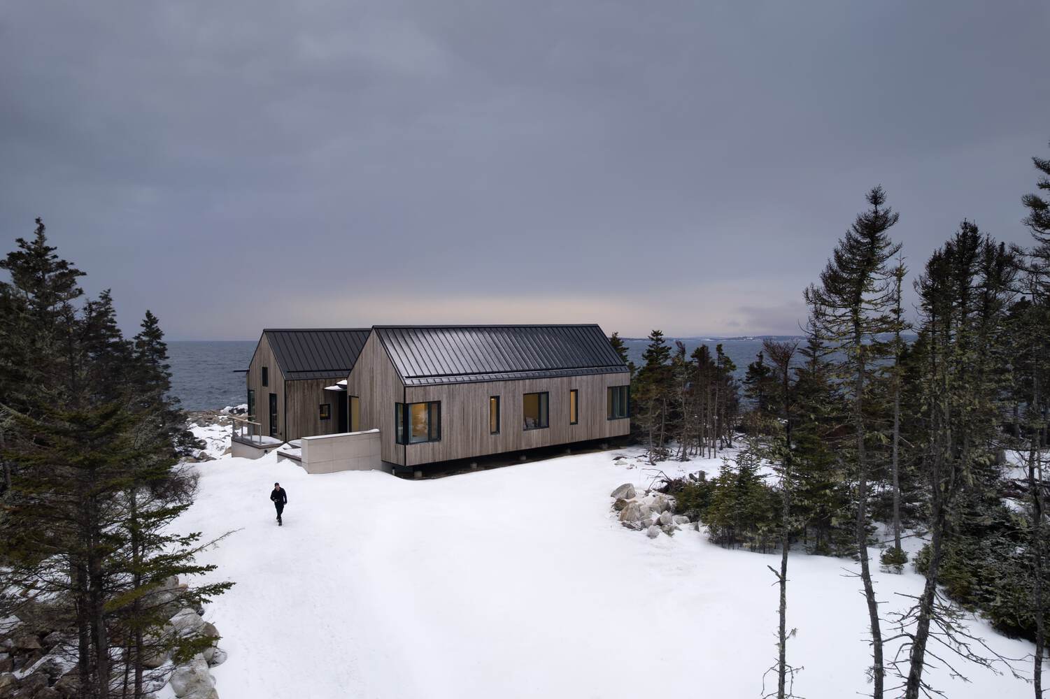 Na skalistym wybrzeżu Nowej Szkocji powstał projekt Tide Bound – dom, który w wyjątkowy sposób łączy architekturę z siłą natury. Budynek góruje nad oceanem, oparty na dwóch wyrazistych, dwuspadowych bryłach, które odzwierciedlają charakter nadmorskiego krajobrazu. Surowość terenu, zmienność pogody i gwałtowne zjawiska atmosferyczne stały się tu podstawowymi determinantami projektu, prowadząc do powstania struktury odpornej, zakorzenionej i pełnej szacunku wobec miejsca.