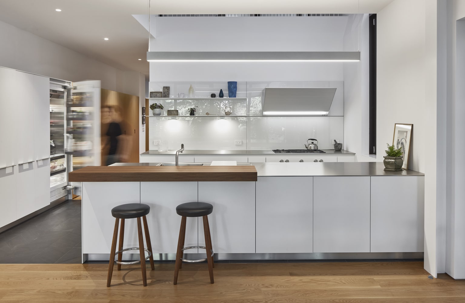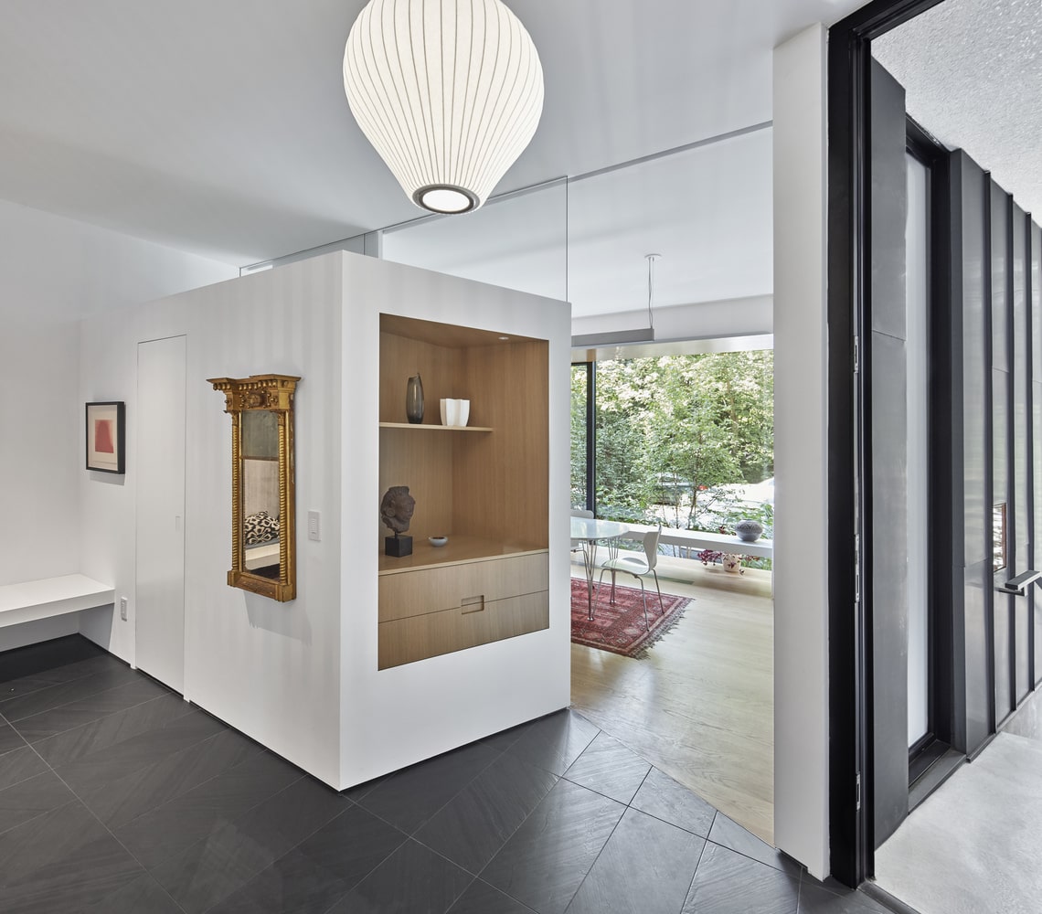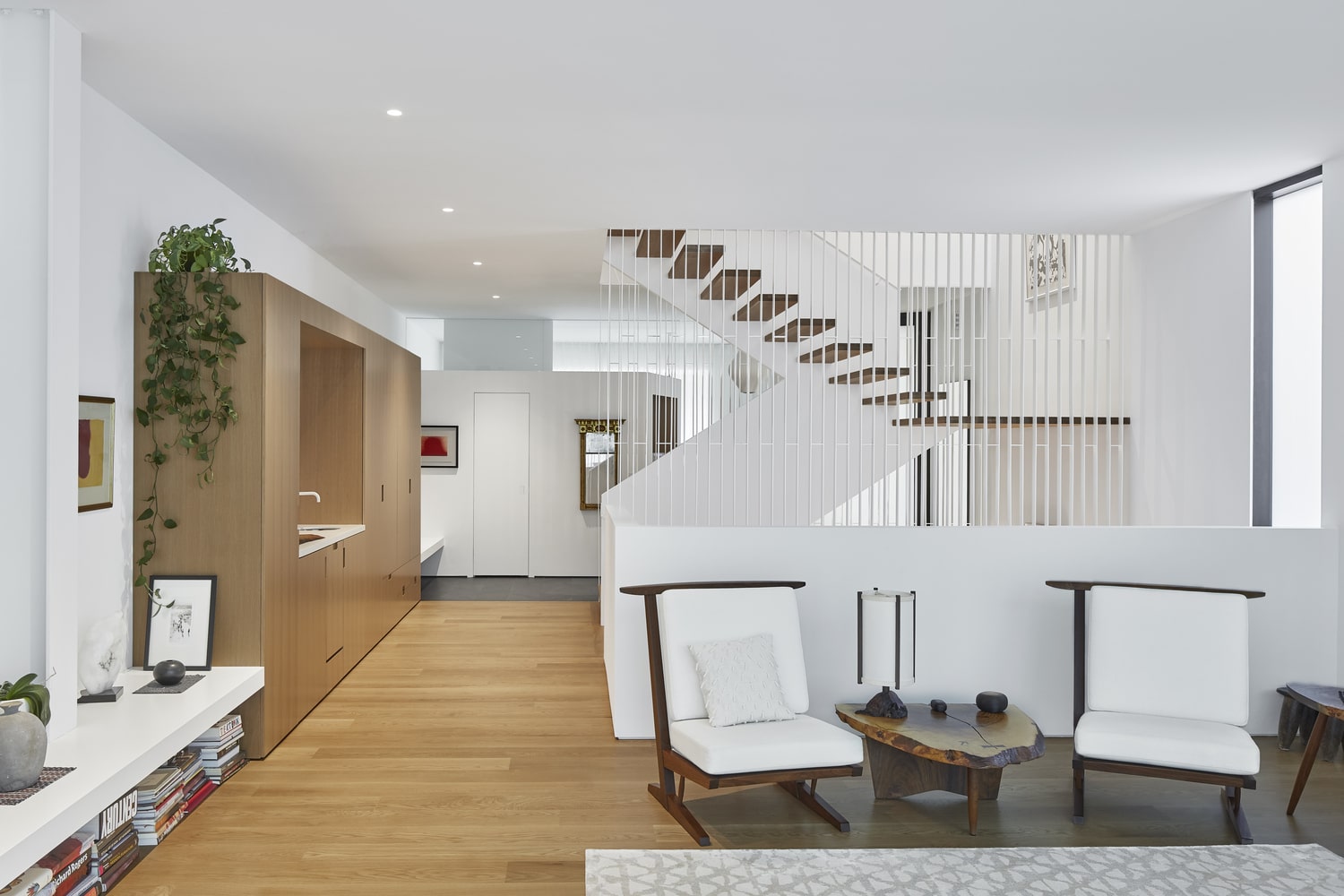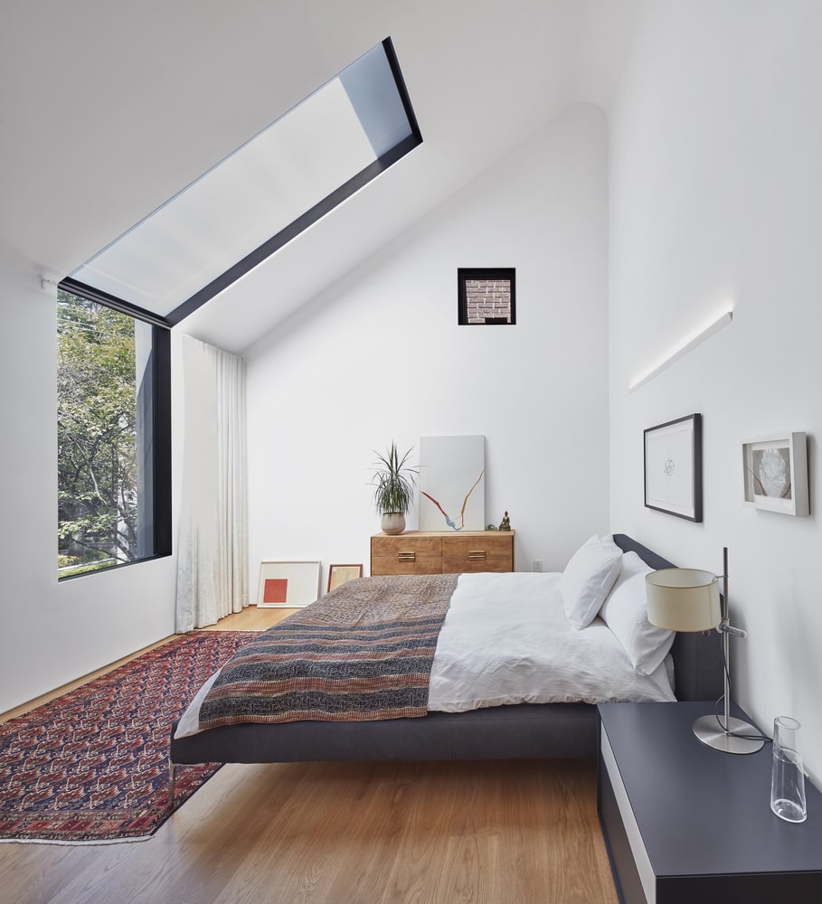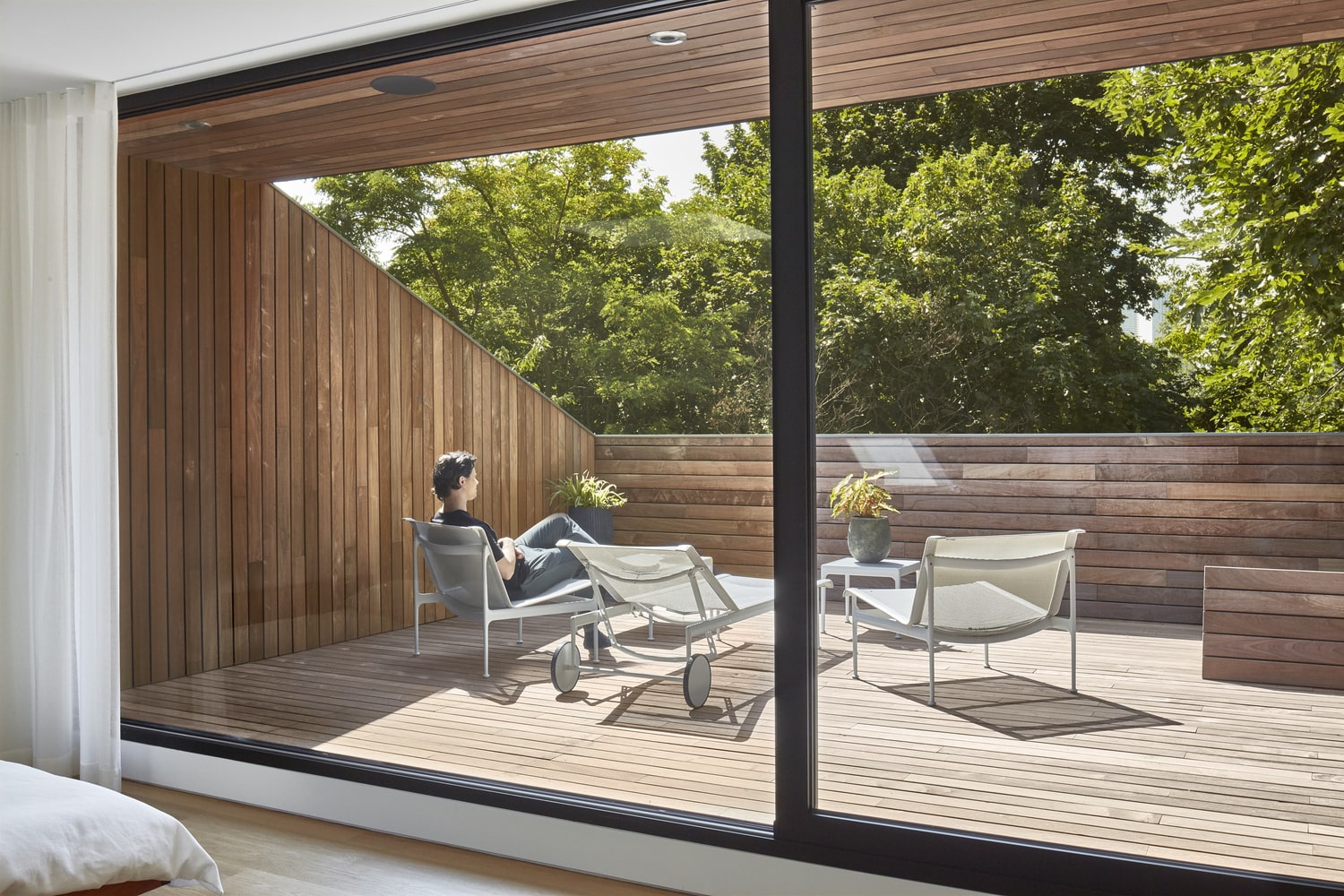 Na wyższych poziomach znajdują się sypialnie, apartament z ukrytymi drzwiami kieszeniowymi, a także przestrzeń rekreacyjna z prywatnym spa, strefą fitness oraz tarasem widokowym. Taras osłonięto przed wiatrem i nadmiernym słońcem, dzięki czemu powstała prywatna oaza z panoramicznym widokiem na Toronto. Cała rezydencja zachwyca inteligentnym wykorzystaniem przestrzeni, nowoczesnymi rozwiązaniami materiałowymi oraz subtelnym balansowaniem między współczesną architekturą a poszanowaniem miejskiego kontekstu. Tile House to przykład na to, jak estetyka i funkcjonalność mogą współistnieć w zwartej miejskiej zabudowie.