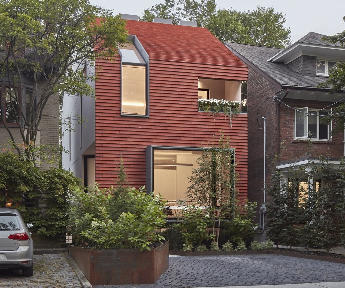 Tile House to wyjątkowa rezydencja mieszkalna w sercu Toronto, która powstała na miejscu wcześniejszego budynku, zachowując lokalny kontekst urbanistyczny. Projekt autorstwa Kohn Shnier Architects stanowi odważną interpretację miejskiej architektury – łączy nowoczesny design z odniesieniami do tradycyjnej zabudowy ceglanej. Zastosowano tu ręcznie wykonywaną glinianą dachówkę, która pełni zarówno funkcję pokrycia dachowego, jak i elewacji, tworząc spójną, monolityczną bryłę. Budynek doskonale wpisuje się w rytm historycznej ulicy, a jednocześnie wyróżnia się fakturą i materiałem, dzięki czemu zyskuje unikalny, ale zakorzeniony wizualnie charakter – niczym reinterpretowana nowoczesna stodoła.