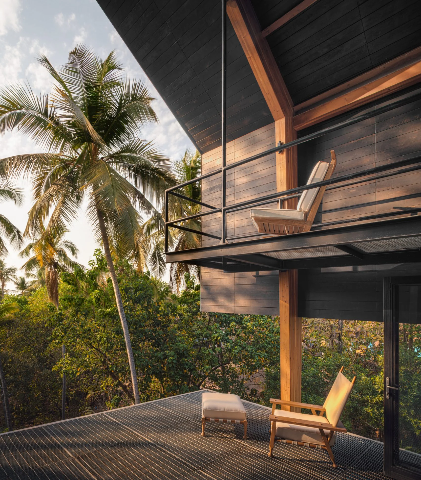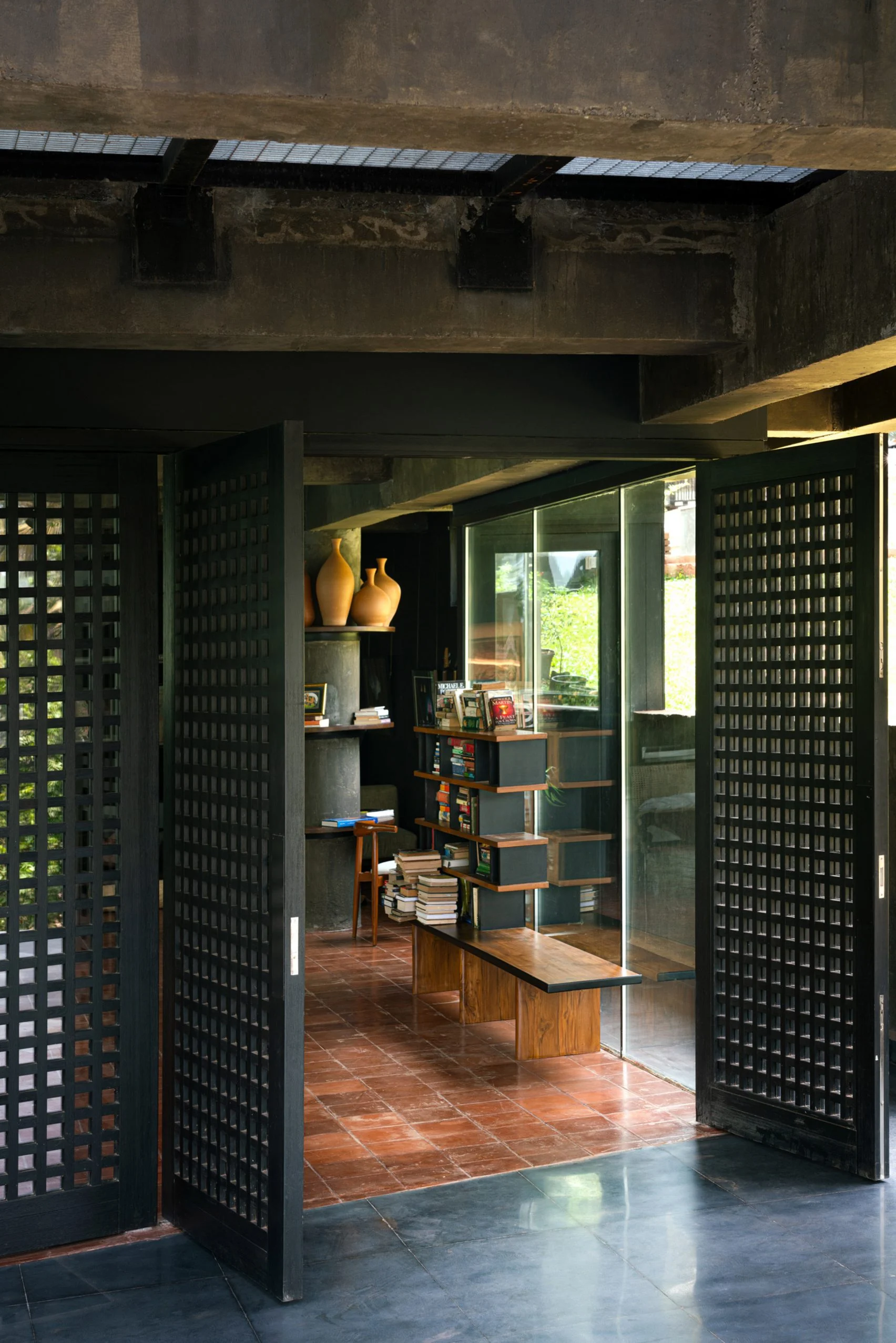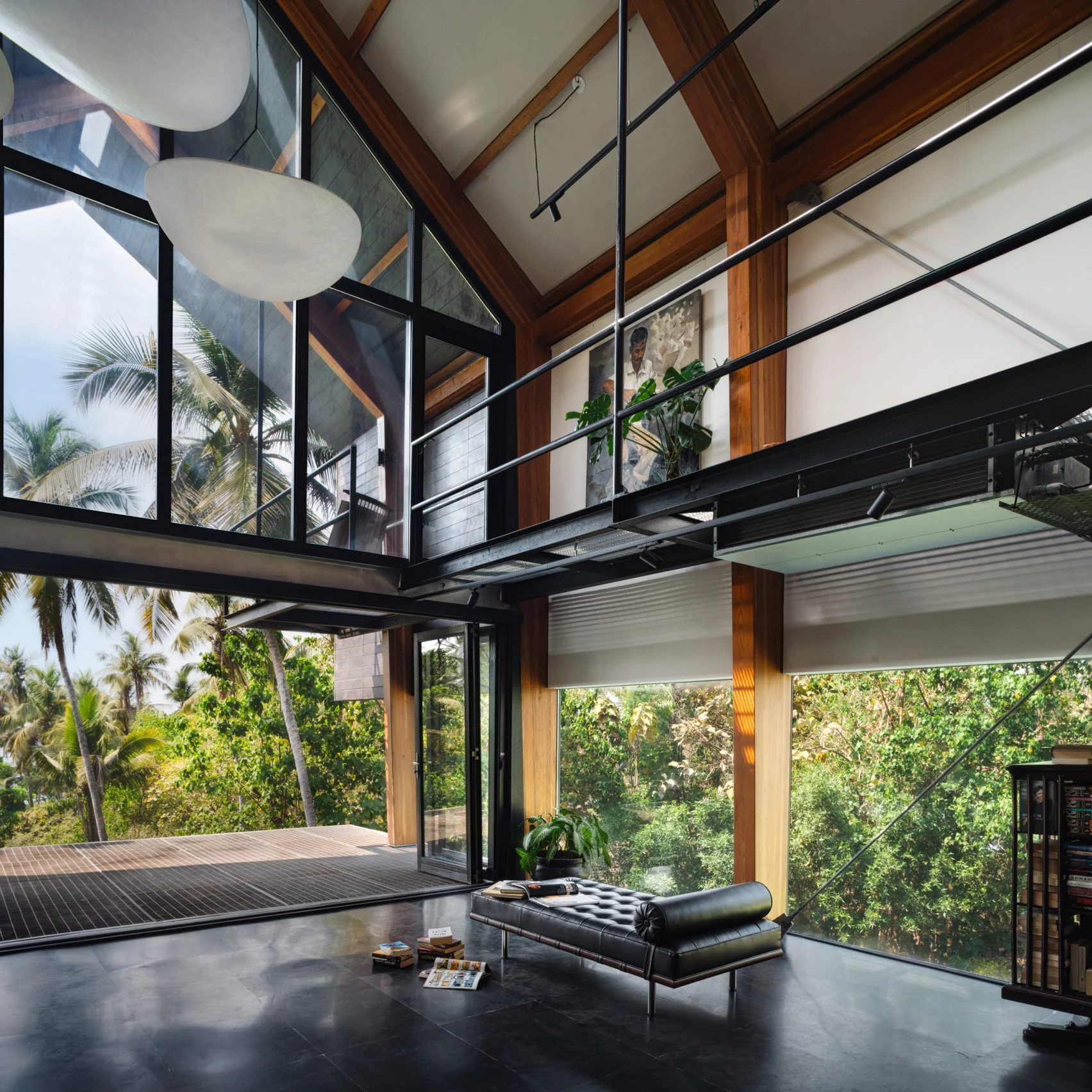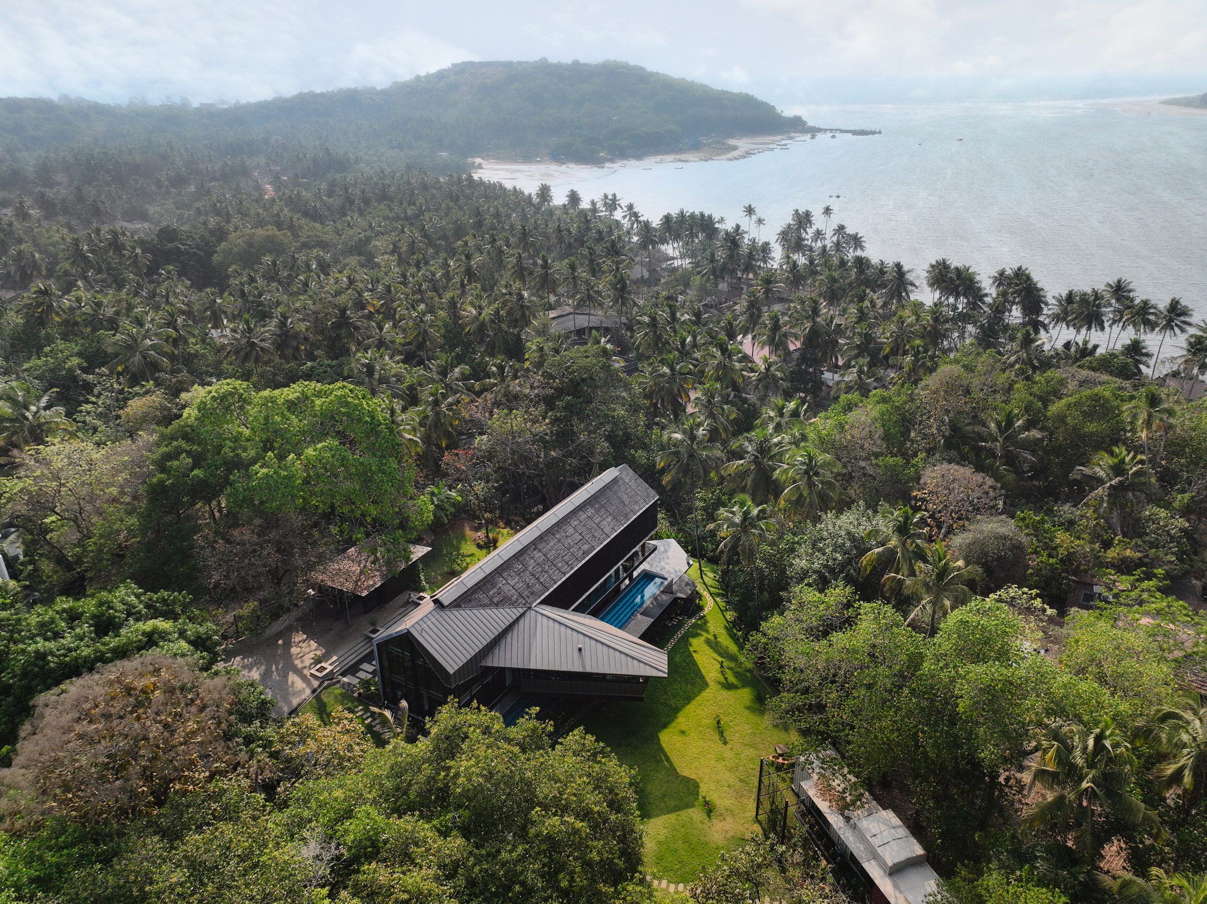 Na poziomie gruntu umieszczono przeszkloną przestrzeń warsztatową. Elewacja domu pokryta jest opalaną drewnianą okładziną, wykonaną techniką yakisugi, znaną z trwałości i odporności na wilgoć, idealną dla tropikalnego klimatu Goa.