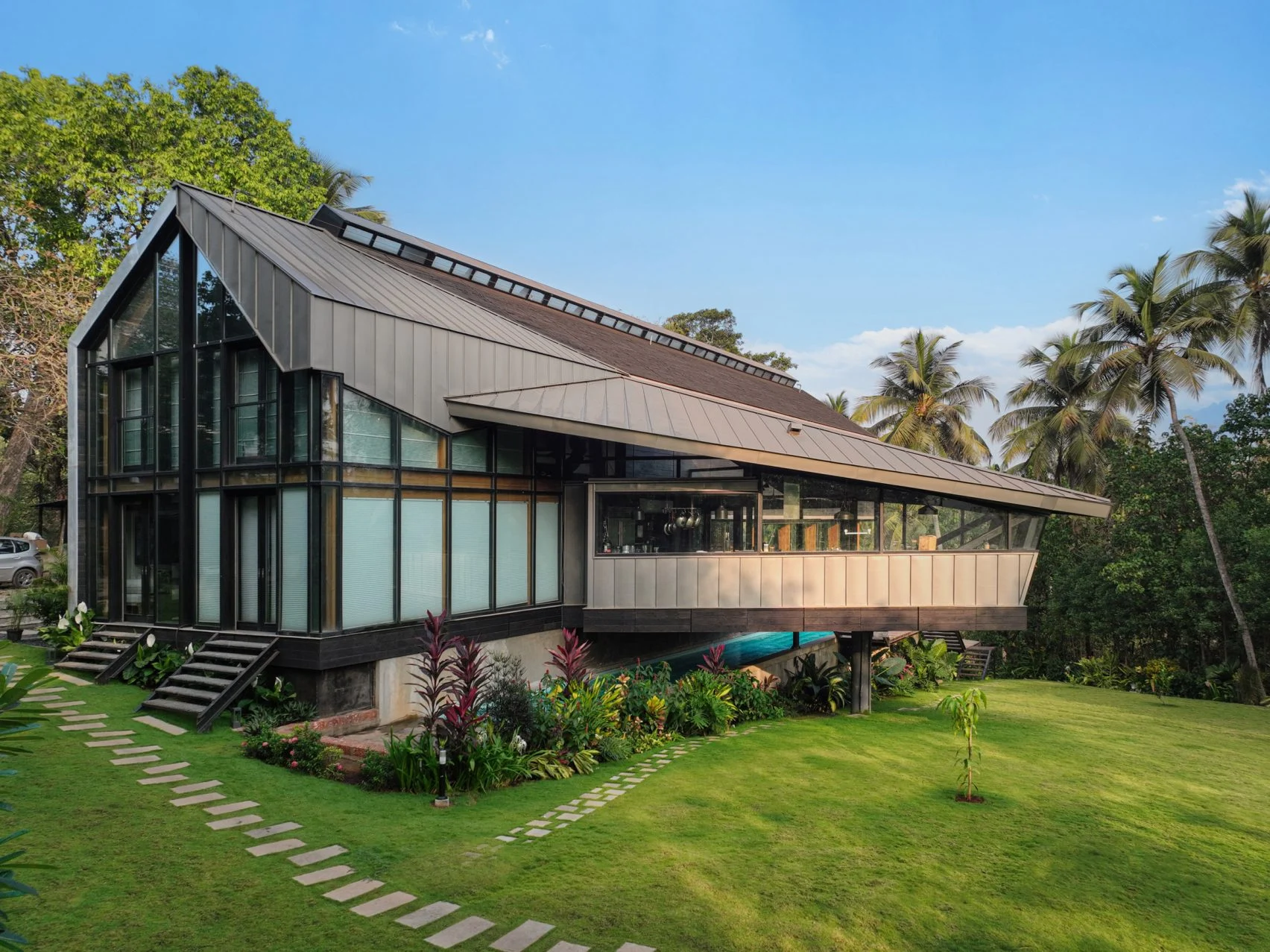 Dom znajduje się na szczycie stromej działki w pobliżu rzeki Chapora i został zbudowany w sposób minimalnie ingerujący w środowisko. Konstrukcję wsparto na betonowych ścianach oporowych i palach, co chroni przed wilgocią i zapewnia stabilność. Portalowe ramy z glulam, prefabrykowane w Delhi i montowane na miejscu w Goa, pozwoliły na szybkie i precyzyjne wykonanie. Architekt Akshat Bhatt podkreśla, że drewno masowe łączy w sobie estetykę i zrównoważony rozwój.