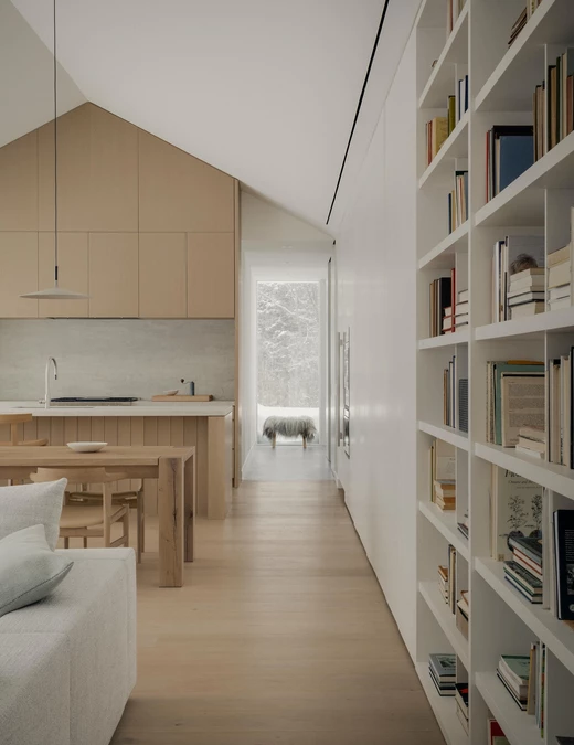 Bryła Timbertop House czerpie z tradycji prostych, szczerych konstrukcji gospodarczych. Asymetryczny dach wznosi się stromo ku otwartemu polu, po czym łagodnie opada w stronę lasu – pokazując dialog między przestrzenią uprawną a gęstą zielenią. Architekci Akb Architects odświeżyli archetyp stodoły w sposób minimalistyczny, osadzając go w krajobrazie z wyczuciem i szacunkiem dla kontekstu.