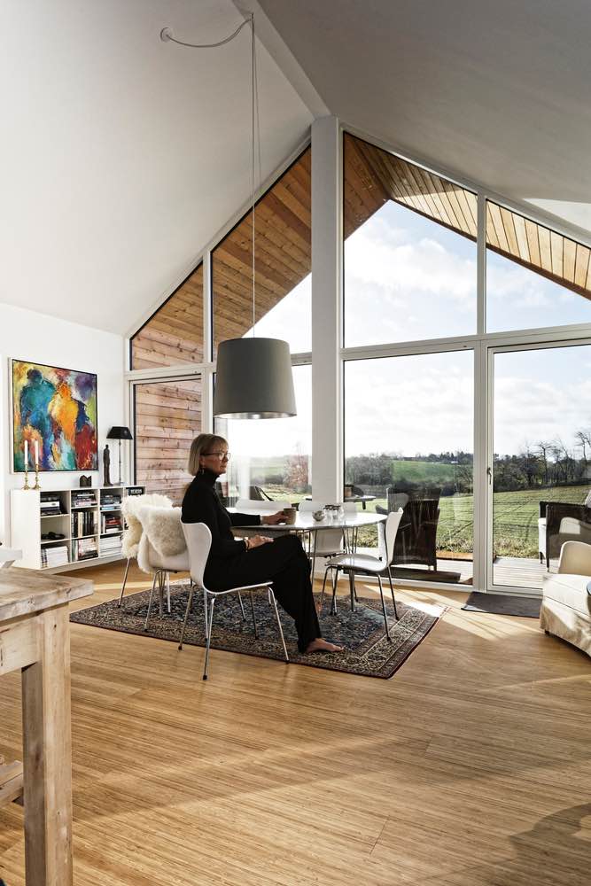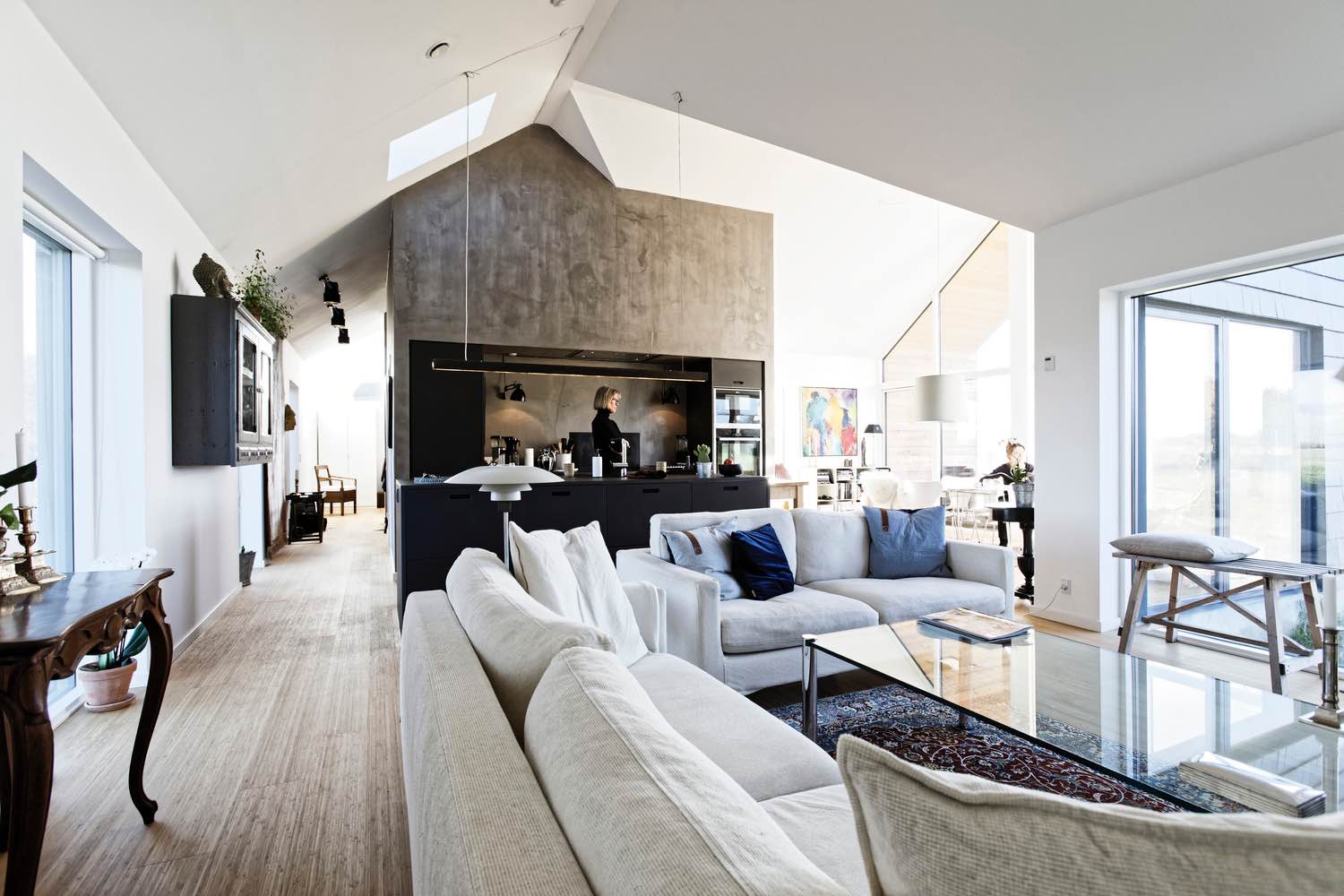 Dom dzieli się na część prywatną i część społeczną, które spotykają się w centralnie usytuowanej strefie dziennej. Otwarta kuchnia i wysoki salon w pełni korzystają z widoków na naturalny krajobraz, wpuszczając do wnętrza światło i tworząc poczucie bliskości z otoczeniem. Elastyczność funkcji sprawia, że budynek może odpowiadać na zmieniające się potrzeby mieszkańców i gości bez konieczności kosztownych przebudów.