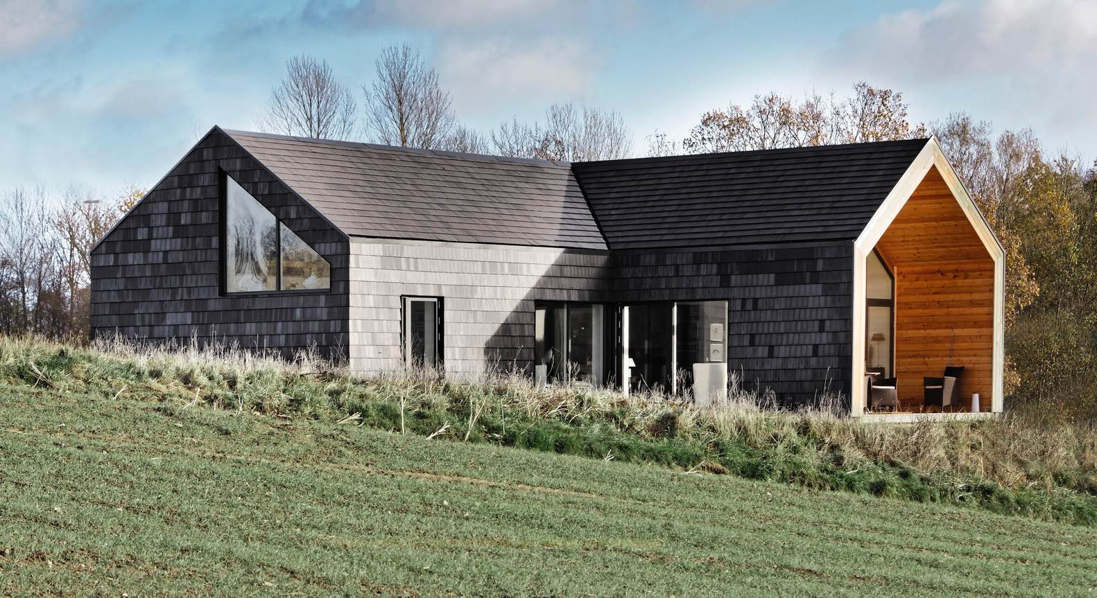 Tradycyjna konstrukcja nośna z betonu komórkowego została zastąpiona drewnianym szkieletem, co pozwoliło niemal całkowicie wyeliminować ślad węglowy związany z betonem. Zewnętrzną warstwę domu pokryto cienką, zaledwie 13-milimetrową okładziną z cegły układanej w formie gontu. Dzięki temu objętość materiału została znacząco zredukowana, a emisje spadły. System elewacyjny posiada certyfikat Cradle-to-Cradle, co oznacza, że ceglane gonty można w przyszłości wymieniać częściowo lub w całości, a ich ponowne wykorzystanie staje się realną praktyką.