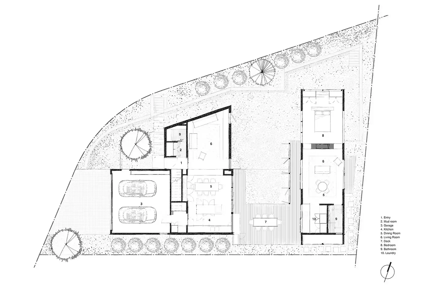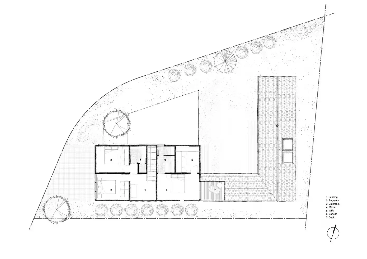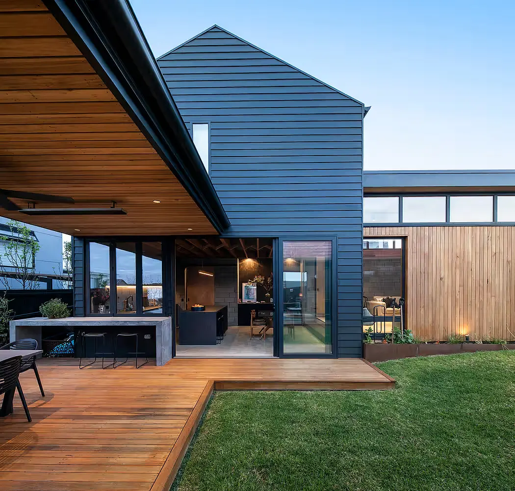 Zewnętrzna część Torquay House prezentuje stonowaną, ale atrakcyjną wizualnie paletę. Łączy pomalowane na czarno deski zewnętrzne, dach z dachówek w kolorze ziemi i odsłonięte detale z naturalnego drewna. Ta kombinacja minimalizmu tworzy tło, które uzupełnia surferski styl życia i podkreśla geometryczne współdziałanie brył.