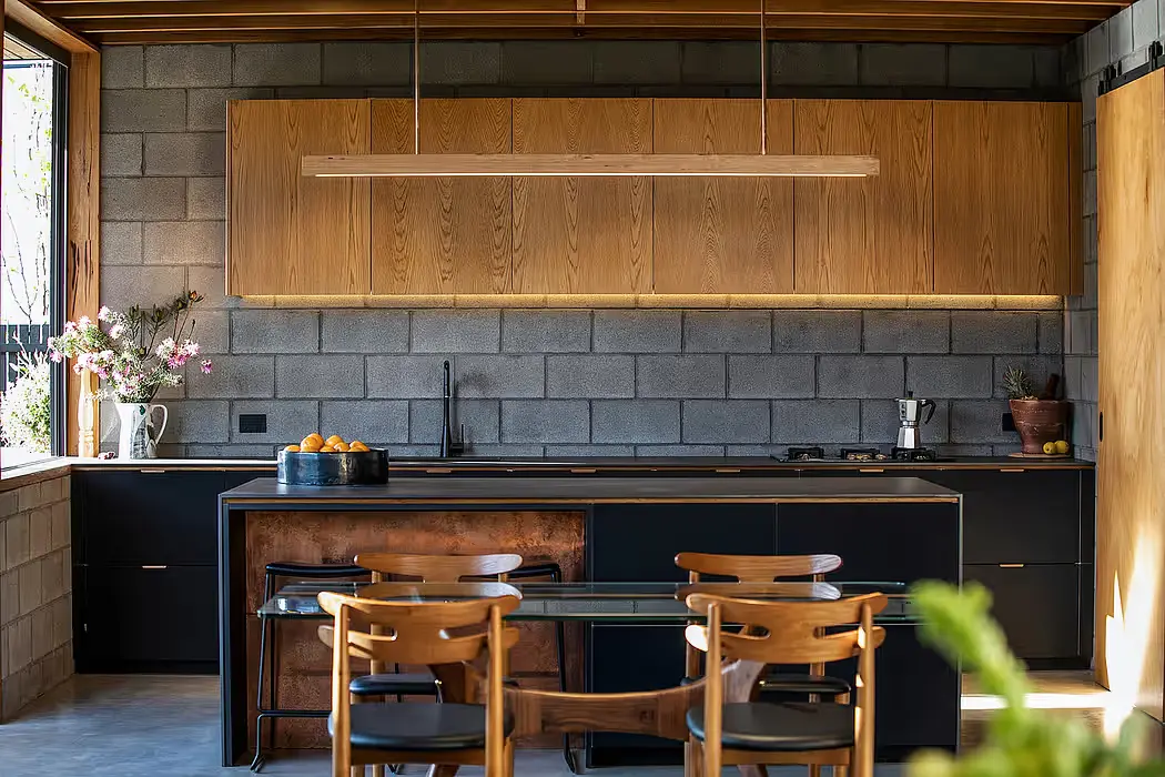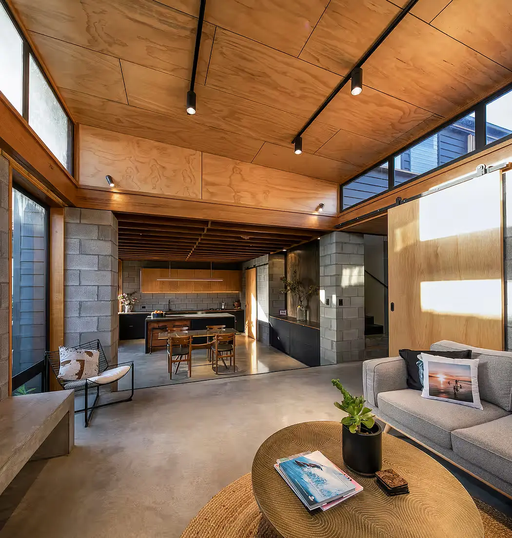 W części dziennej znajdują się ściany z surowych bloczków betonowych, podłoga z polerowanego betonu oraz detale z naturalnego drewna i miedzi. Odzwierciedla to społeczną atmosferę przestrzeni. W miarę wchodzenia do bardziej prywatnych obszarów na piętrze, paleta materiałów zmienia się w spokojniejszą i bardziej stonowaną estetykę. Stonowane drewniane i betonowe podłogi w połączeniu z białym tłem z płyt gipsowo-kartonowych i wyrafinowanymi detalami ze sklejki tworzą relaksującą i spokojną atmosferę. Całość zachęca mieszkańców do odpoczynku po dniu spędzonym na plaży.