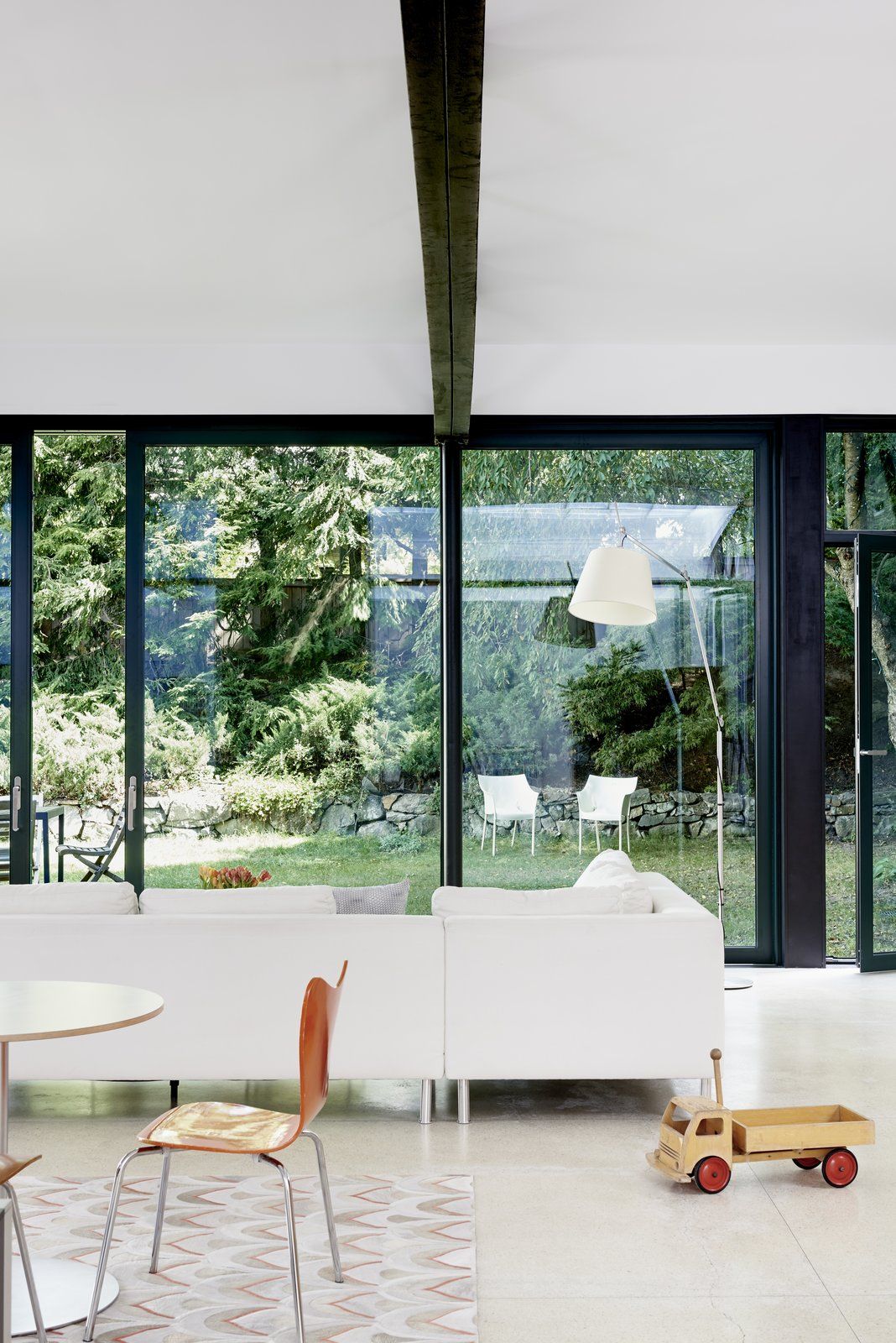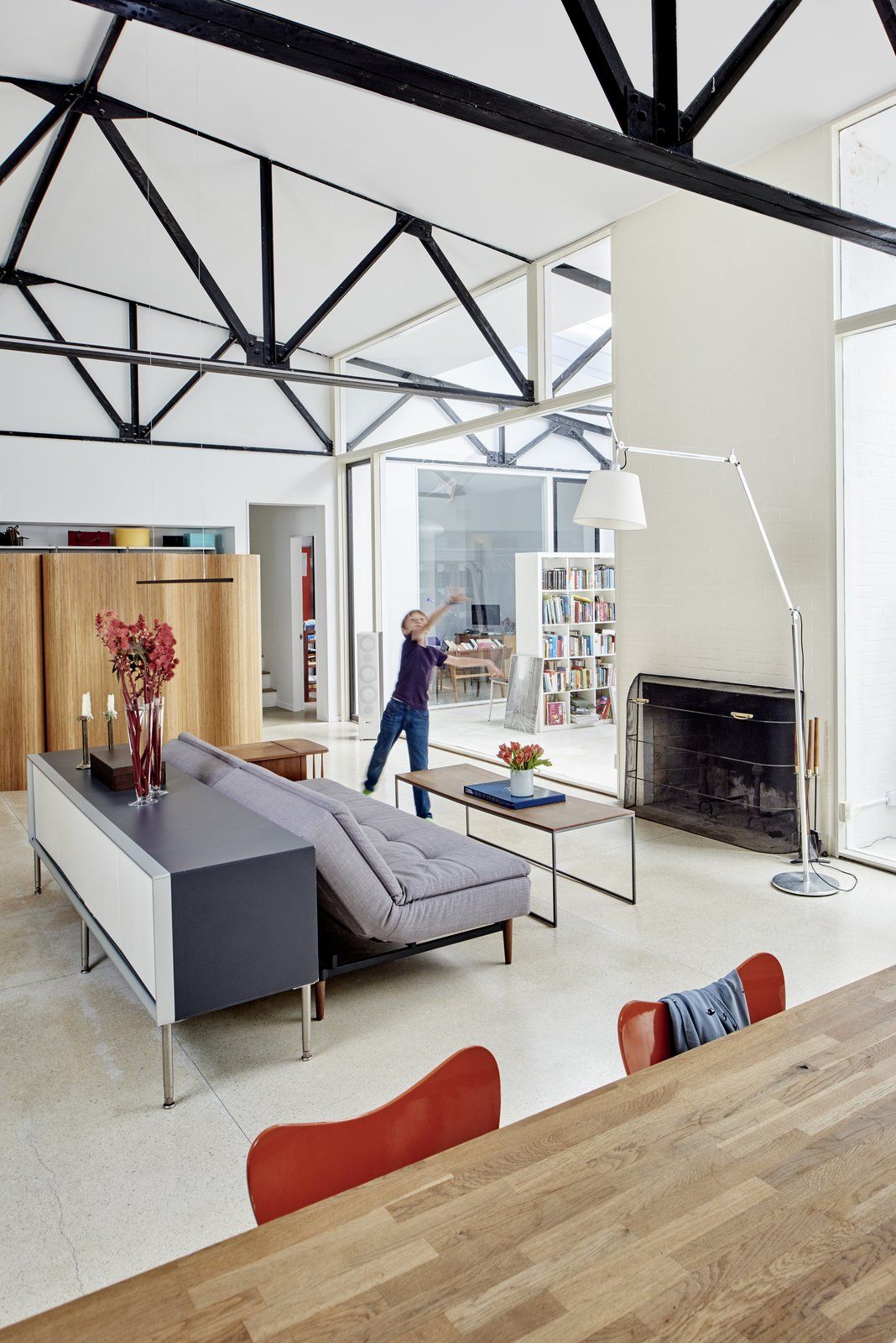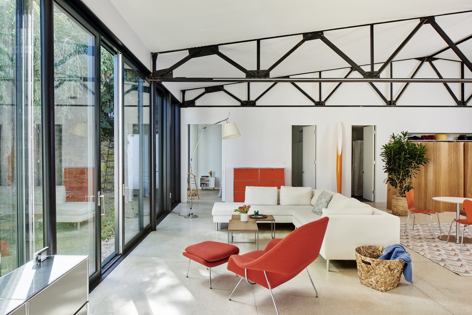 Ten modernistyczny dom powstał w wyniku transformacji miejskiego garażu w prywatny budynek mieszkalny pod koniec lat 50. XX wieku, według projektu wybitnego architekta modernizmu, Paula Rudolpha. Obiekt początkowo zachwycał jakością architektury i w 1960 roku zdobył prestiżowe wyróżnienie „Record Houses”. Po latach nowi właściciele zlecili pracowni Ruhl Walker Architects kompleksową modernizację budynku, której celem było dostosowanie domu do współczesnych standardów energetycznych oraz potrzeb wieloosobowej rodziny. Projekt objął nową konstrukcję ścian zewnętrznych i przeszkleń, w tym imponującą ścianę przesuwnych drzwi z potrójnymi szybami, które otwierają wnętrze na podwórze, zapewniają naturalną wentylację i wzmacniają relację domu z otoczeniem — w duchu, który dziś można porównać do idei nowoczesna stodoła w miejskim wydaniu.