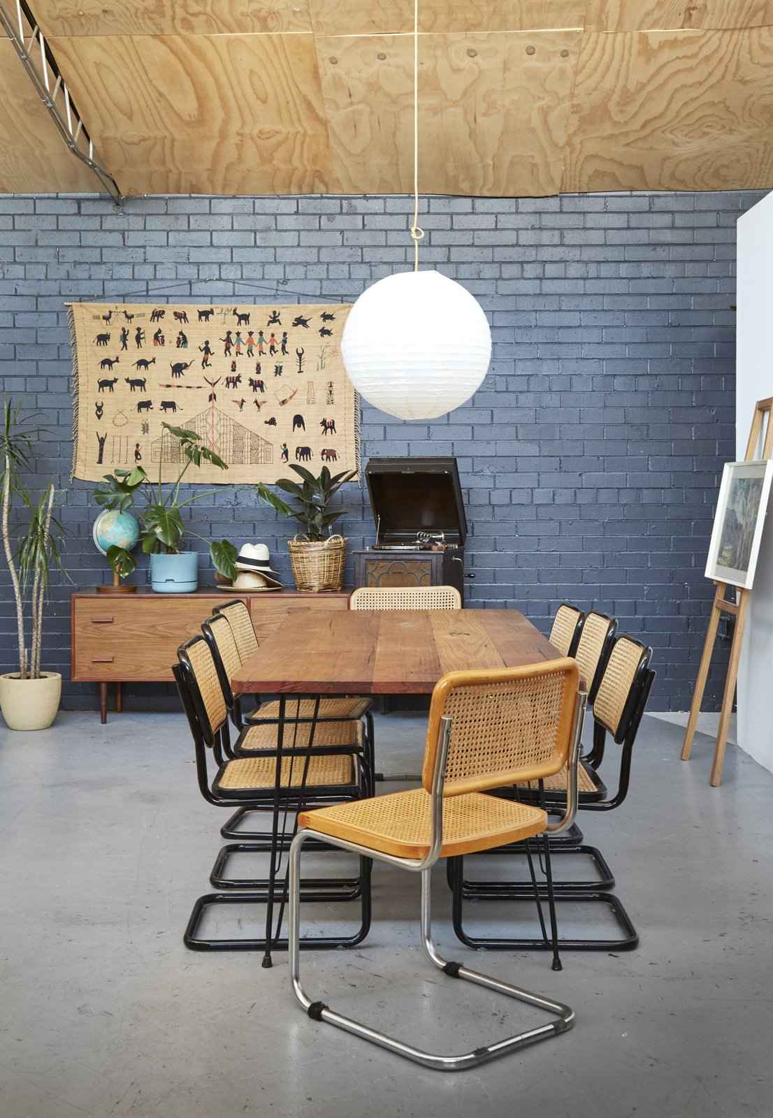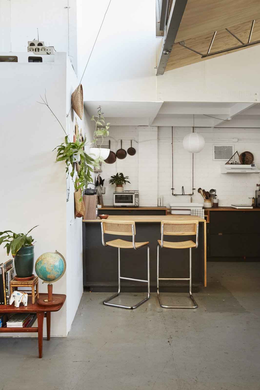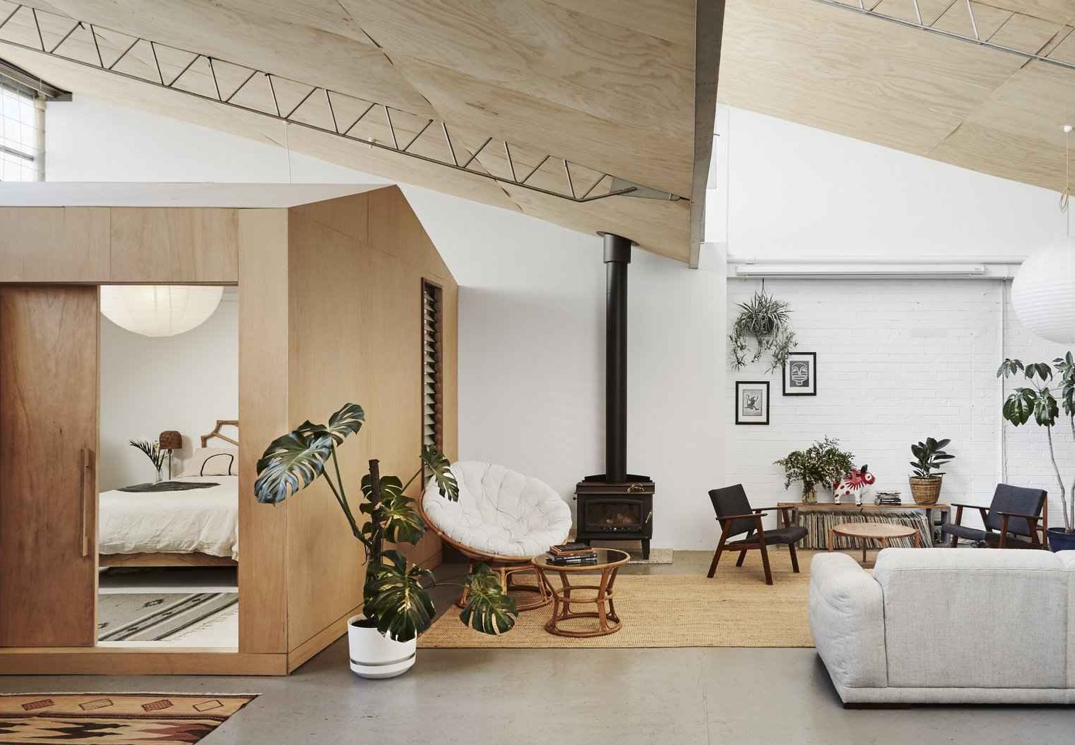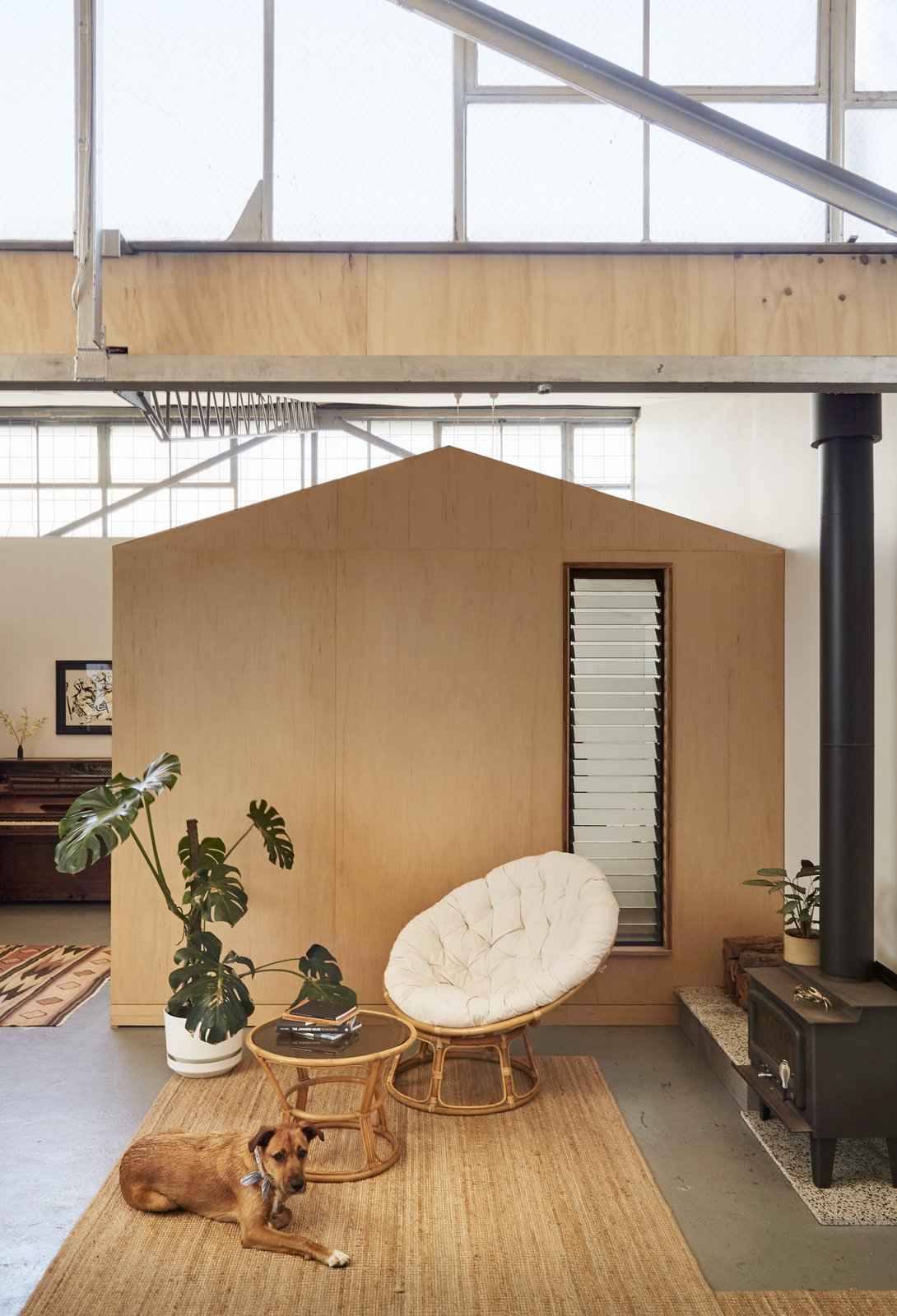 Wnętrze wypełniono roślinami, różnorodnymi teksturami i unikalnymi meblami, tworząc przytulną atmosferę mimo industrialnych ram budynku. Konstrukcja sypialni została posadowiona na ocieplonej podstawie, aby zniwelować brak izolacji magazynu, natomiast świetlik i żaluzje zapewniają naturalne światło i przewiew. Studio muzyczne stało się zarówno miejscem pracy, jak i elementem dekoracyjnym dzięki półkom i wieszakom zamontowanym na jego zewnętrznych ścianach. Mimo obaw o przyszłość – po zakończeniu najmu właściciel może wyburzyć budynek – projekt pokazuje, jak kreatywność, prostota i spryt mogą przekształcić każdą przestrzeń w funkcjonalny dom.