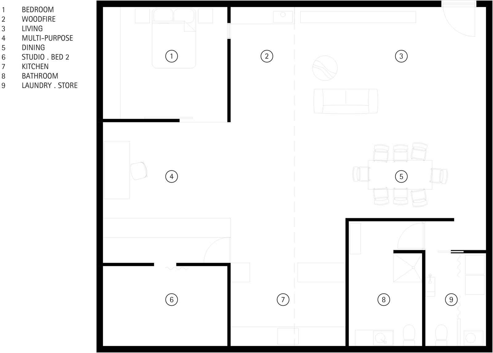 Centralnym założeniem było wykorzystanie własnych umiejętności, aby maksymalnie obniżyć koszty i stworzyć przestrzeń odpowiadającą ich stylowi życia. Otwarta hala została podzielona na dwie konstrukcje: sypialnię obitą sklejką klonową oraz czarne studio muzyczne. Ich uzupełnieniem stała się strefa dzienna z kuchnią, ręcznie wykonanym drewniano-stalowym stołem, piecem na drewno i klimatyzacją. Betonowe posadzki pomalowano na szaro dla uzyskania efektu polerowania, a modułowe ustawienie mebli pozwala dostosowywać układ wnętrza do pór roku. Projektantka podkreśla, że choć przestrzeń jest otwarta, potrzebne są wnęki, mniejsze zakamarki i funkcjonalne strefy – dlatego świadome kształtowanie form stało się fundamentem metamorfozy.