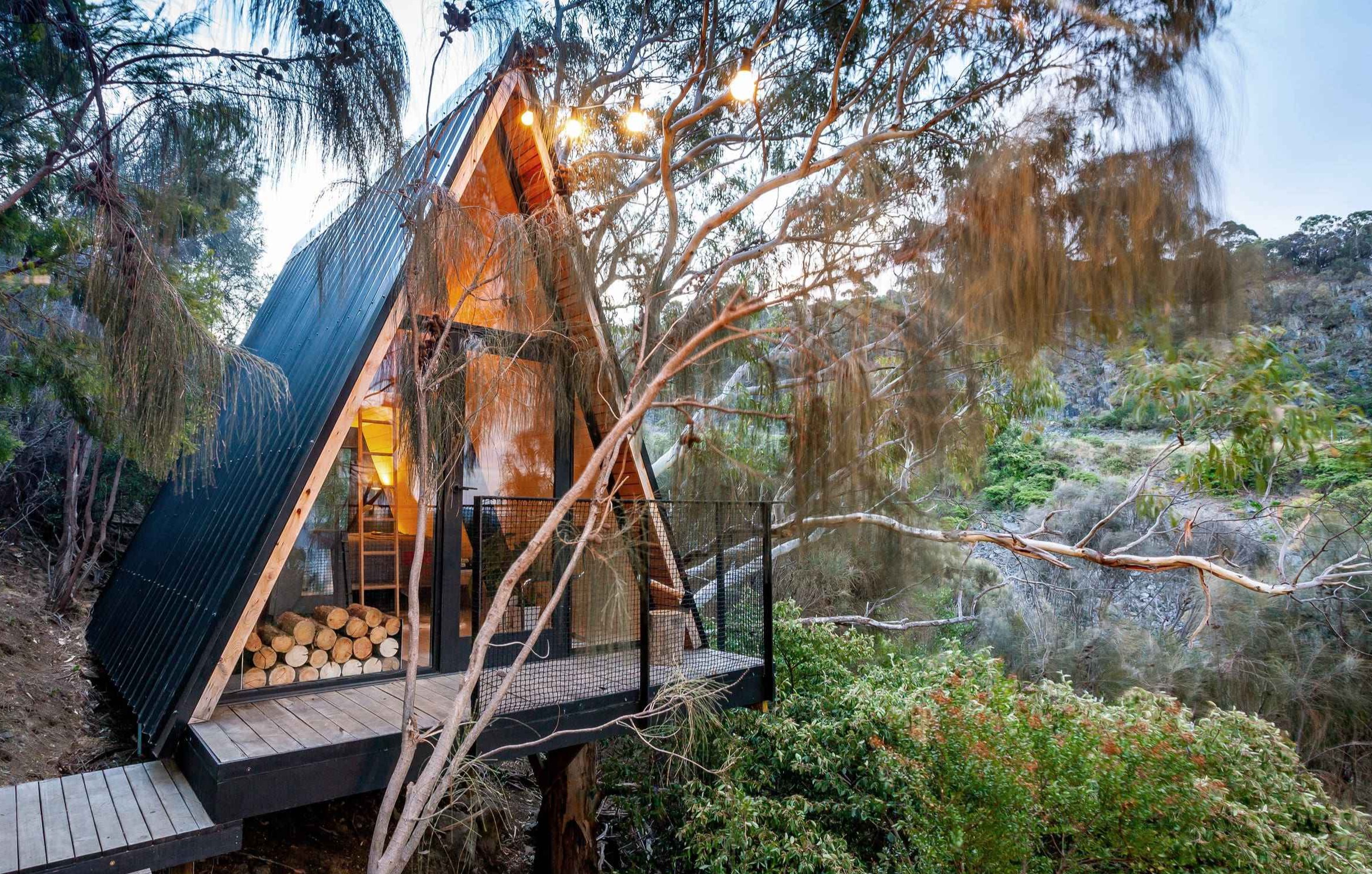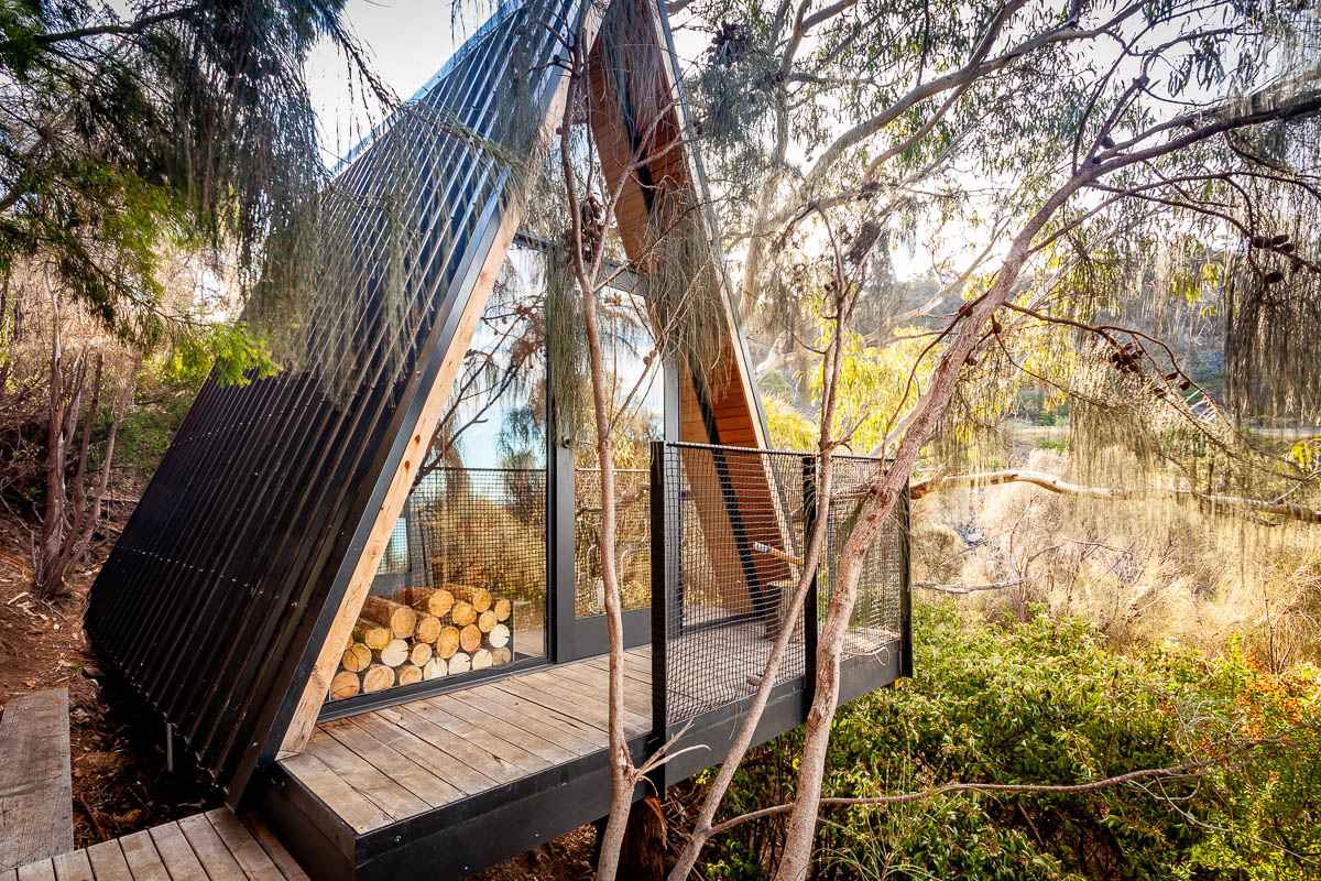 Treehouse nad rzeką Derwent to niezwykły domek na drzewie, stworzony jako tajna kryjówka dla dwóch chłopców i ich przyjaciół. Położony na malowniczym, stromym zboczu, konstrukcja wspiera się z jednej strony na naturalnym podłożu, a z drugiej – na potężnym eukaliptusie. Projekt zrealizowano z myślą o zrównoważonym budownictwie, wykorzystując w dużej mierze materiały pochodzące z recyklingu, w tym elementy z rozebranej wiaty. Efektem jest minimalistyczny i pomysłowy obiekt przypominający w swojej prostocie nowoczesną stodołę, w pełni zintegrowany z otaczającą przyrodą.