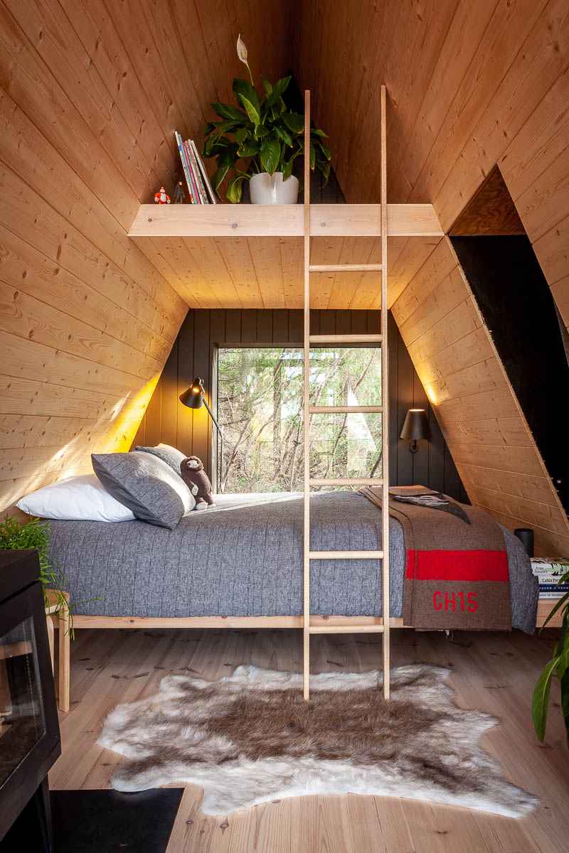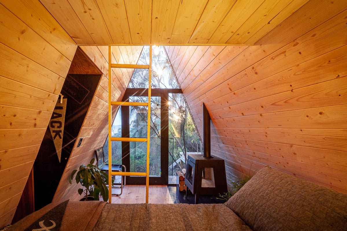 Wnętrze domku wyłożono drewnianymi panelami z sosny, które tworzą ciepłą i przytulną atmosferę. Znajduje się tu niewielkie miejsce do siedzenia oraz składana kanapa, która pozwala dostosować przestrzeń do różnych potrzeb. Na antresoli zorganizowano poddasze do spania, oferujące dodatkowe miejsce noclegowe. Treehouse to przykład, jak z prostych materiałów można stworzyć inspirującą przestrzeń – połączenie natury, kreatywności i ducha przygody w duchu nowoczesnej architektury.