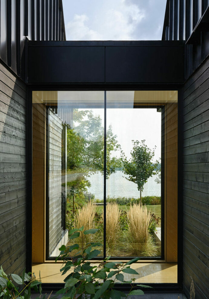 To, co wyróżnia Triptych House, to przeszklone łączniki między bryłami, które jednocześnie dzielą i łączą przestrzeń. Te „przerywniki” budują narrację architektoniczną, tworząc płynne przejścia pomiędzy strefami funkcjonalnymi, a zarazem umożliwiają panoramiczne widoki na jezioro i otaczającą przyrodę.