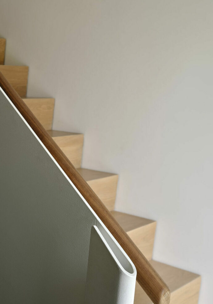 Zaraz po wejściu do domu uwagę przykuwa minimalistyczna klatka schodowa – z białą stalową balustradą i dębowymi stopniami. To nie tylko funkcjonalny element, ale też rzeźbiarska forma organizująca przestrzeń parteru i kadrująca widok na jezioro. Taki zabieg wprowadza do wnętrza spokój i lekkość.