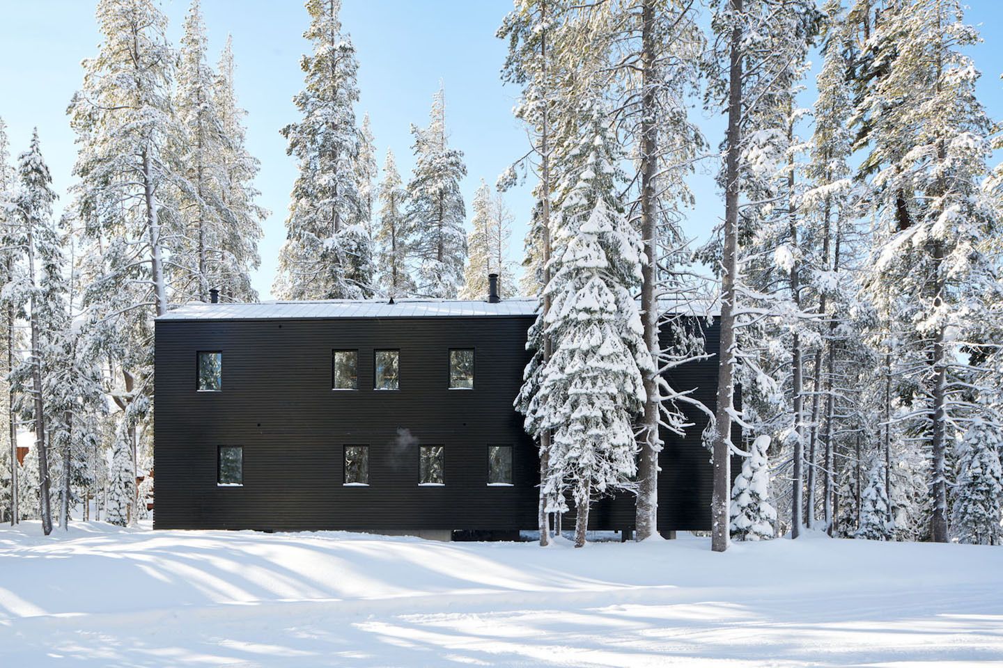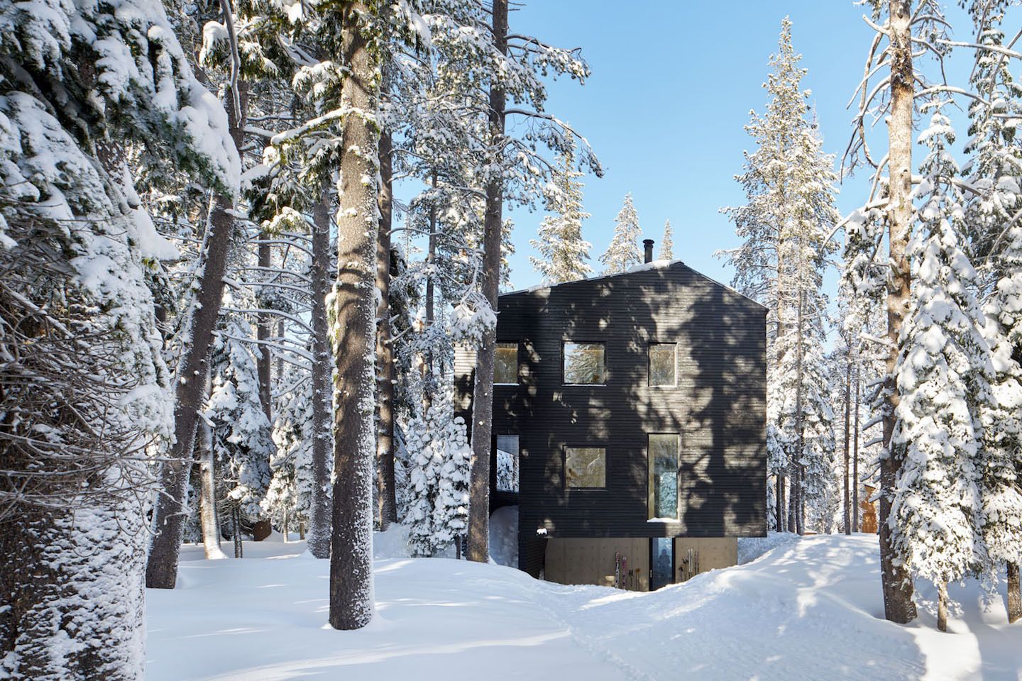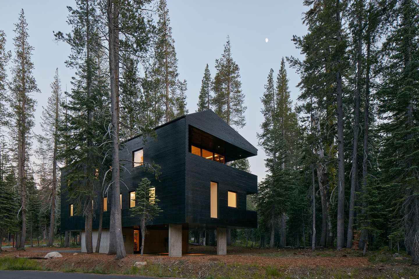 Elewacja to opalana deska, która pasuje do swego leśnego otoczenia. Po zmierzchu wnętrze wykończone w dużym stopniu jasnym drewnem rzuca przez okna ciepły blask na pobliskie drzewa.