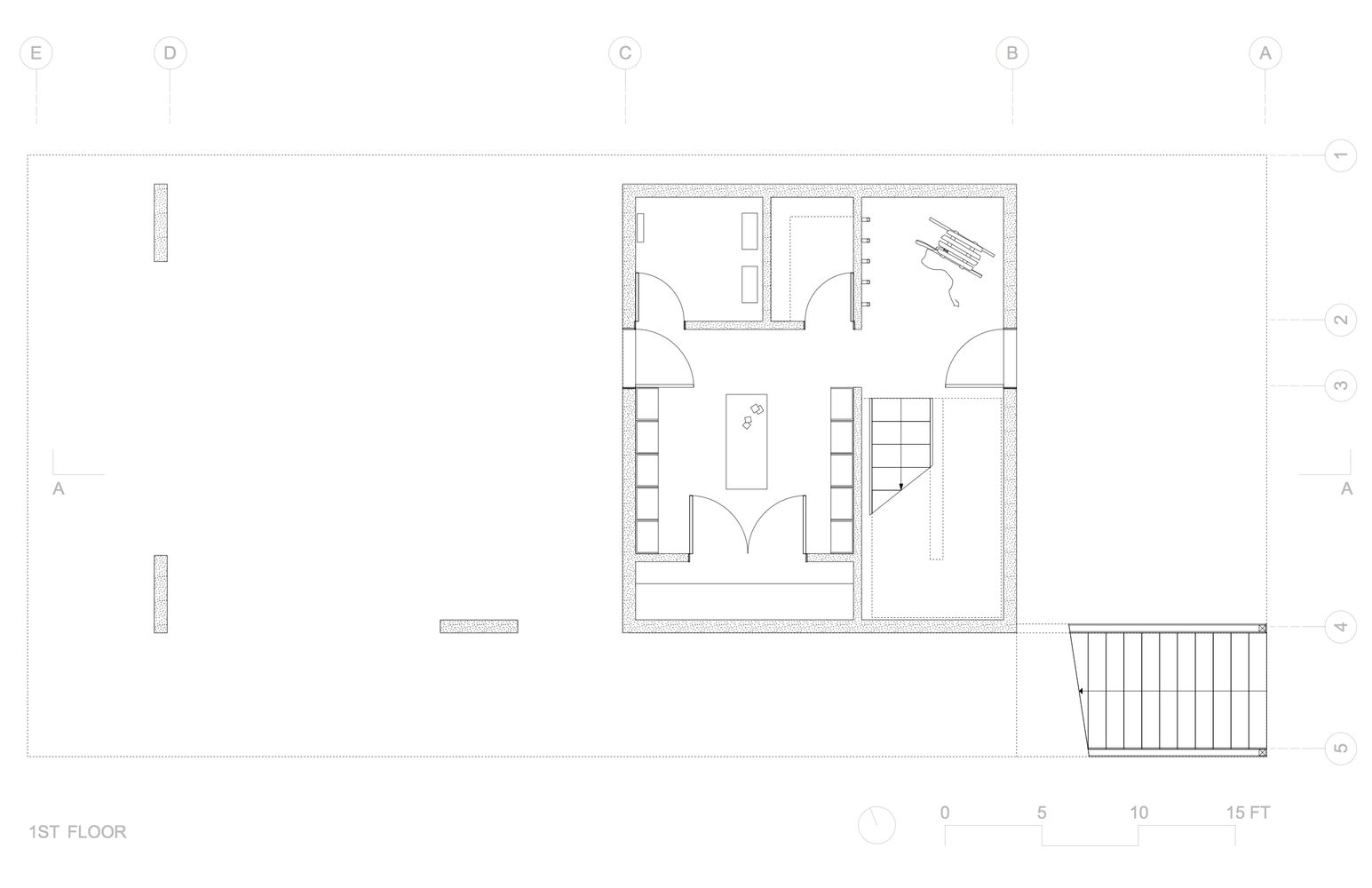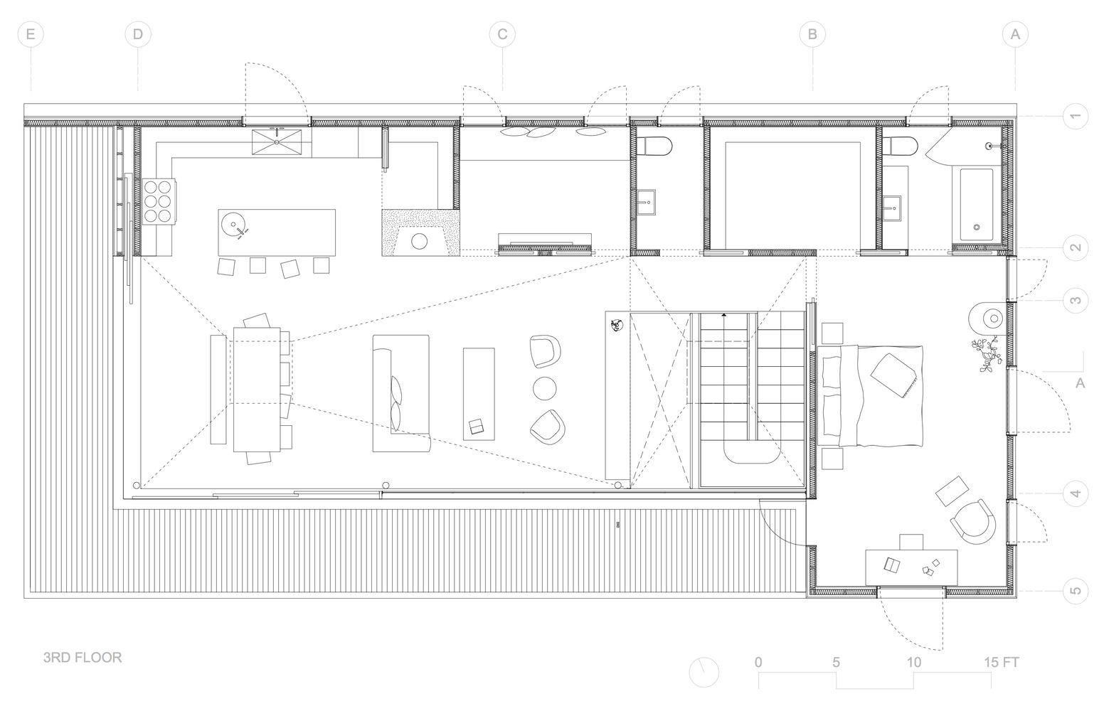 Przestrzenie dzienne zostały zorganizowane wzdłuż otwartej, południowej fasady, aby wnętrza miały jak najwięcej naturalnego światła. Bardziej zacieniona strona północna zawiera pomieszczenia użytkowe, gdzie małe okna zapobiegają niepotrzebnej utracie ciepła.