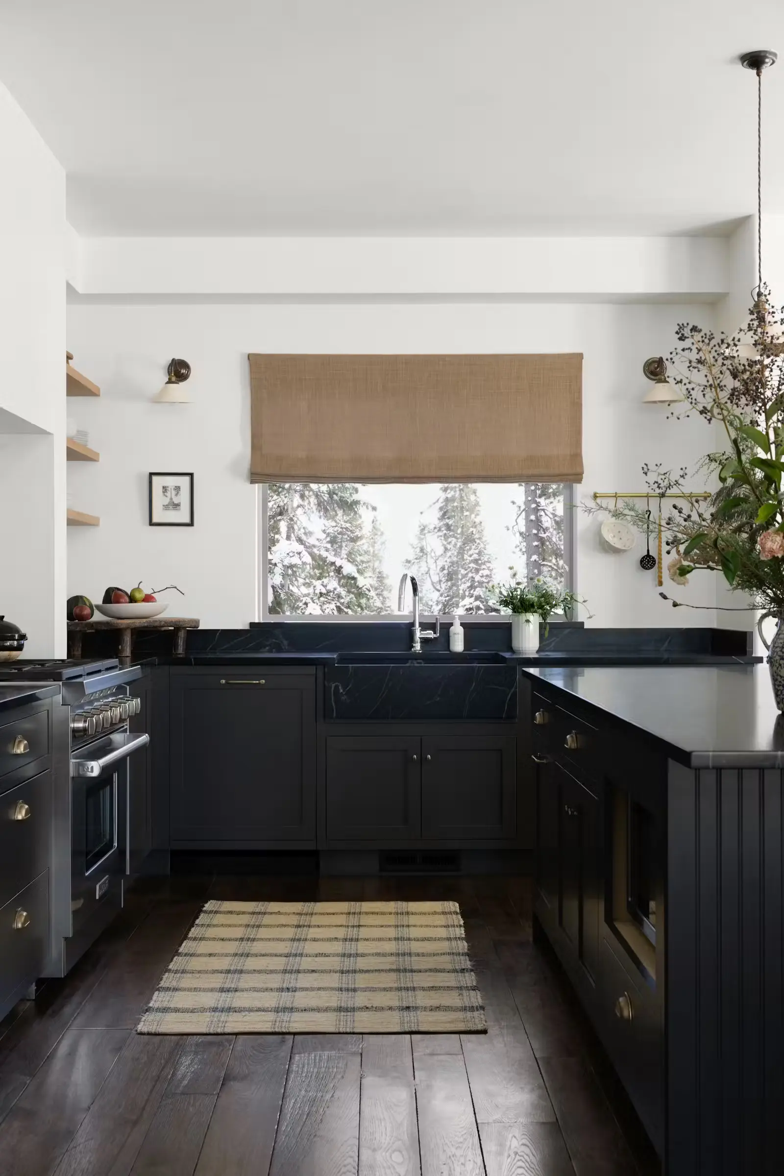 Oryginalna nieruchomość miała szerokie, kątowe okna i część dzienną otwartą na drugi poziom powyżej. W kącie stał kamienny kominek, a kuchnia była wciśnięta w kąt. Mattingly zaproponowała pomalowanie prawie każdej ściany białą farbą, a następnie spoinowanie kamienia kominkowego w pasującym odcieniu, aby rozjaśnić pomieszczenie. Zamknęli drzwi prowadzące z kuchni, tworząc dłuższą ścianę na urządzenia i miejsce do przechowywania. Seria koncentruje się wokół tej nowej ściany, z ciemnymi szafkami i blatami oraz prostym tyłem z białych płytek.