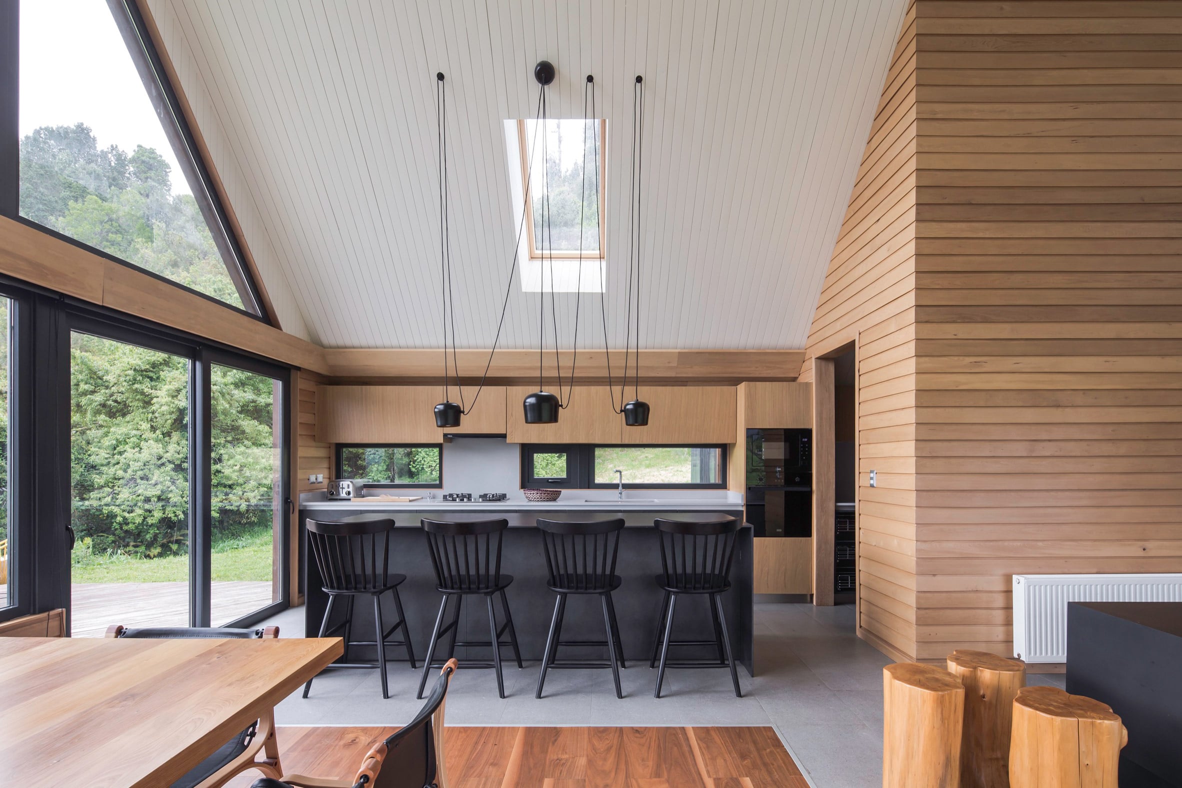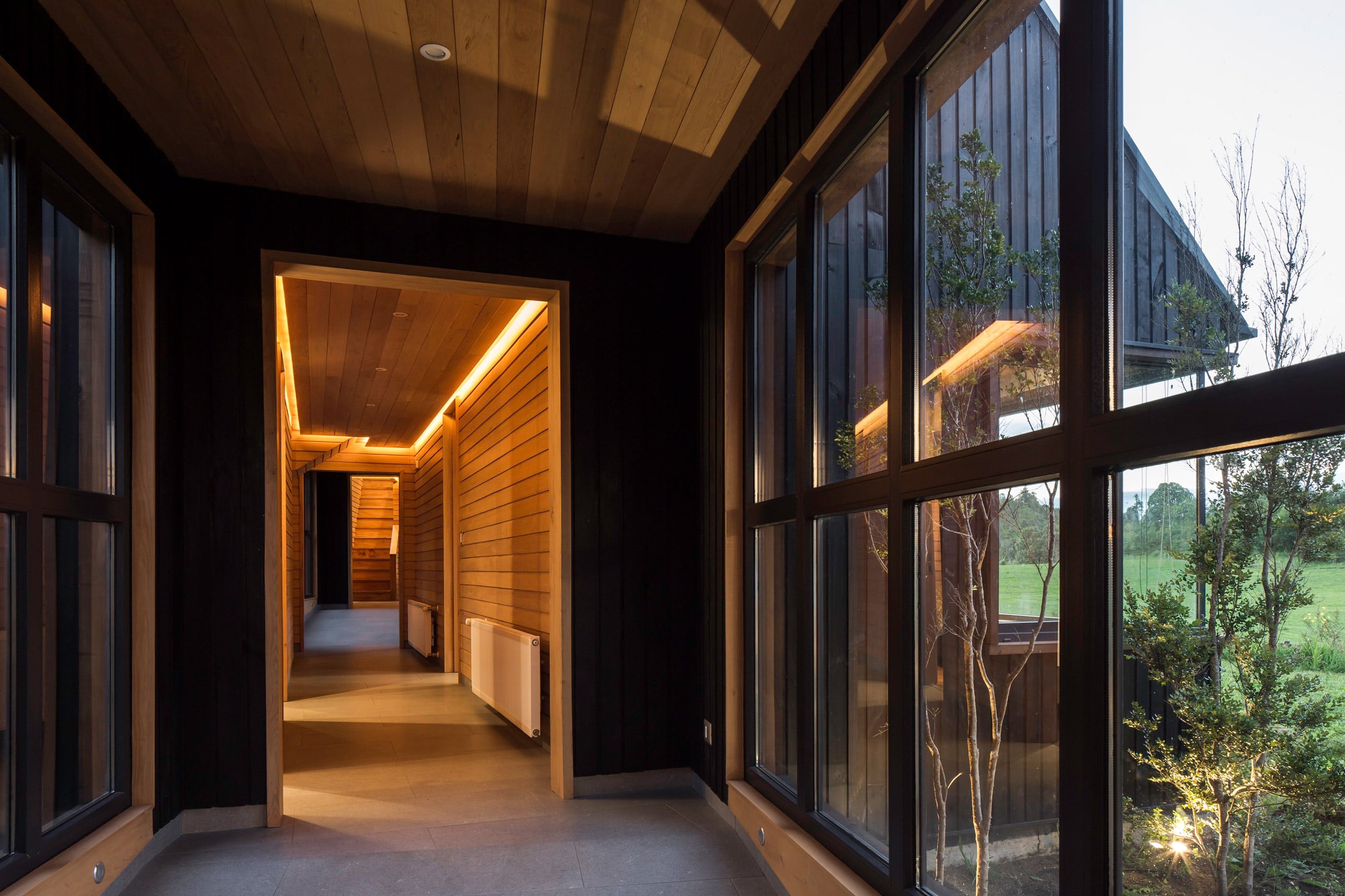 Inspiracją do stworzenia projektu była forma nowoczesnej stodoły, popularna w okolicy i nawiązująca do lokalnej tradycji architektonicznej. Konstrukcja składa się z trzech segmentów, z których dwa mają piętro przeznaczone na sypialnie, a trzeci to strefa dzienna o podwójnej wysokości z otwartą kuchnią, jadalnią i salonem. Przeszklony świetlikumieszczony nad częścią dzienną wpuszcza mnóstwo naturalnego światła, a katedralny sufit wyłożony malowanymi drewnianymi deskami dodaje przestronności wnętrzu.