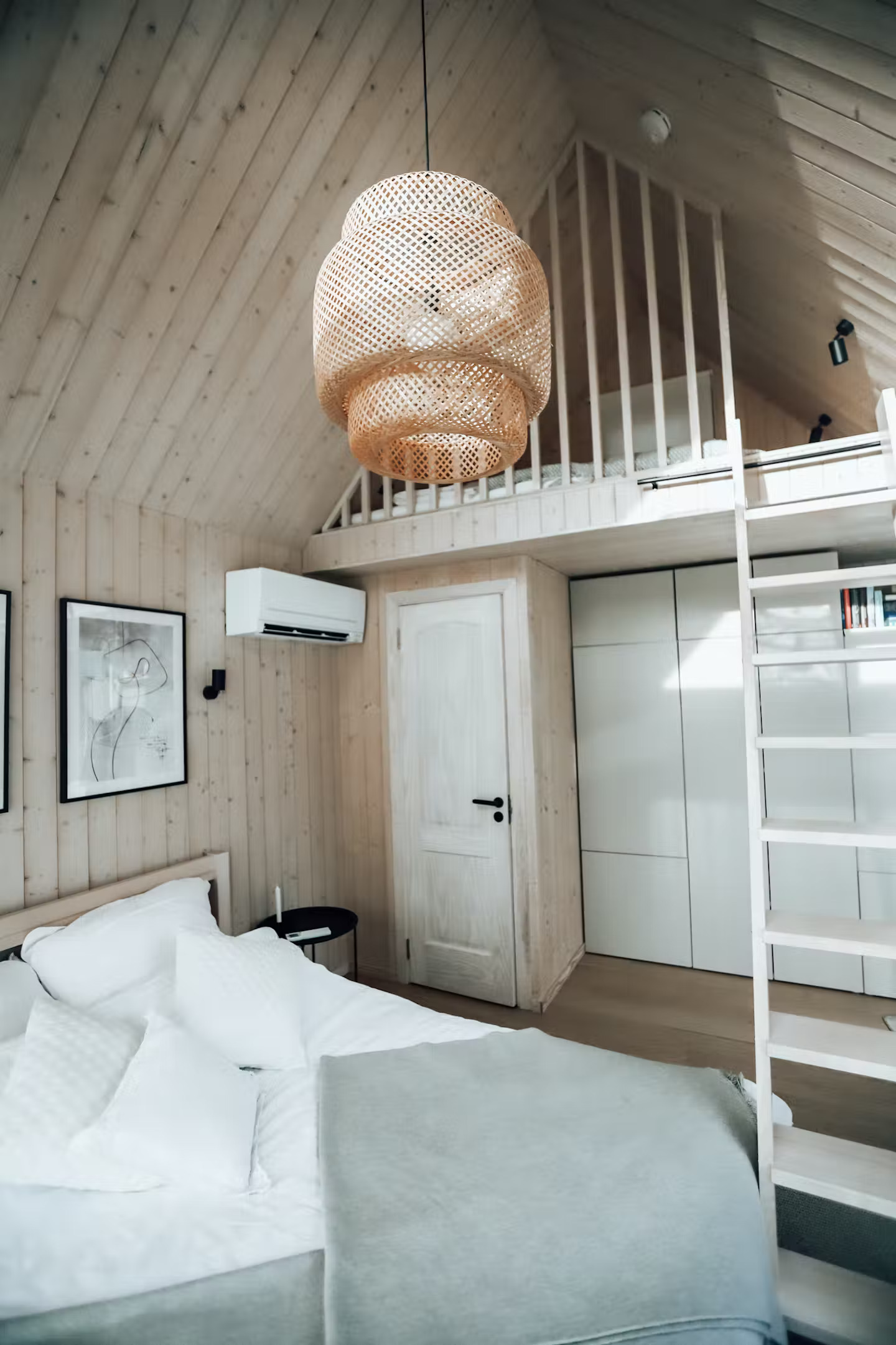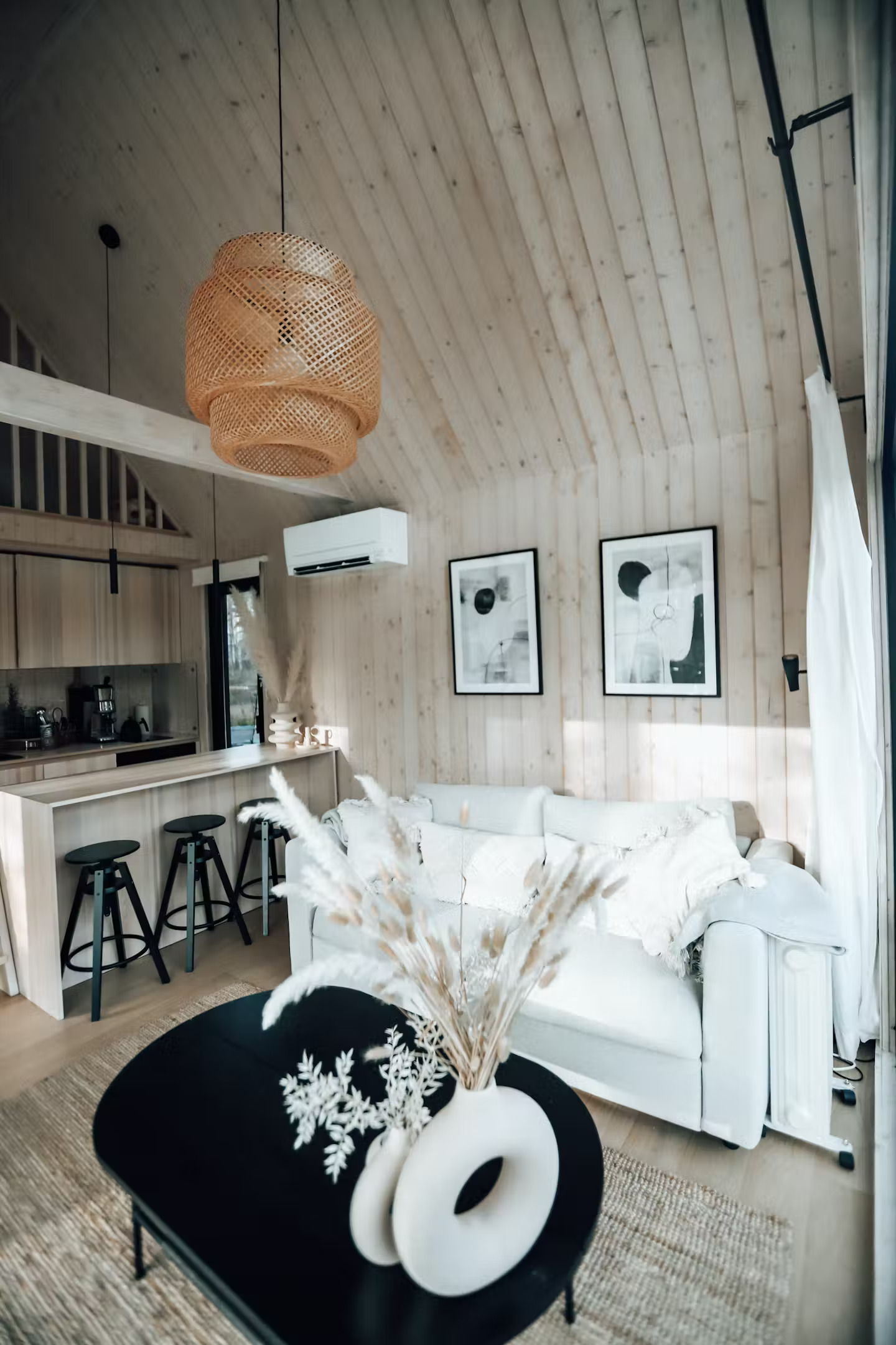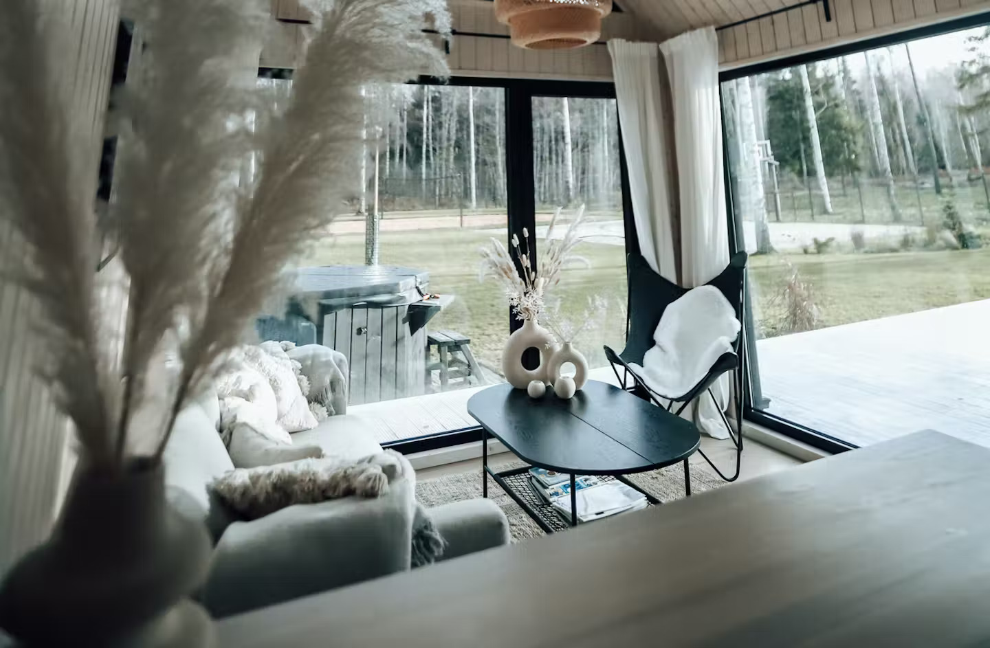 Firma My Cabin od 2019 roku projektuje i realizuje małe domy prefabrykowane, które łączą minimalizm, energooszczędność i komfort. W ofercie znalazły się takie modele jak My Milla, My Kalmus i My Galia, które razem tworzą spójny, funkcjonalny kompleks. Dla Gunarsa – muzyka orkiestrowego – istotne było również znalezienie przestrzeni dla kontrabasu, a dla dzieci – bezpiecznej przestrzeni do zabawy. Rozwiązania proponowane przez My Cabin okazały się idealne: kompaktowe, praktyczne i możliwe do postawienia bez potrzeby stałego nadzoru nad budową.