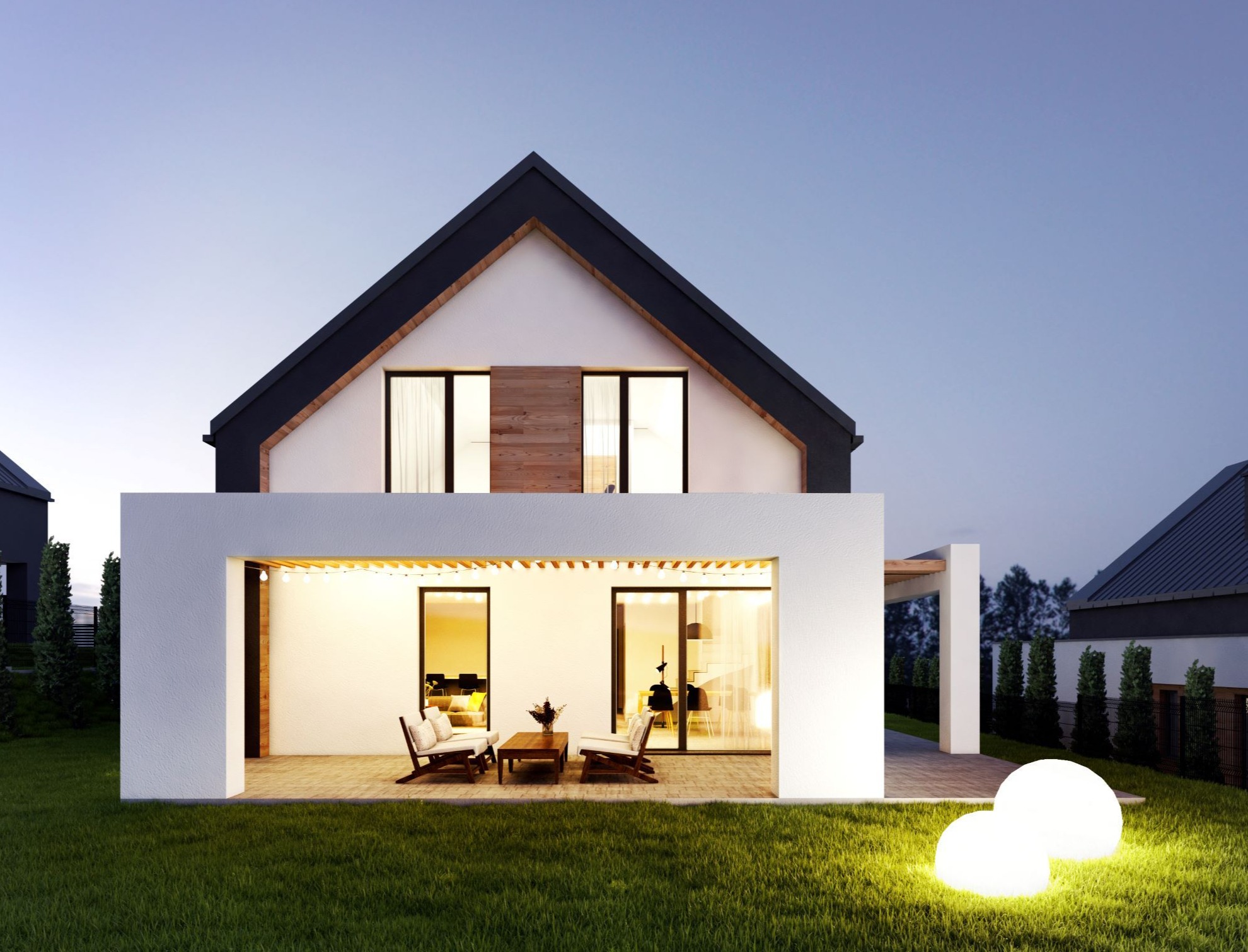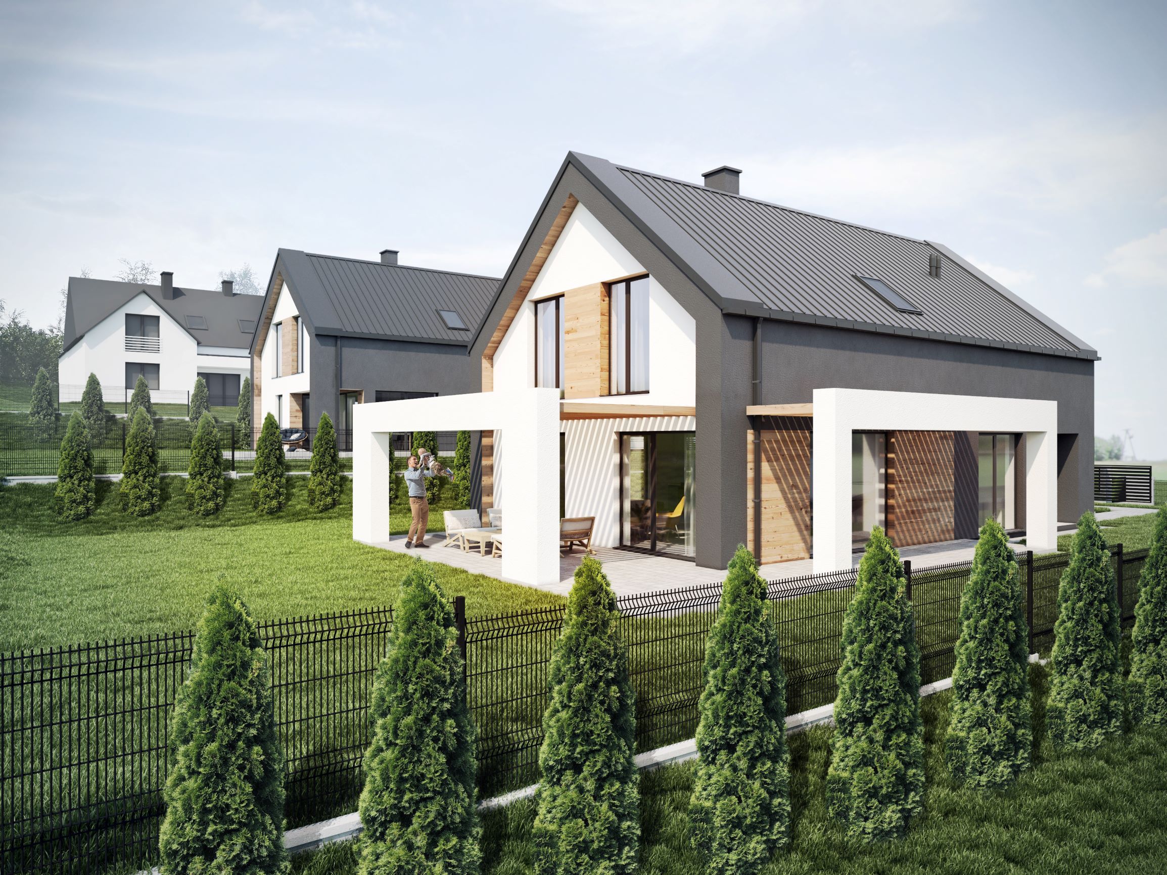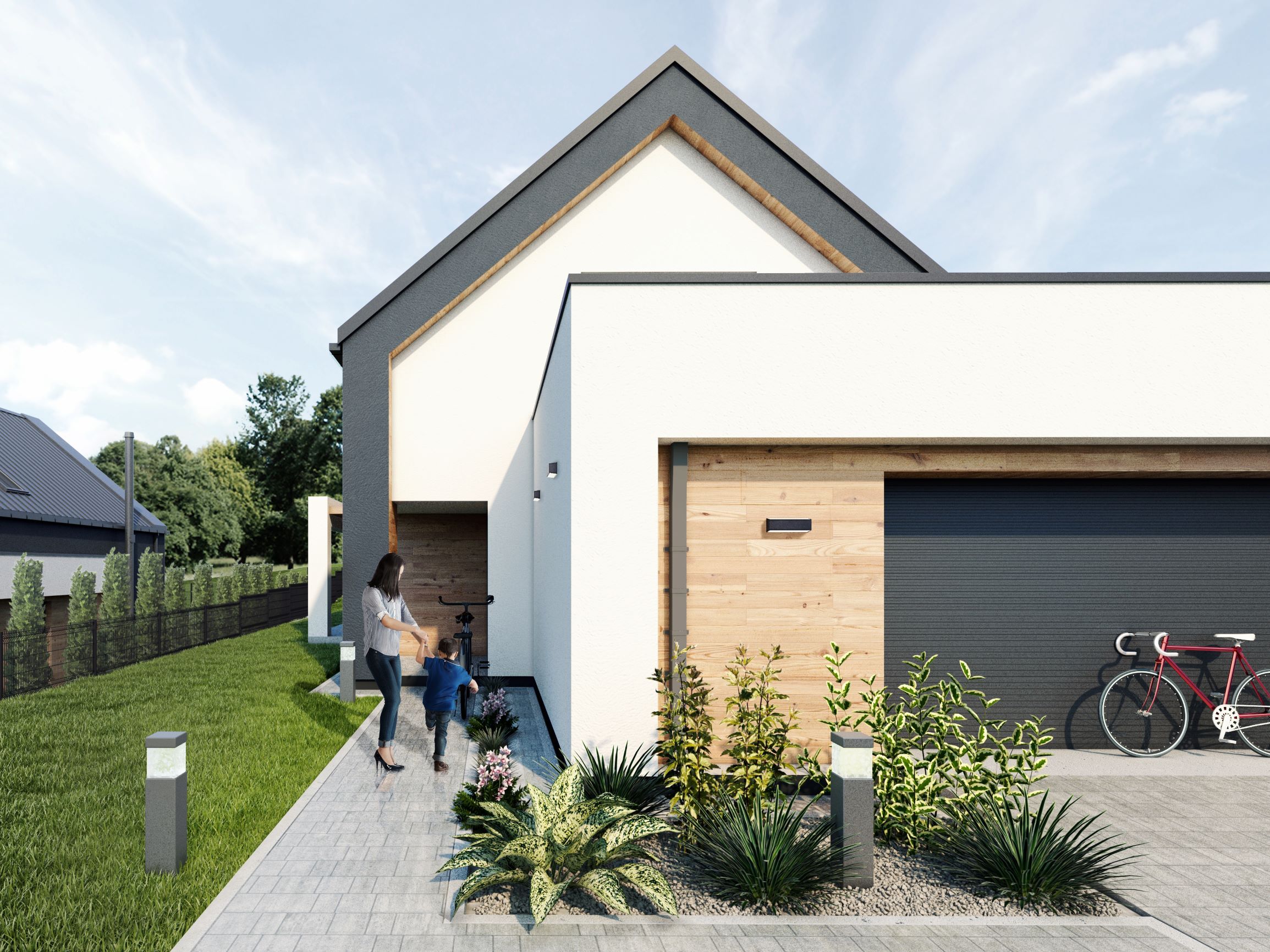 Elewacja nowoczesnej stodoły została wykonana z dwóch rodzajów drewna, które w harmonijny sposób podkreślają bryłę budynku. Główna część mieszkalna została obita czarnymi, opalanymi deskami, z zaznaczeniem wnęki tarasu poprzez zastosowanie naturalnego drewna. Ta sama deska w naturalnym wybarwieniu pojawia się również na parterowej części budynku. Połączenie prostoty formy z efektownym detalem drewnianym sprawia, że dom harmonijnie wpisuje się w otaczający krajobraz Kampinoskiego Parku Narodowego.