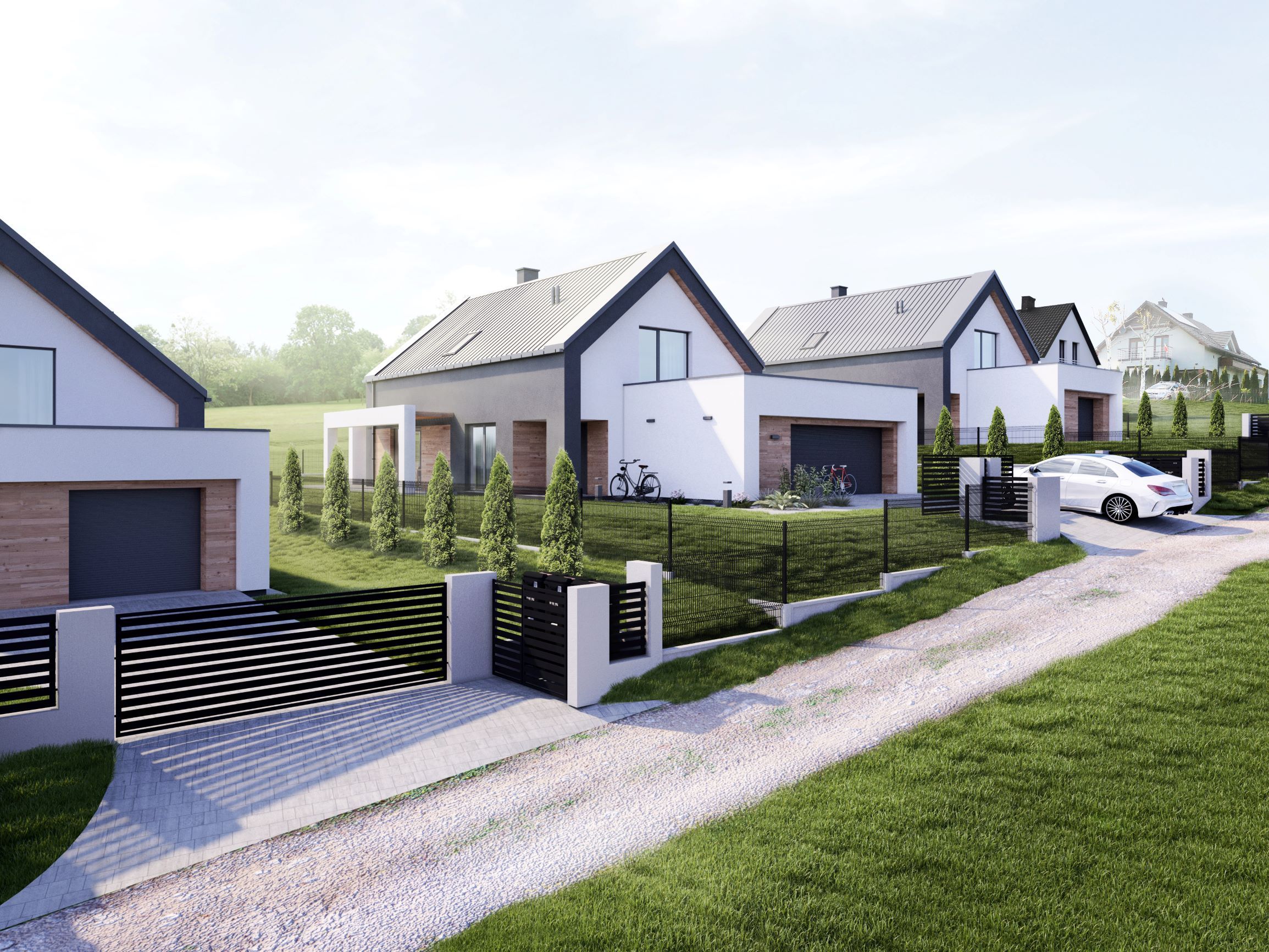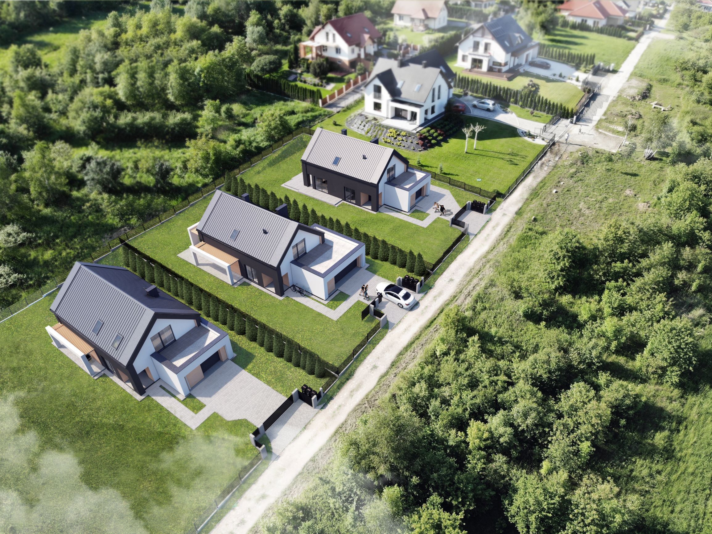 Projekt nowoczesnej stodoły o powierzchni użytkowej 180 m² powstał w sąsiedztwie Kampinoskiego Parku Narodowego. Budynek składa się z dwóch brył – dwukondygnacyjnej z poddaszem użytkowym krytej dachem dwuspadowym oraz parterowej z płaskim dachem, pełniącej funkcję garażu. Naturalny spadek terenu i podmokłe partie działki, a także widok na park narodowy, zainspirowały architektów do stworzenia nadwieszonego tarasu oraz lekkiej komunikacji po działce w formie drewnianych platform.