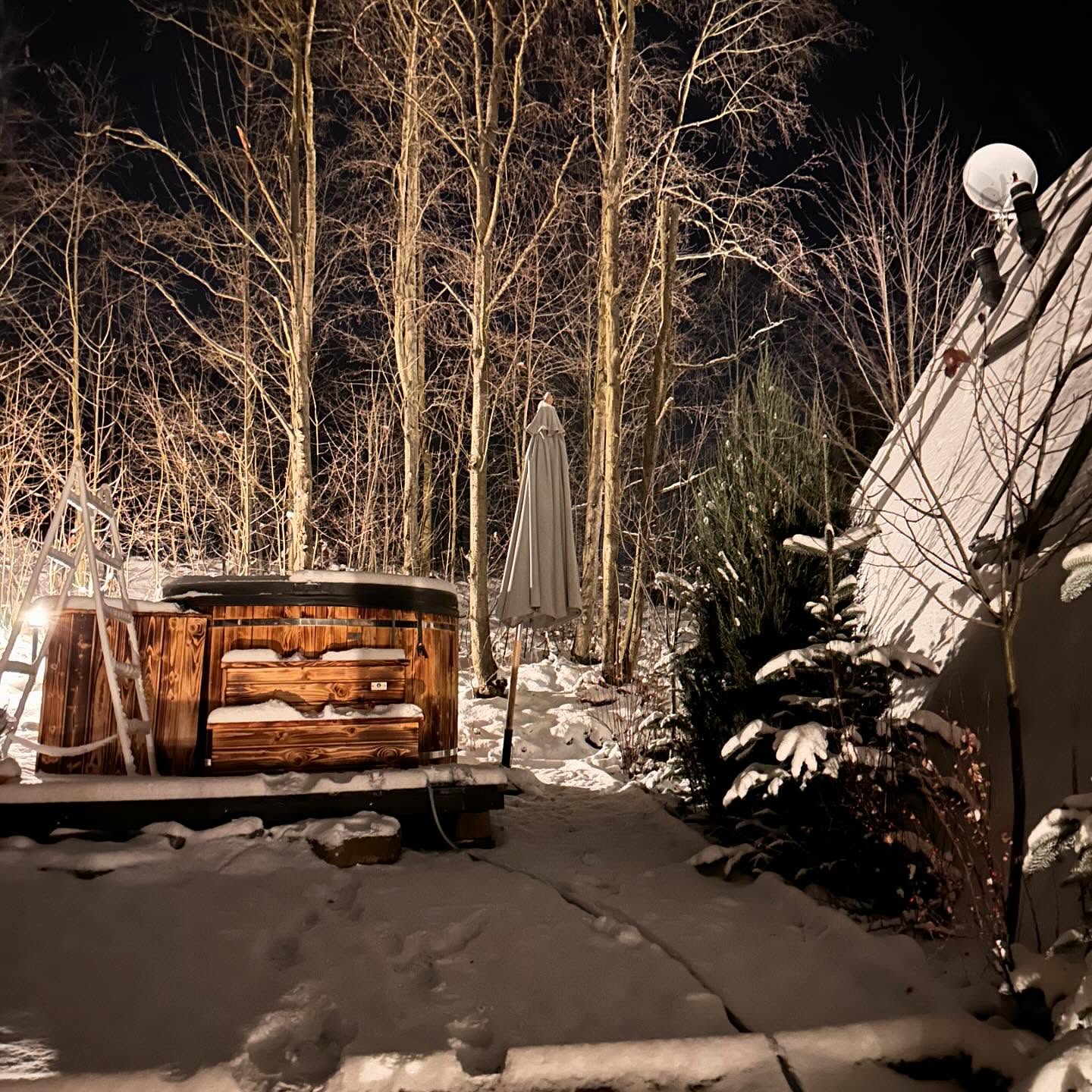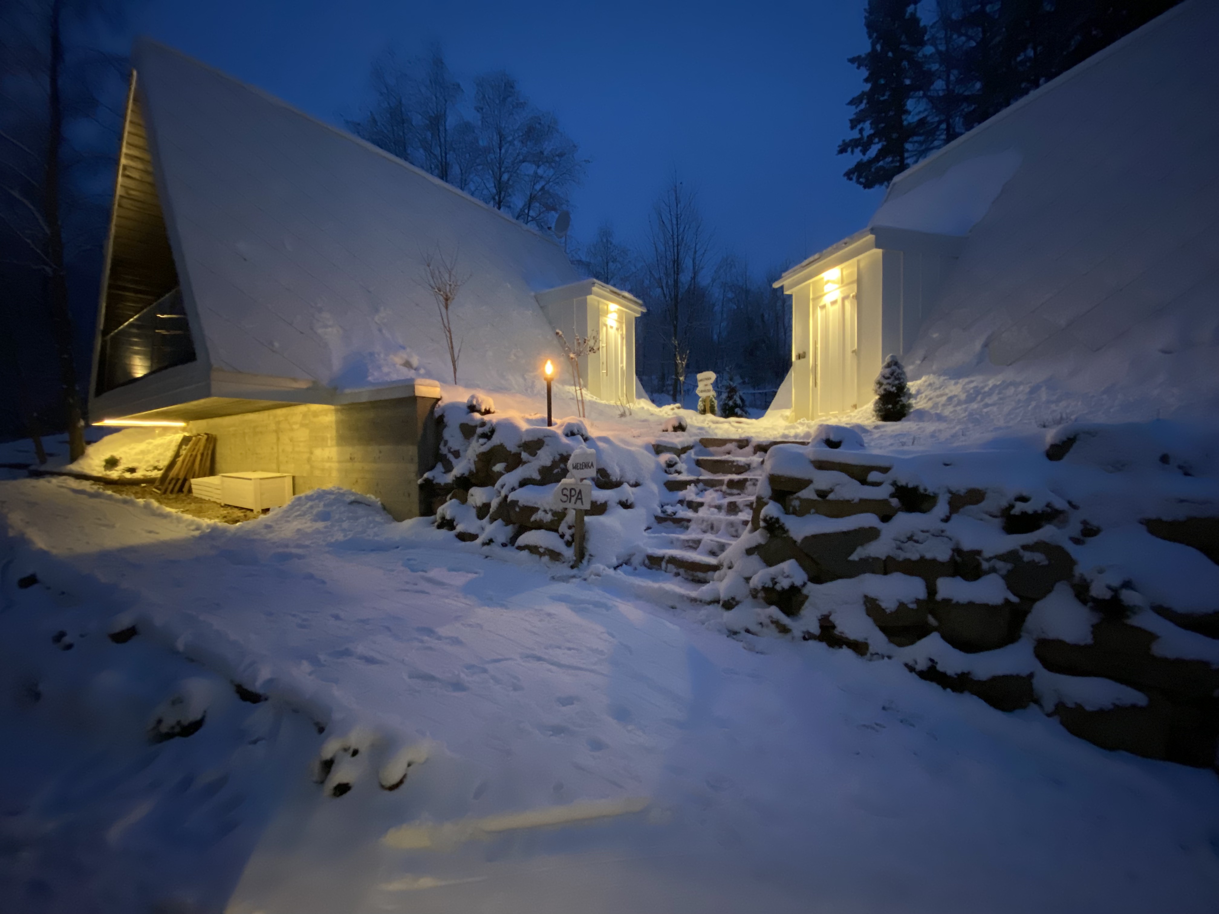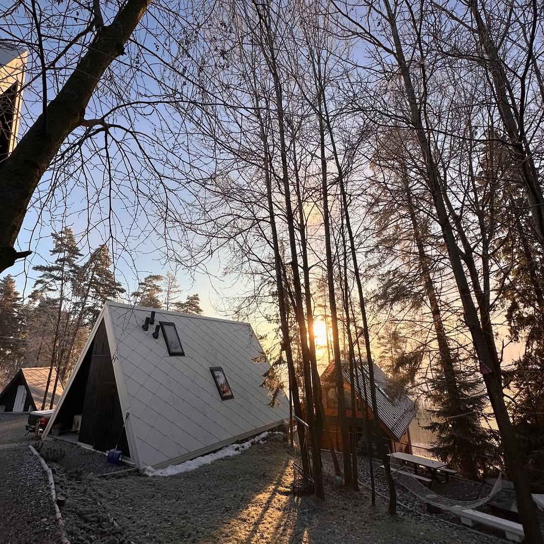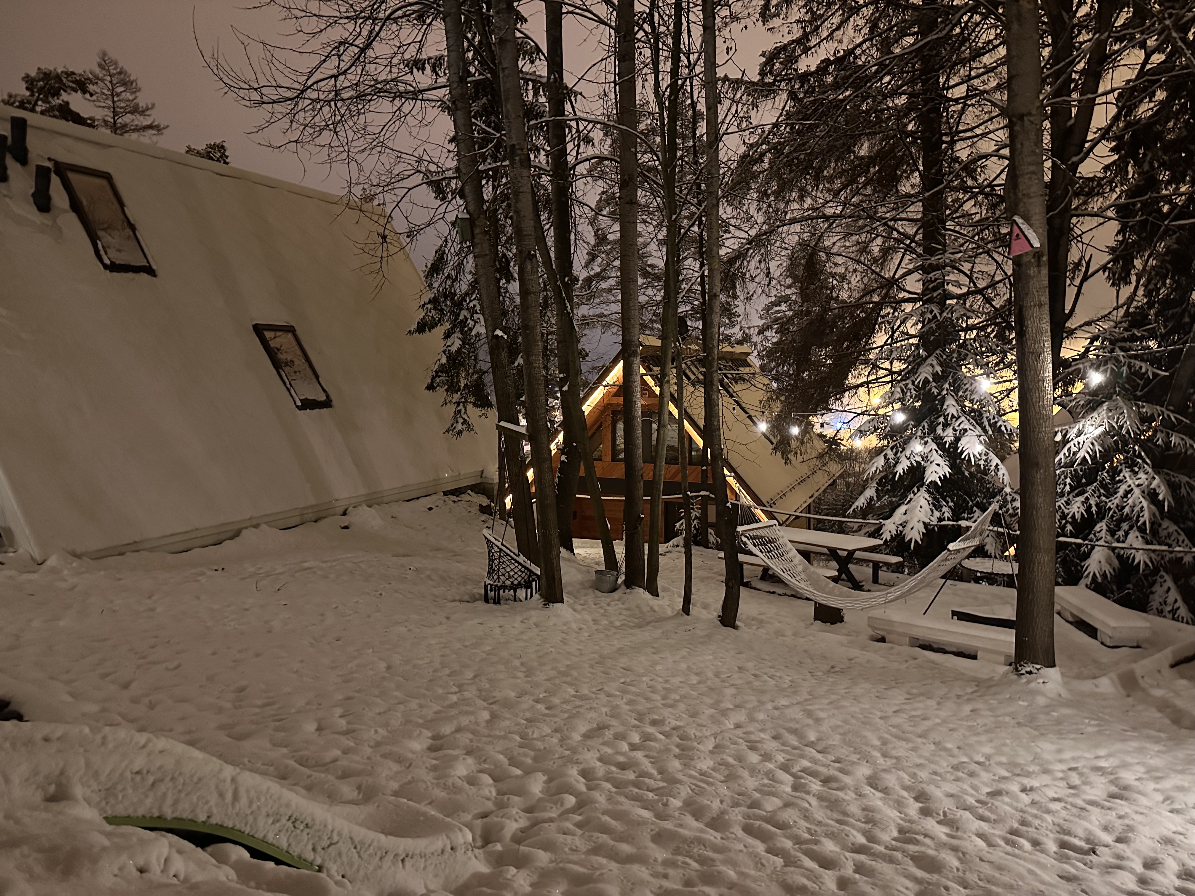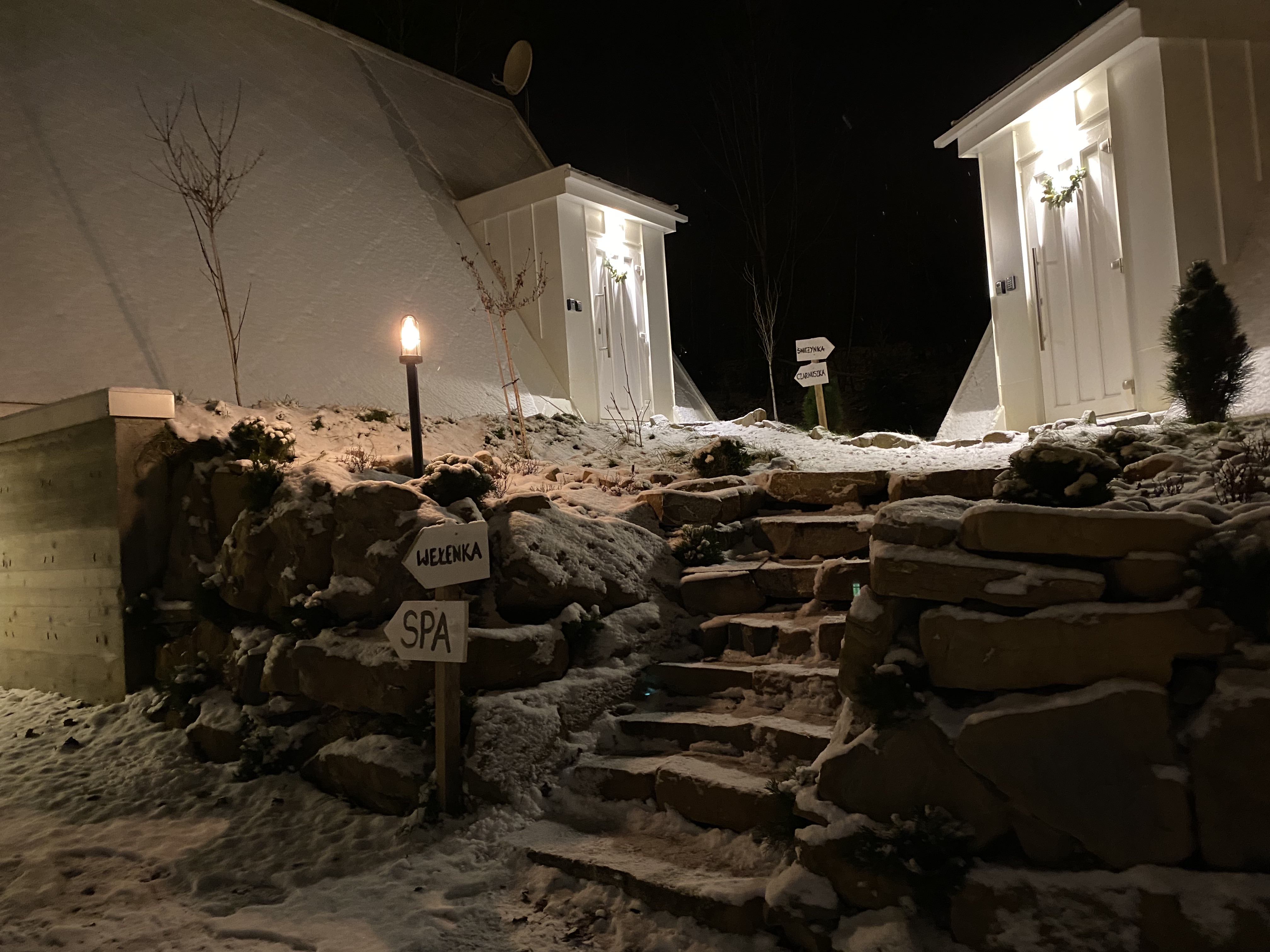 Domki o nazwach Wełenka, Śnieżynka i Czarnuszka wyróżniają się nie tylko swoim nowoczesnym wyglądem, ale i funkcjonalnym wnętrzem. Przeszklone ściany, antresole z widokiem na ośnieżone drzewa oraz naturalne materiały tworzyą ciepłą i komfortową atmosferę. Każdy z domków posiada w pełni wyposażoną kuchnię, przytulne miejsca do odpoczynku i klimatyczne oświetlenie, które podkreśla zimowy charakter tego miejsca.
