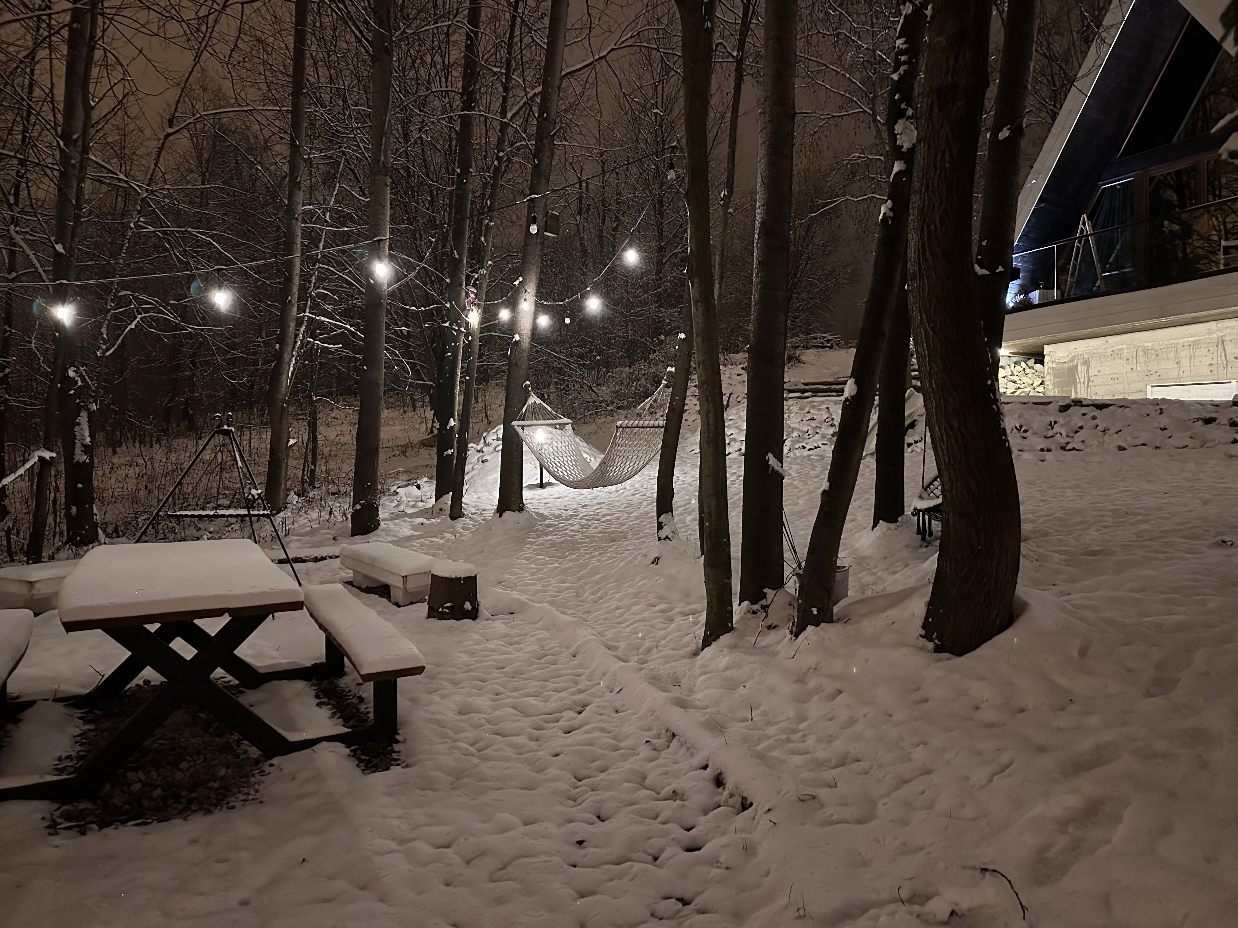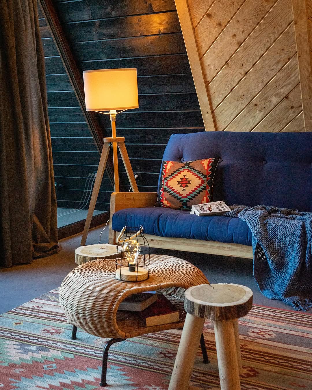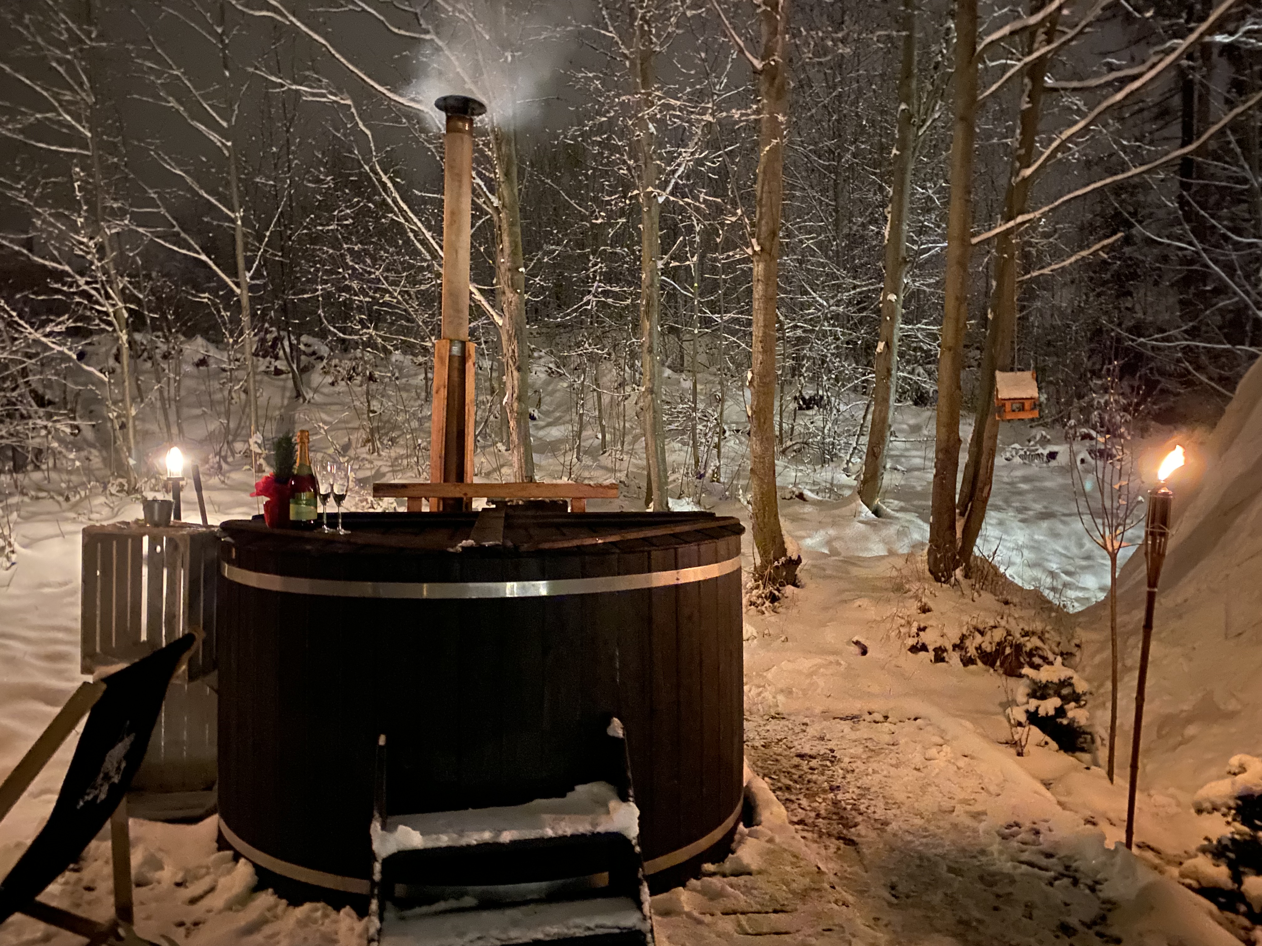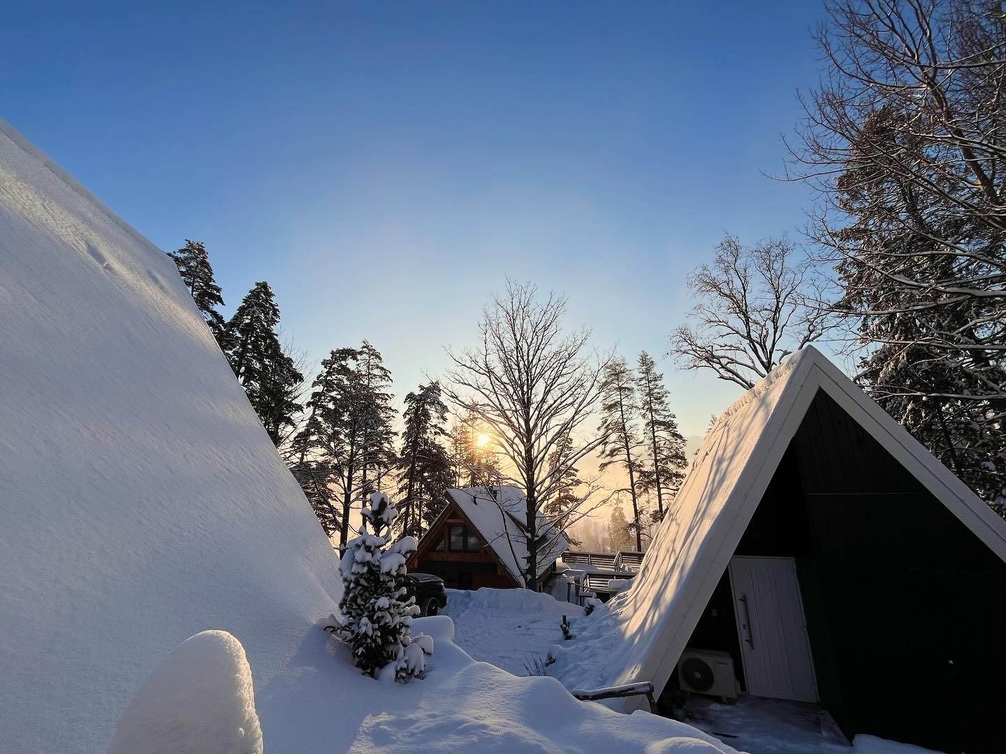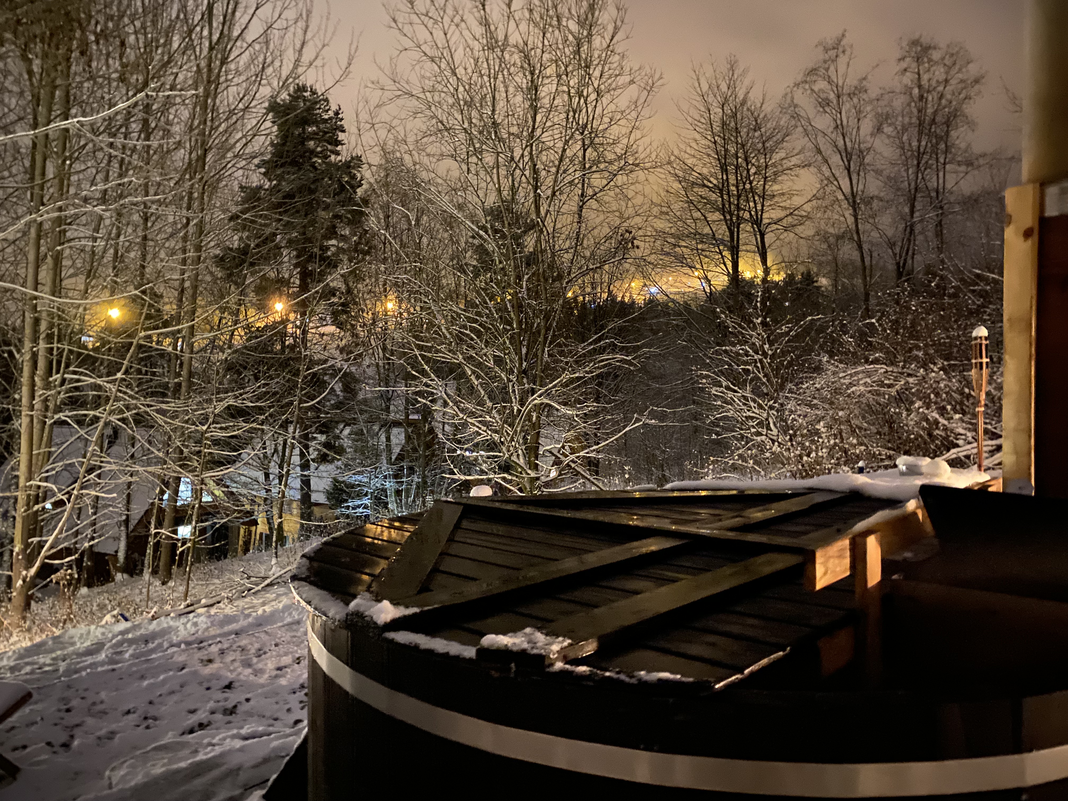 Domki o nazwach Wełenka, Śnieżynka i Czarnuszka wyróżniają się nie tylko swoim nowoczesnym wyglądem, ale i funkcjonalnym wnętrzem. Przeszklone ściany, antresole z widokiem na ośnieżone drzewa oraz naturalne materiały tworzyą ciepłą i komfortową atmosferę. Każdy z domków posiada w pełni wyposażoną kuchnię, przytulne miejsca do odpoczynku i klimatyczne oświetlenie, które podkreśla zimowy charakter tego miejsca.