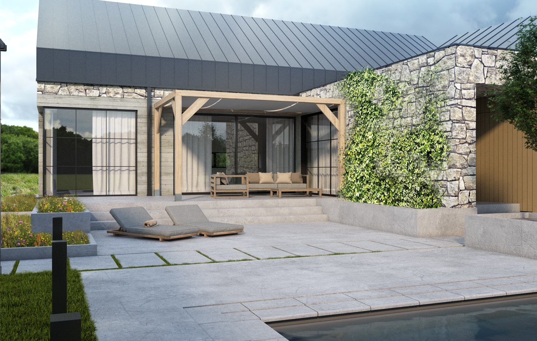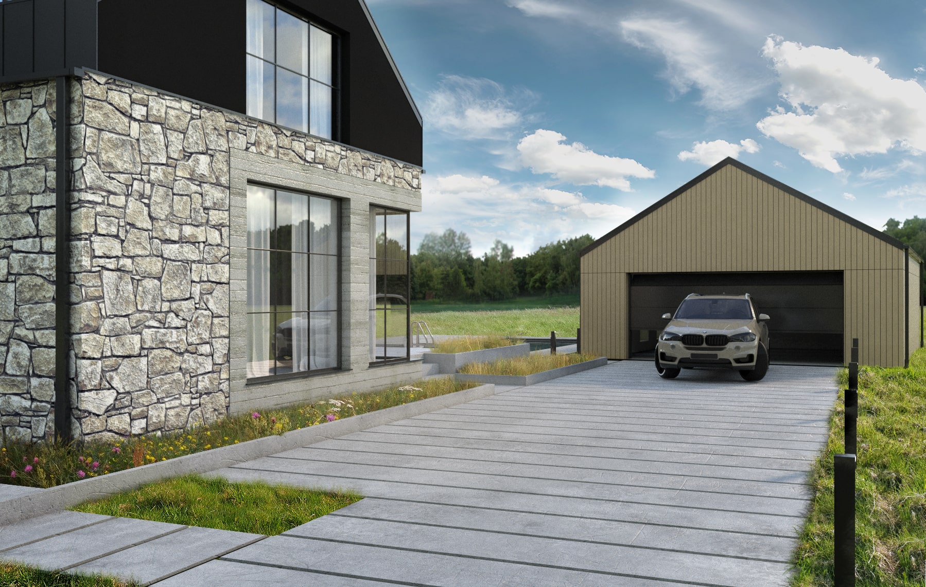 Choć forma brył pozostaje nowoczesna, zastosowane materiały, detale i sposób kształtowania przestrzeni wprowadzają wyraźne odniesienia do architektury wiejskiej i podmiejskiej. Kamień, drewno, okna ze szprosami, bluszcz porastający elewacje, drewniane zadaszenia tarasów z tkaninami, ogródek warzywny przy kuchni i monumentalny podjazd budują atmosferę stylu country i cottage. Jednocześnie brak okapów, prosta geometria i konsekwentna kolorystyka zakorzeniają projekt we współczesności.
