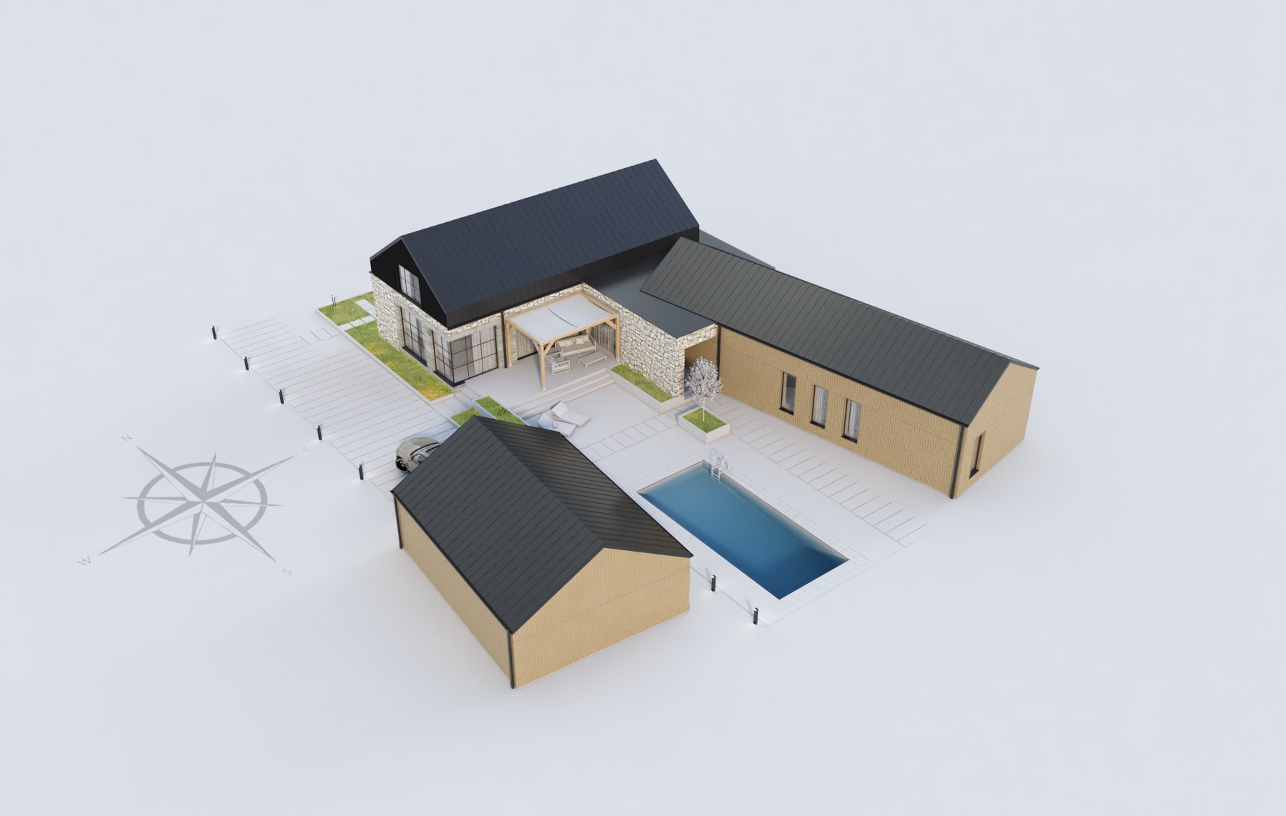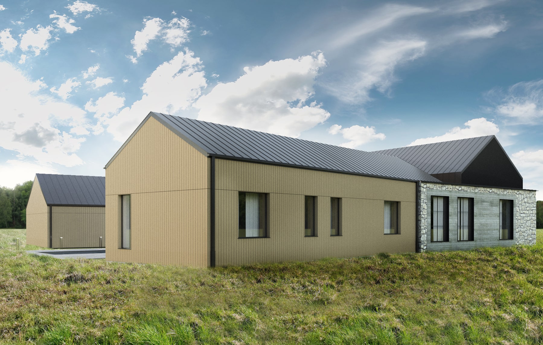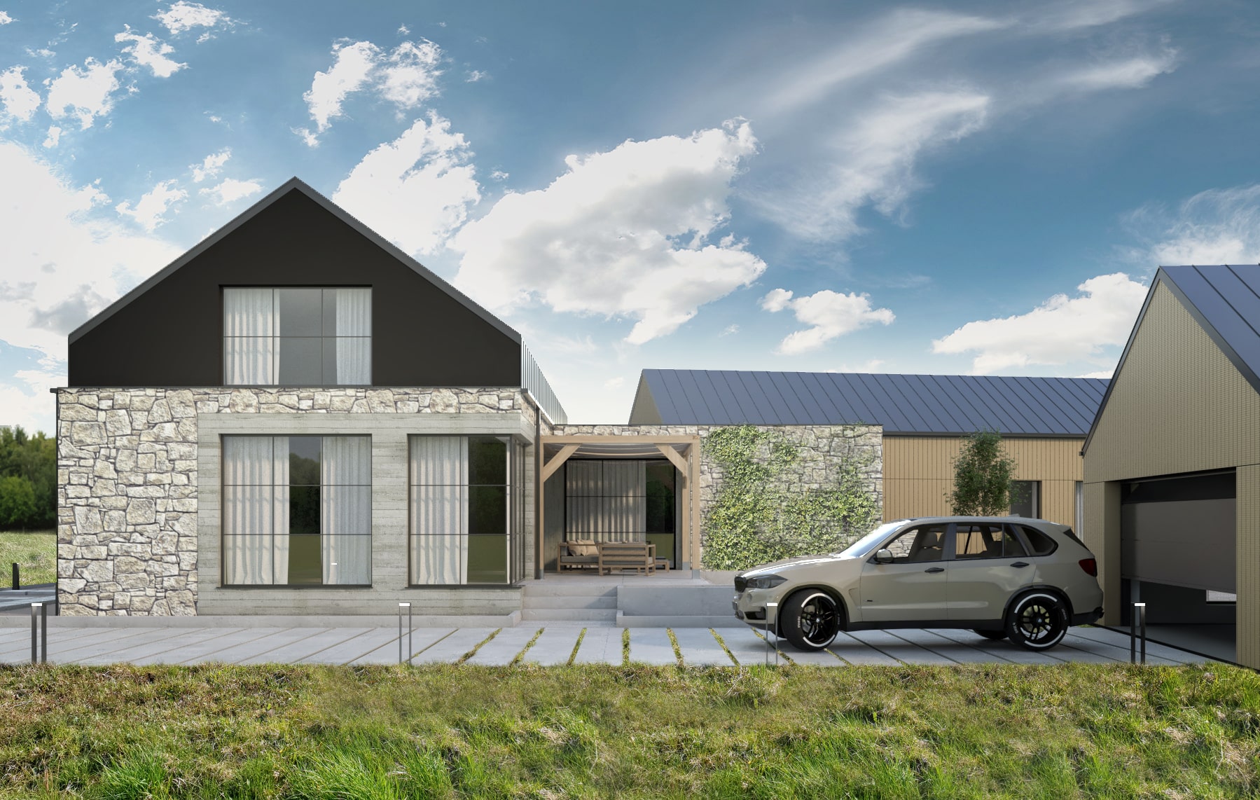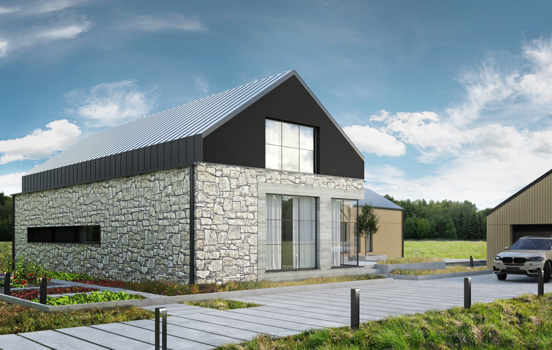 Projekt domu jednorodzinnego zlokalizowanego w okolicach Łódź powstał w odpowiedzi na nietypowe wytyczne inwestorów oraz wyjątkowy charakter działki. Zakrzewiony teren, położony w sąsiedztwie gęstego lasu i z wjazdem od północy, stał się punktem wyjścia do stworzenia kameralnego zespołu trzech budynków, zaprojektowanych jako współczesna interpretacja nowoczesnej stodoły. Ideą było rozdzielenie funkcji na trzy niezależne bryły: dzienną, nocną oraz gospodarczą, a jednocześnie powiązanie ich w spójną, przemyślaną kompozycję przestrzenną.