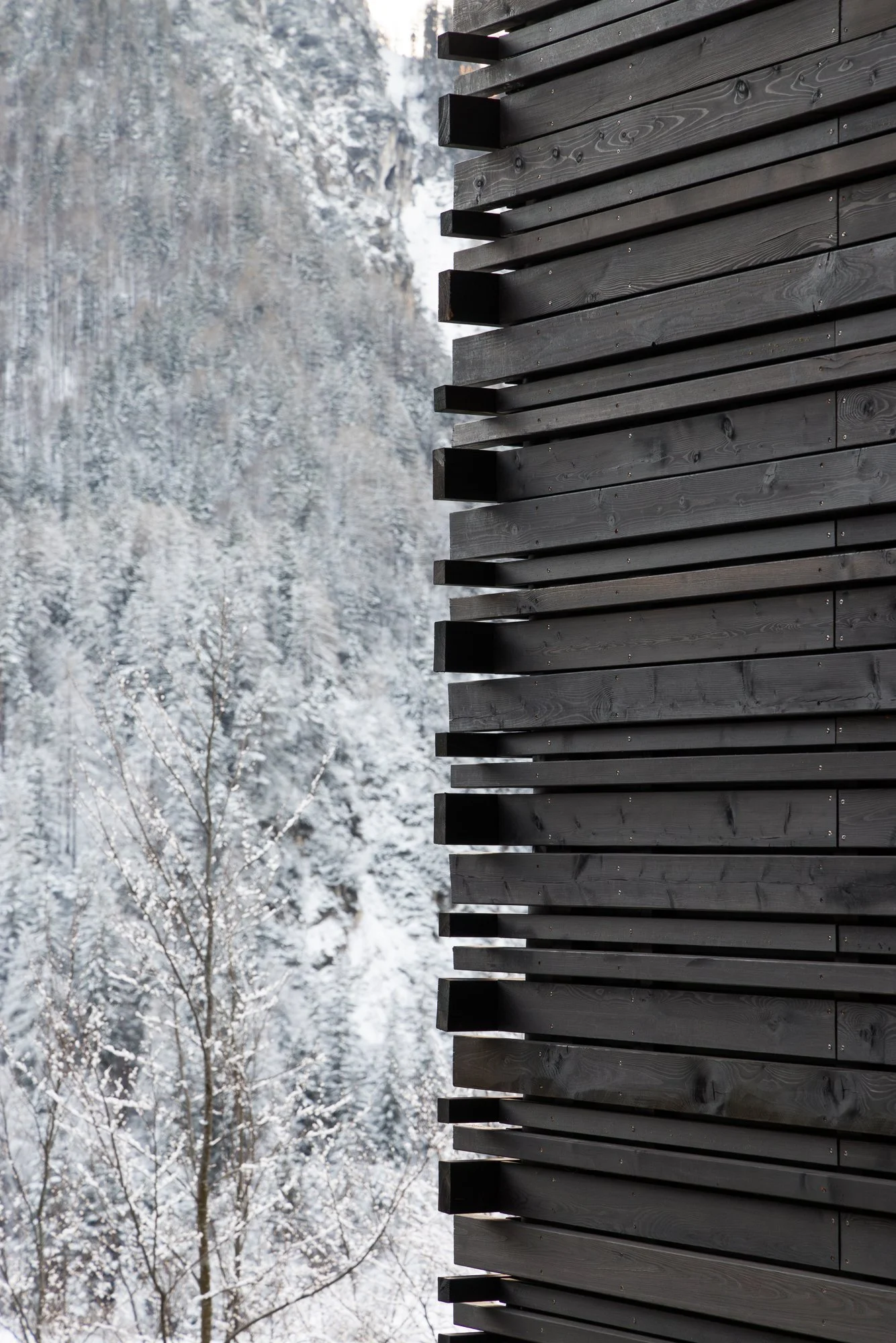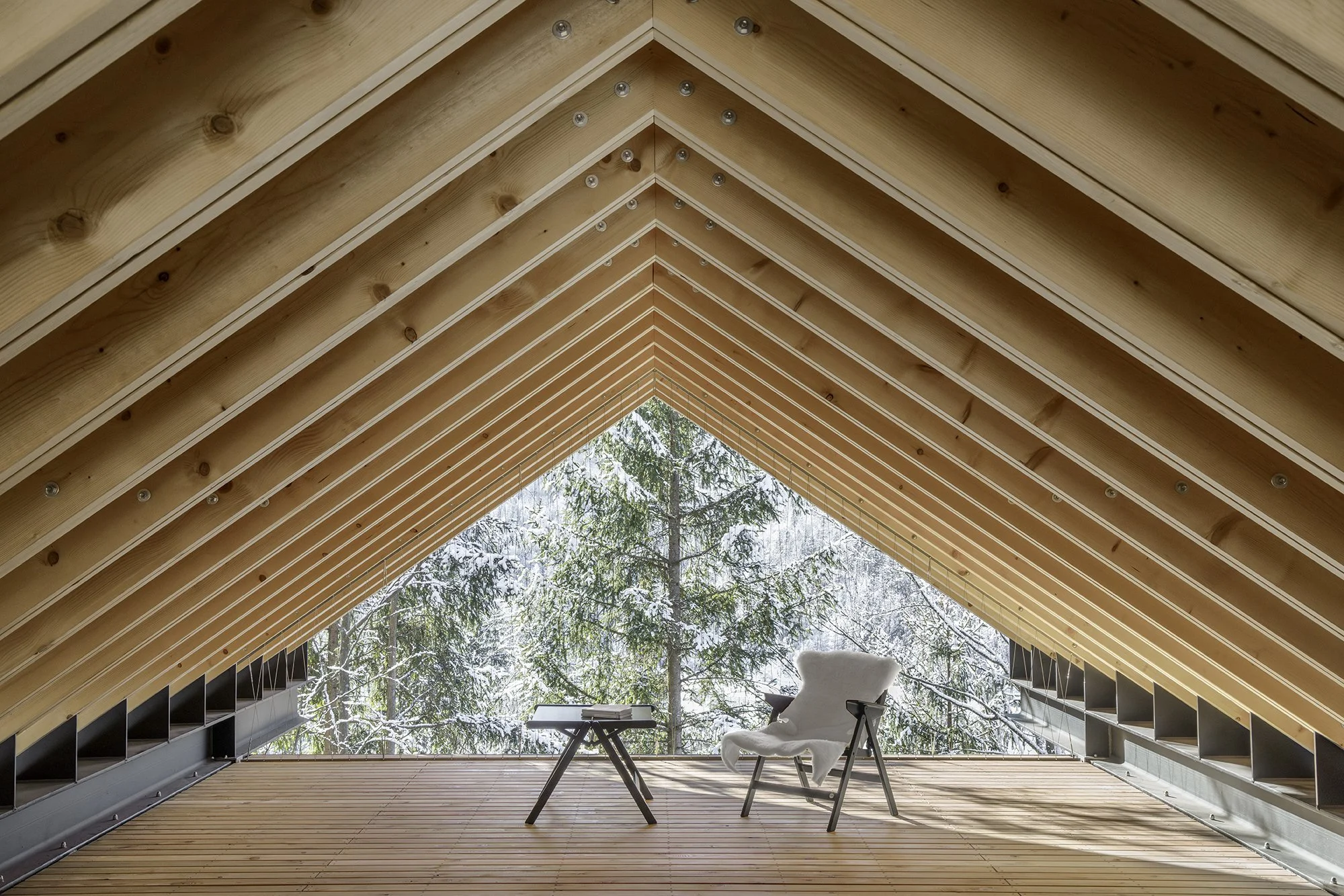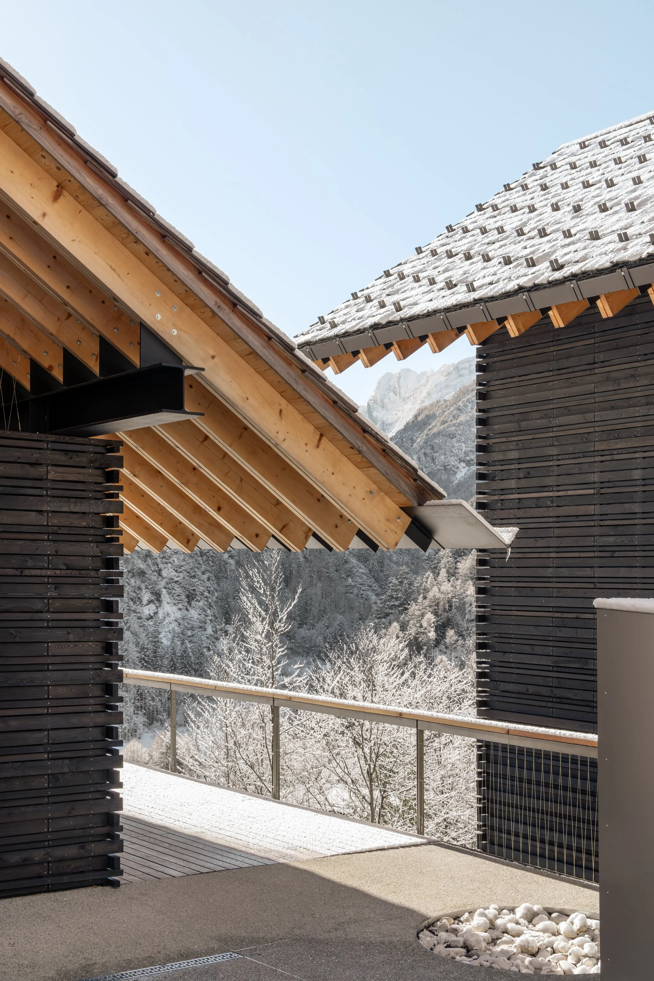 Pokrycie dachu kontynuuje alpejską tradycję surowych, łupanych gontów z modrzewia, wzbogaconych o precyzyjnie zaprojektowaną siatkę metalowych płotków przeciwśniegowych. Ten dialog rzemiosła i współczesnej technologii sprawia, że dach staje się kluczowym elementem tożsamości Twin Alpine Houses. Naturalne drewno, z czasem szlachetniejące pod wpływem warunków atmosferycznych, pozwala budynkom jeszcze silniej związać się z miejscem.