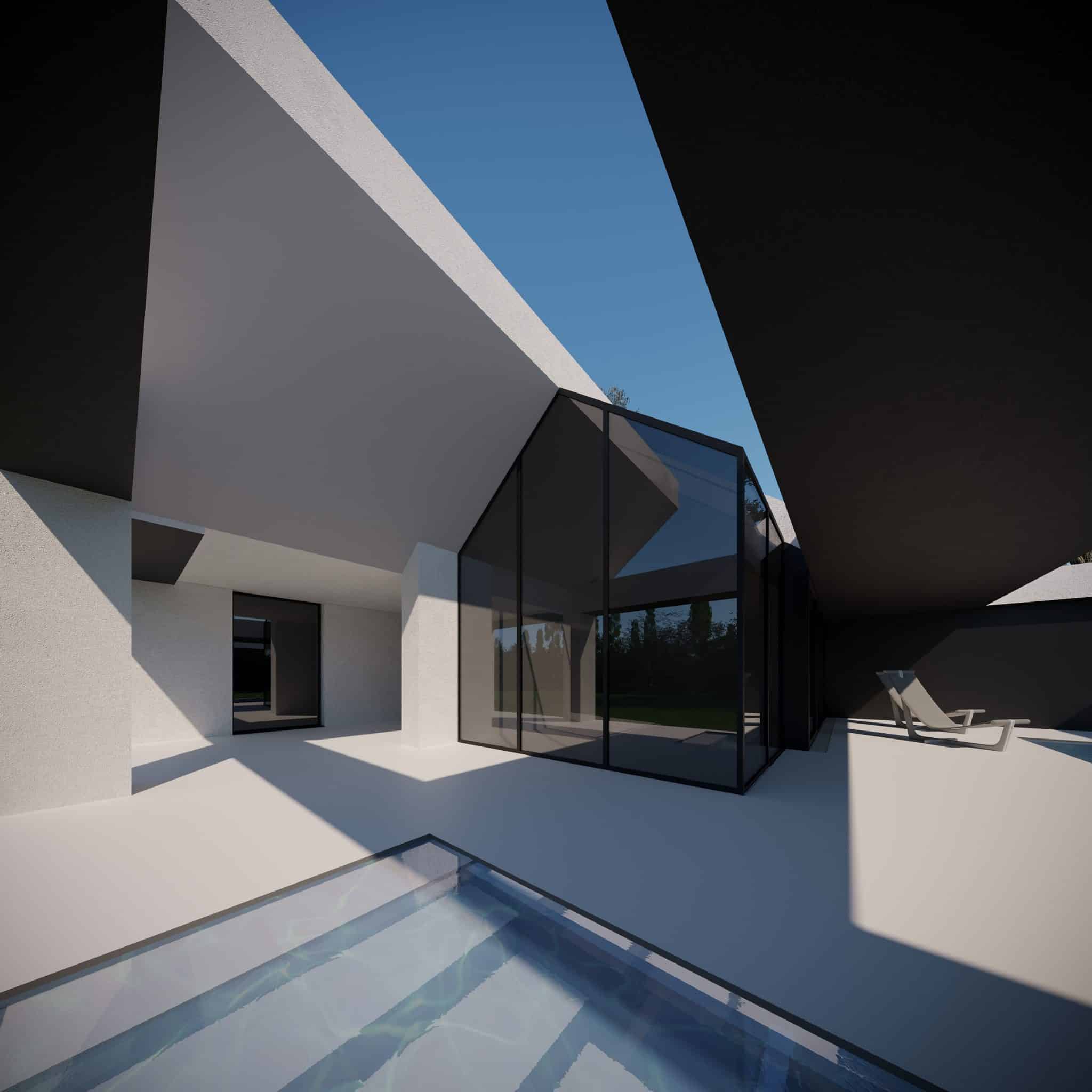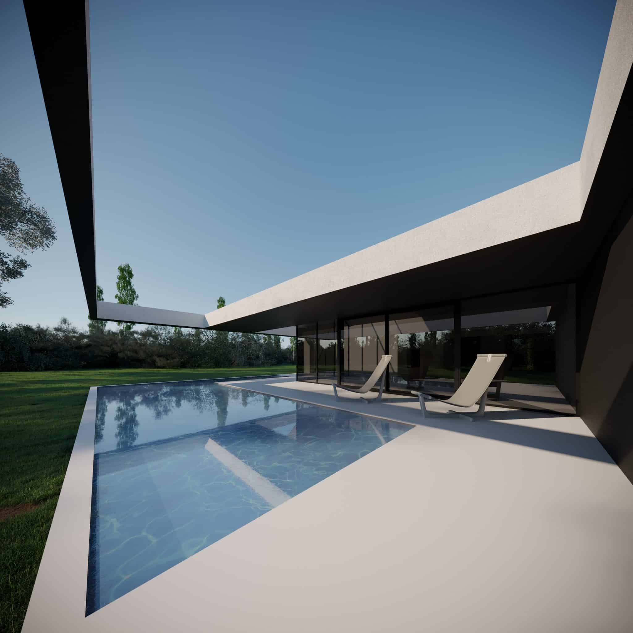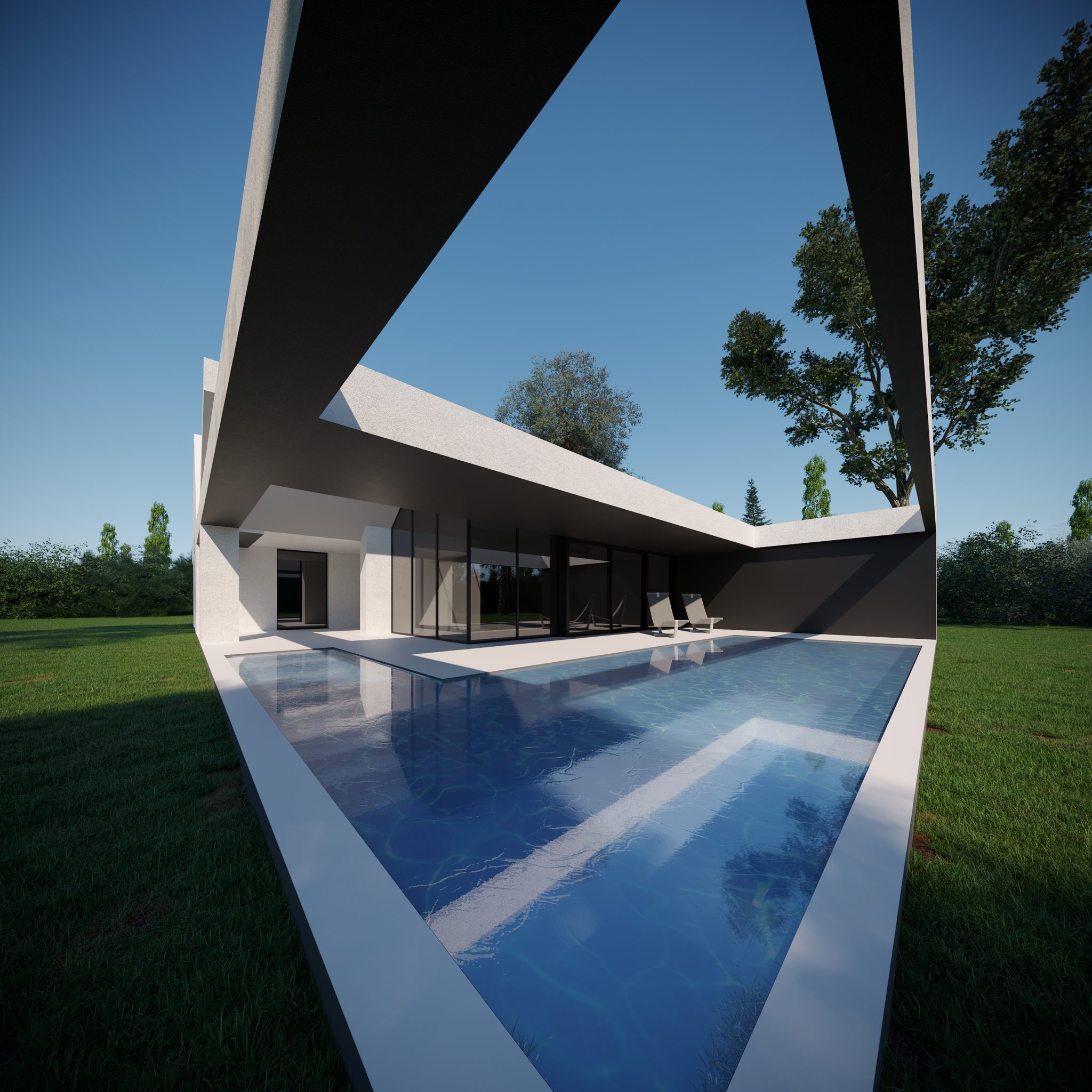 Basen przydomowy w kształcie litery L stał się jednym z kluczowych elementów całego założenia. Został wkomponowany w bryłę domu i powiązany z systemem obwodowych tarasów, częściowo zadaszonych lekką, płaską wstęgą architektoniczną oplatającą budynek od strony południowej i zachodniej. Dzięki temu strefa relaksu jest czytelnie powiązana z wnętrzem, a wszystkie elementy – dom, tarasy i basen – tworzą jedną spójną kompozycję.