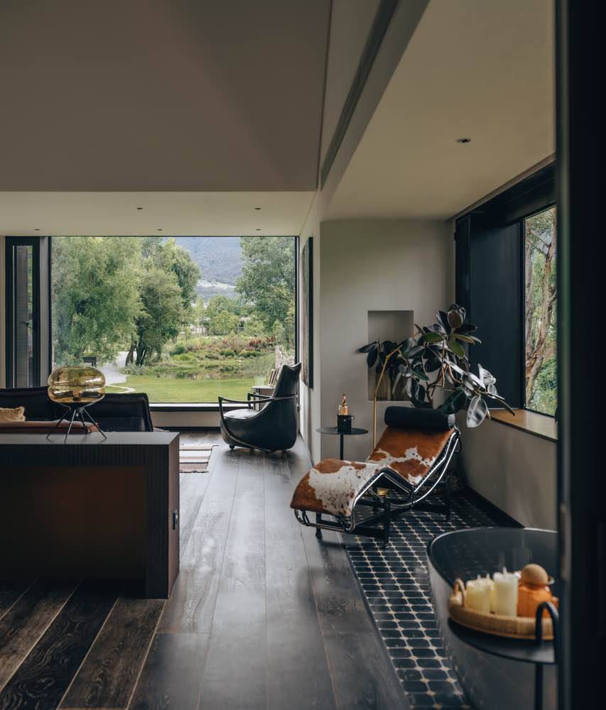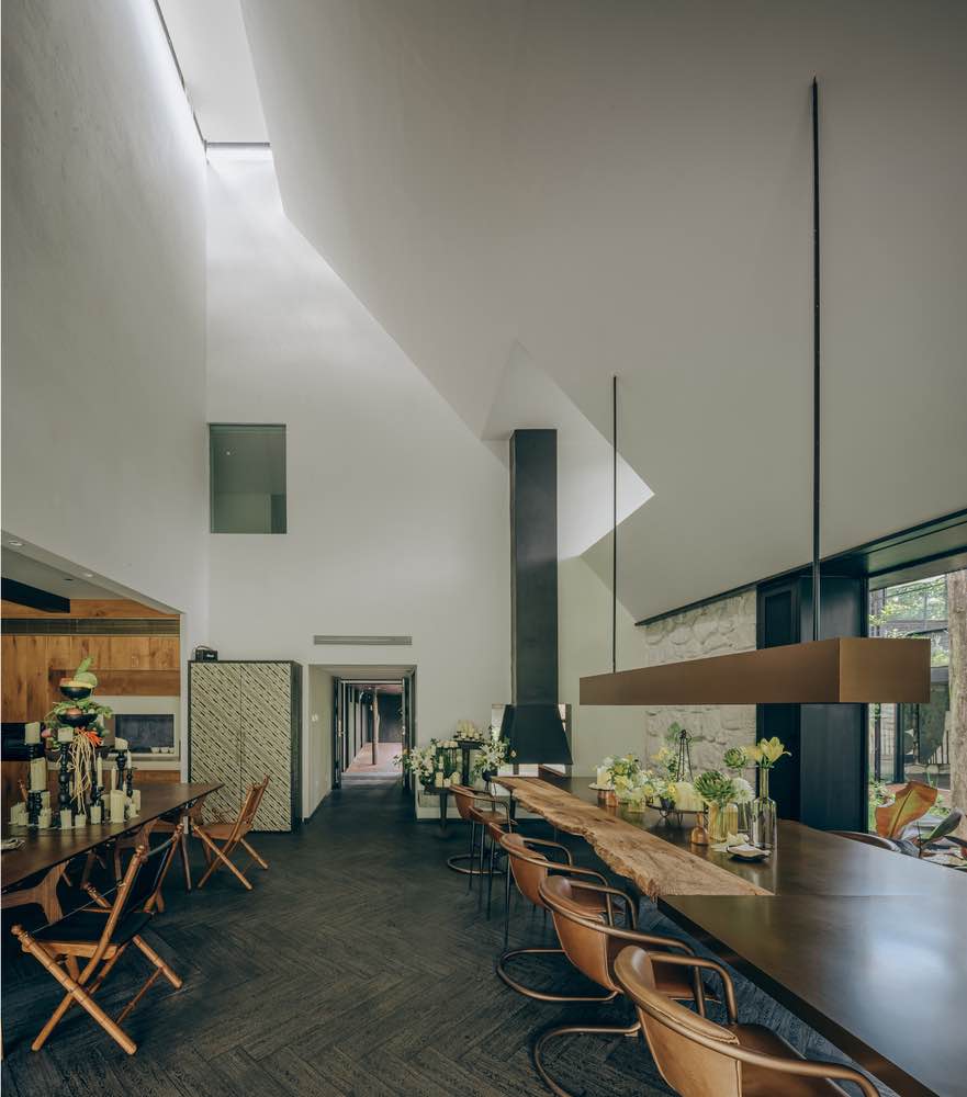 Część hotelowa została pomyślana nie jako dominujący obiekt, lecz jako rama dla doświadczenia krajobrazu. Recepcja ukryta jest wśród drzew, w szklarni porośniętej roślinami, a pokoje gościnne rozmieszczono wokół cichych dziedzińców. Każdy z nich posiada własny ogród, który staje się przedłużeniem wnętrza i właściwą przestrzenią życia. Architektura ogranicza się tu do minimum, pozwalając naturze odgrywać główną rolę.