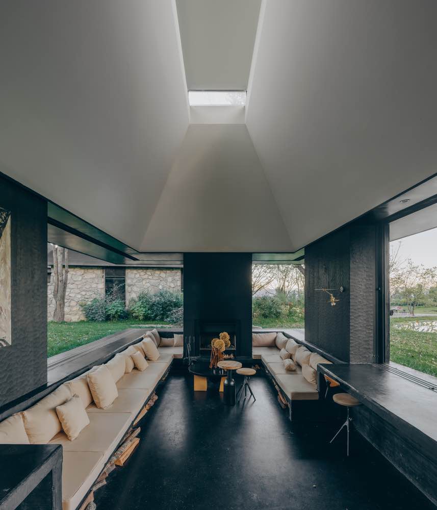 Drugim charakterystycznym elementem założenia jest zagłębiony pawilon wypoczynkowy z kominkiem. Obniżona posadzka wzmacnia poczucie intymności, a dach dwuspadowy, unoszący się na ukrytej konstrukcji, otwiera narożniki budynku na krajobraz. Przesuwne przeszklenia pozwalają całkowicie zintegrować wnętrze z ogrodem, a niska linia okapu kieruje wzrok ku horyzontowi gór Cangshan, które stopniowo odsłaniają się wraz z ruchem użytkownika.