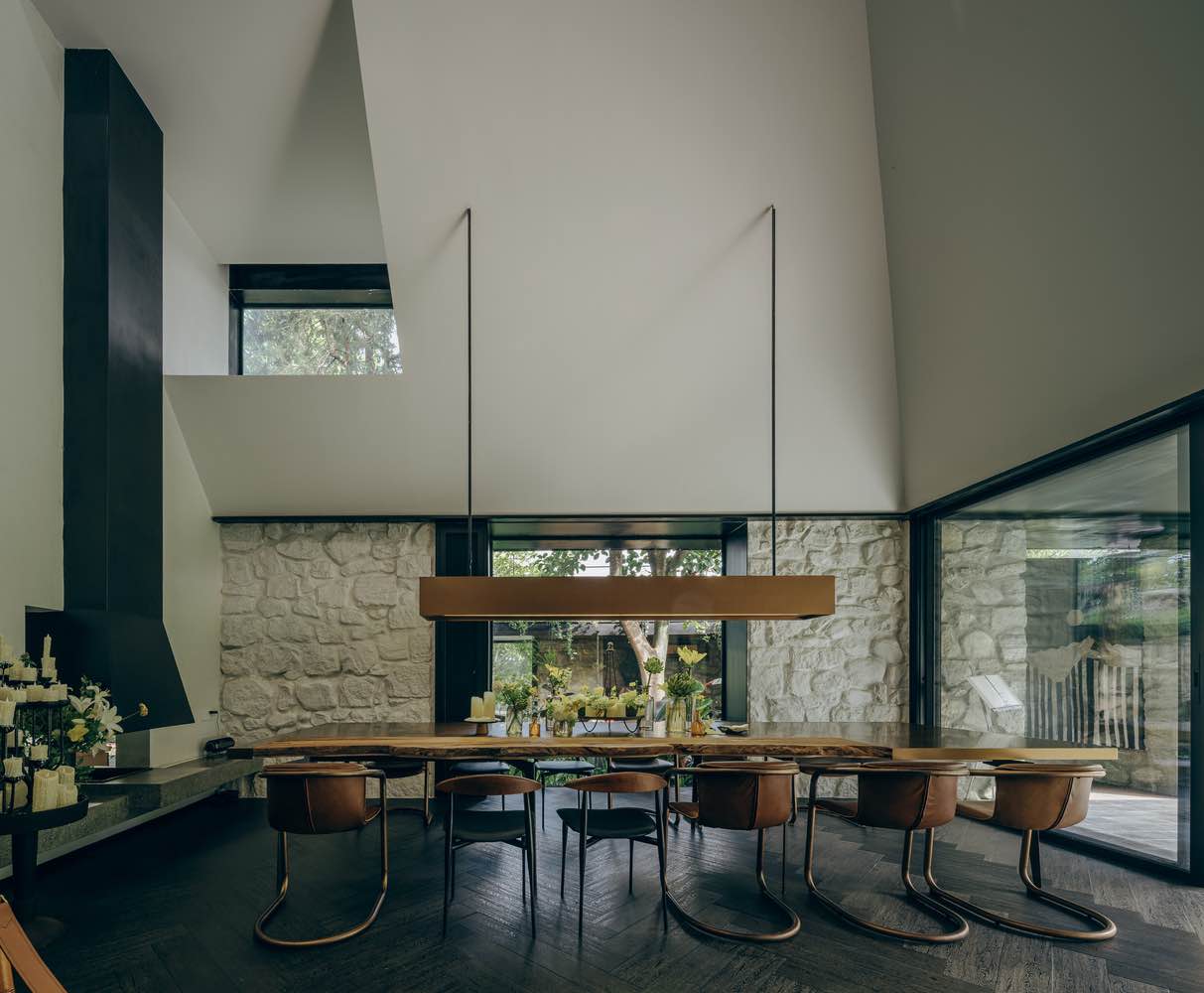 Jednym z kluczowych obiektów kompleksu jest tzw. Farmhouse, pełniący funkcję głównej przestrzeni mieszkalnej. Jego złożona forma z dachami dwuspadowymi kryje wielopoziomową sekwencję wnętrz, obejmującą hol wejściowy, otwartą klatkę schodową, galerię oraz poddasze. Świetliki i lukarny wprowadzają światło dzienne głęboko do wnętrz, filtrując je przez bambusy i drzewa rosnące wokół budynku. Tarasy od strony zachodniej kadrują najlepsze widoki na góry, a przestrzenie pod nimi mieszczą salon, strefy wypoczynkowe i sypialnie.