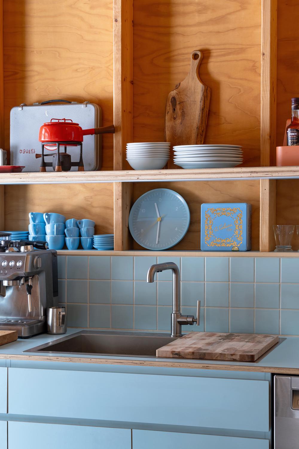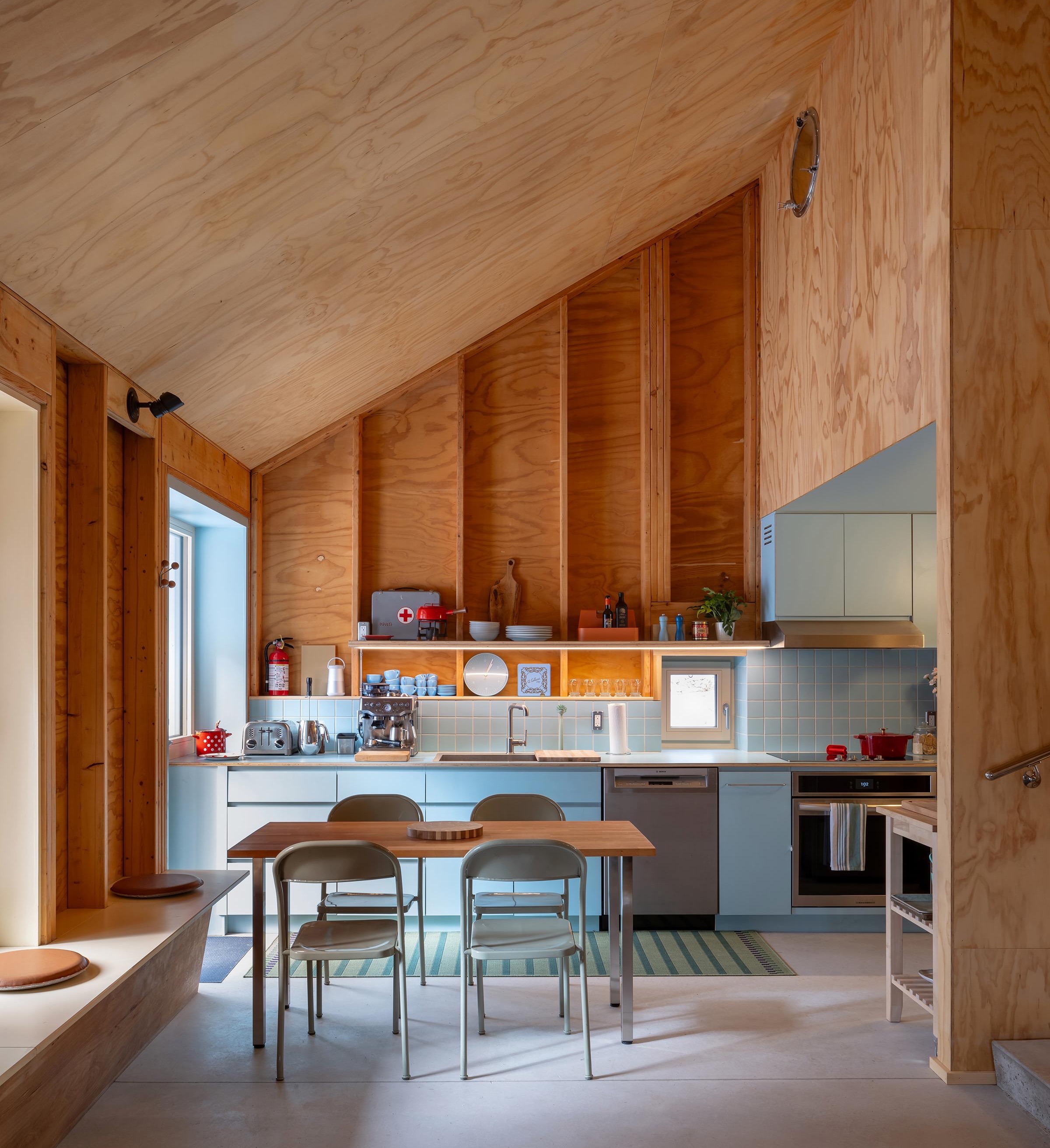 Elementy wykończenia, takie jak granatowe przesuwne drzwi czy błękitne szafki, wprowadzają kolorystyczne akcenty, które kontrastują z naturalnym drewnem. Kuchnia w odcieniu błękitnego jajka została uzupełniona żółtą fugą, która łączy surowość materiałów z ciepłą, przytulną estetyką.