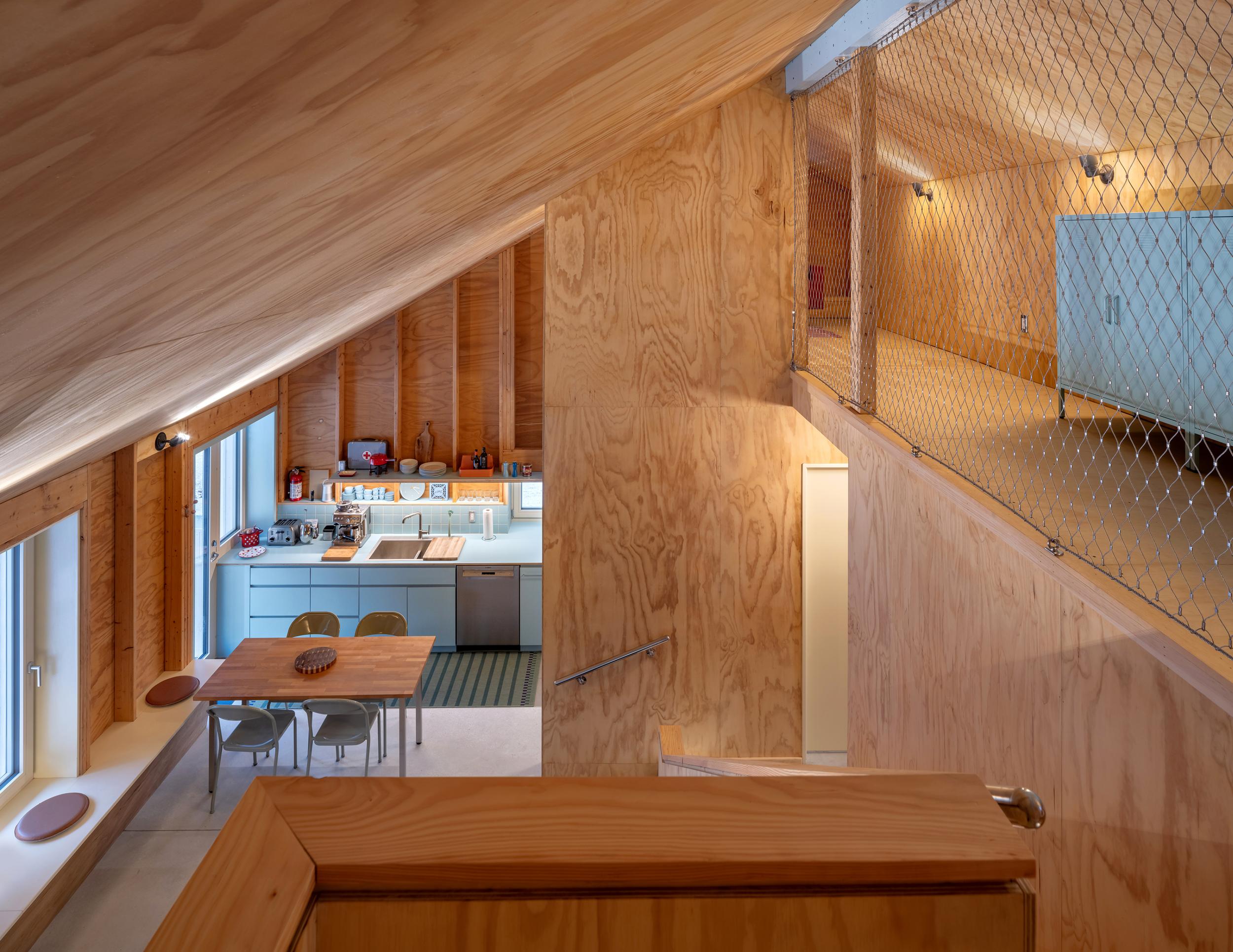 Struktura budynku jest całkowicie drewniana, a izolacja wykonana z włókien drzewnych i celulozy. Prefabrykowane panele ścienne i dachowe spełniają standardy Passive House, a lokalnie produkowane materiały, takie jak drewno, metal falisty i sklejka, minimalizują ślad węglowy. Przygotowana infrastruktura umożliwia dodanie odnawialnych źródeł energii na południowym dachu w przyszłości.