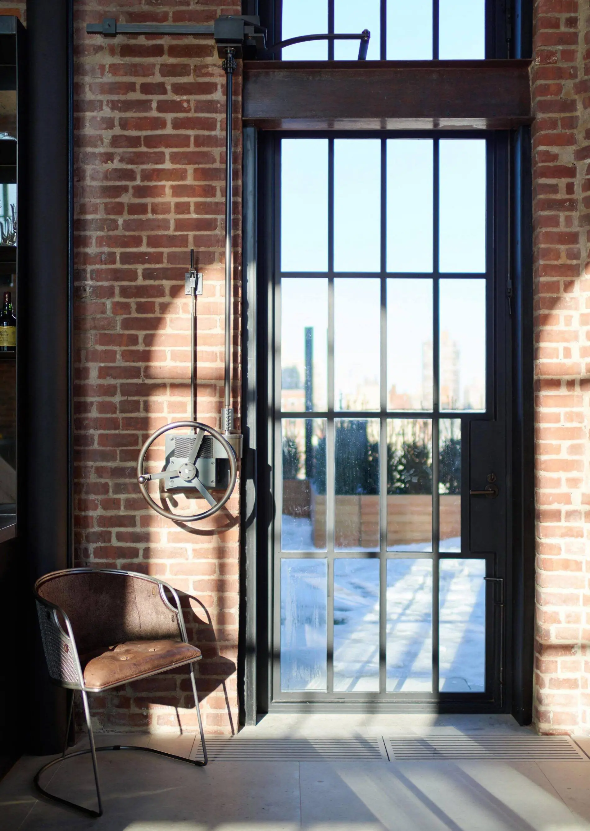 Na głównym poziomie dawnej wieży ciśnień znajduje się otwarta kuchnia, kominek oraz pokój rodzinny, zaprojektowany z myślą o prywatnych i formalnych spotkaniach. Przestrzeń ta łączy się z zewnętrznym ogrodem za pomocą imponującego, ponad pięciometrowego okna w stalowej ramie, które działa jak drzwi holenderskie, oferując trzy opcje otwierania – tylko dolną część, tylko górną lub całość.