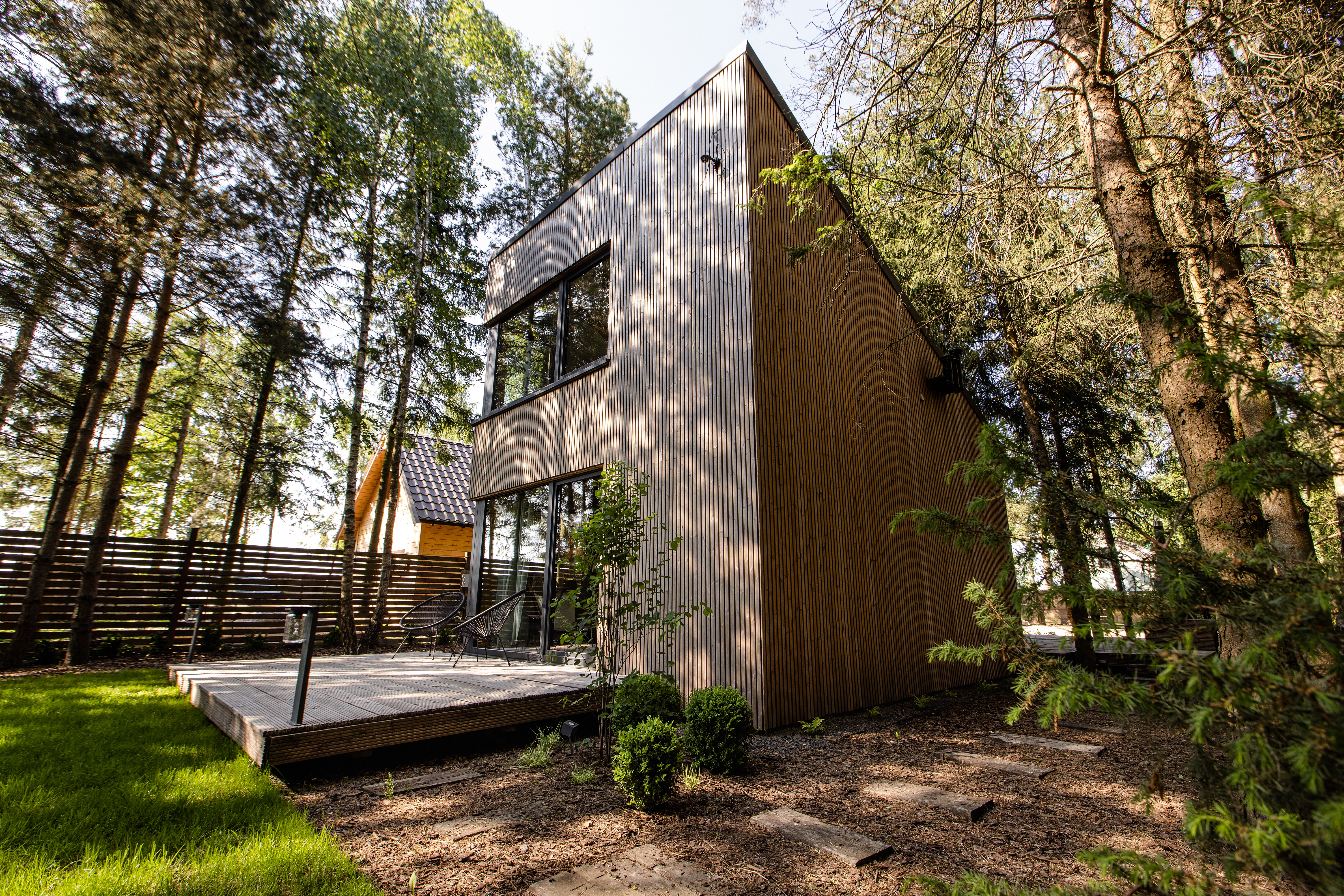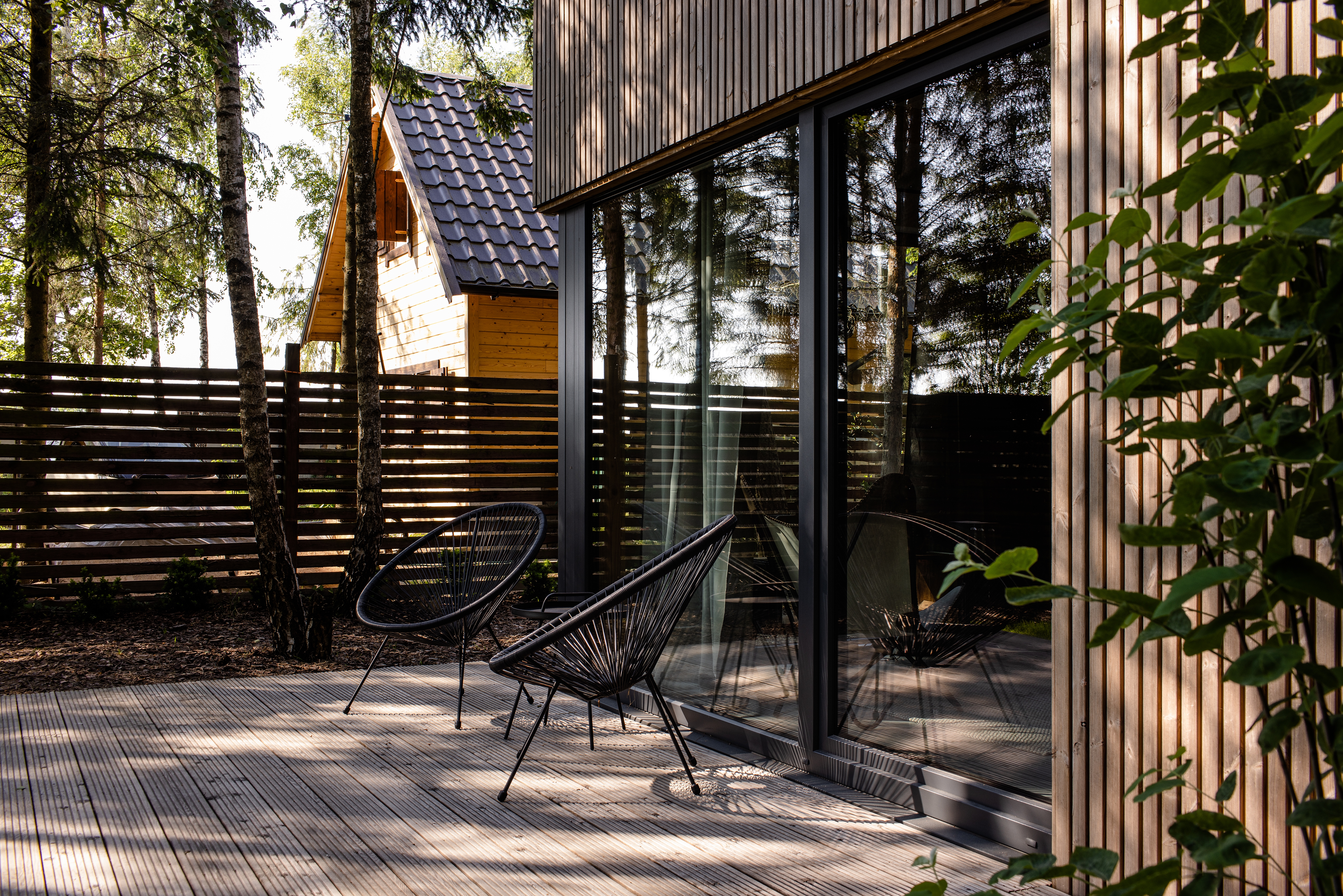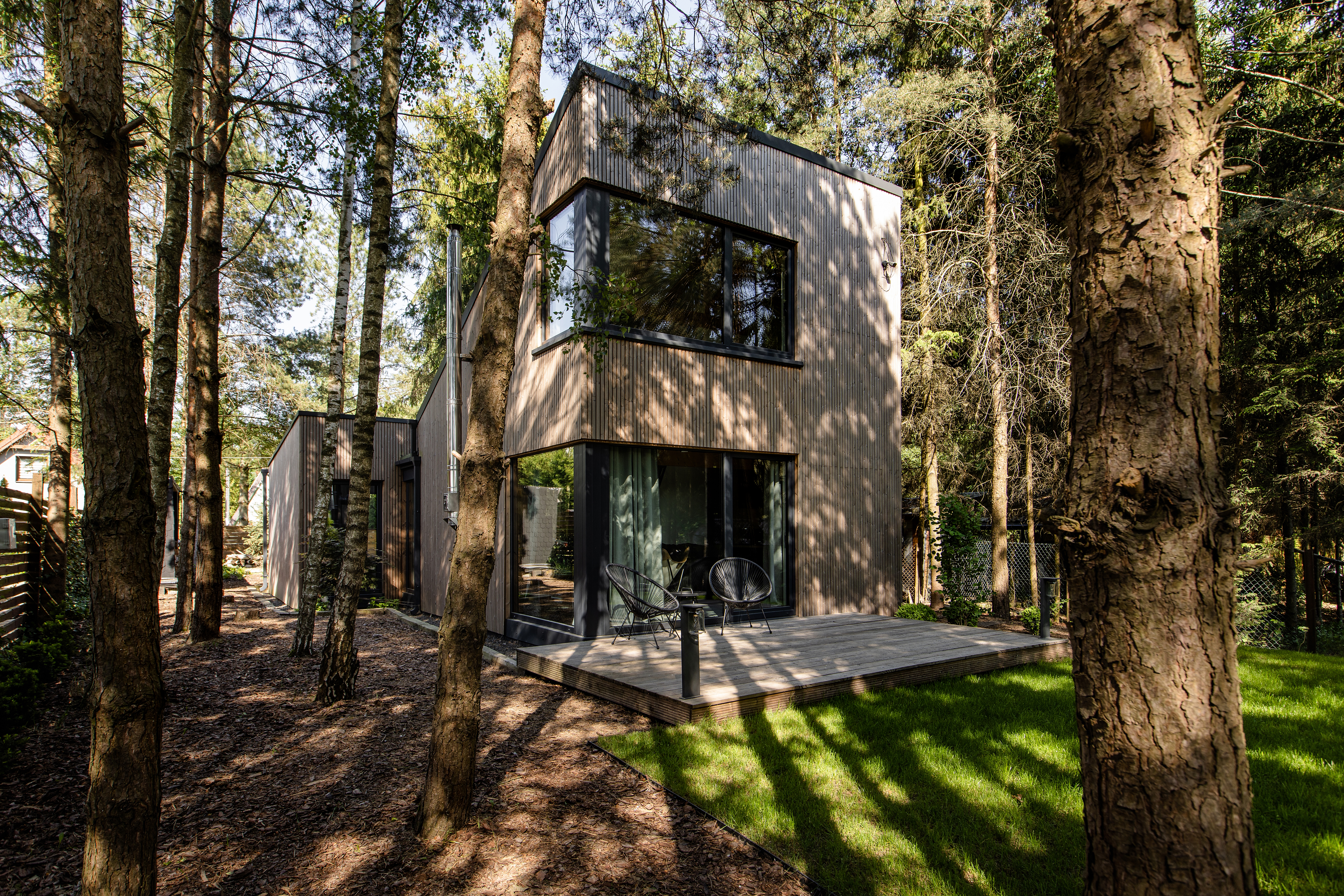 Mamy tutaj dwie bryły połączone łącznikiem. Wyższa część składa się z przestrzeni dziennej oraz antresoli, w niższej zaprojektowaliśmy sypialnię – wszystko otoczyliśmy dużymi przeszkleniami, tak aby zewnętrze zaprosić do środka. Wewnątrz natomiast dominują elementy drewniane wraz z ciepłym oświetleniem. Celowo zastosowaliśmy różne rodzaje desek, faktur oraz kolorów drewna, tak aby wywołać interakcję między tym co na zewnątrz, a tym co w środku. Elewacja ukształtowana z pionowych desek, wysoka fasada od strony ogrodu daje wrażenie „ściany lasu” pod którą można usiąść i odpocząć. Od zaplecza natomiast znalazł się taras, którego zadaszeniem są drzewa – taras to „salon” tego założenia, wnętrze jest „ciepłą” sypialnią, a ogród jest idealnym miejscem do czytania książki.