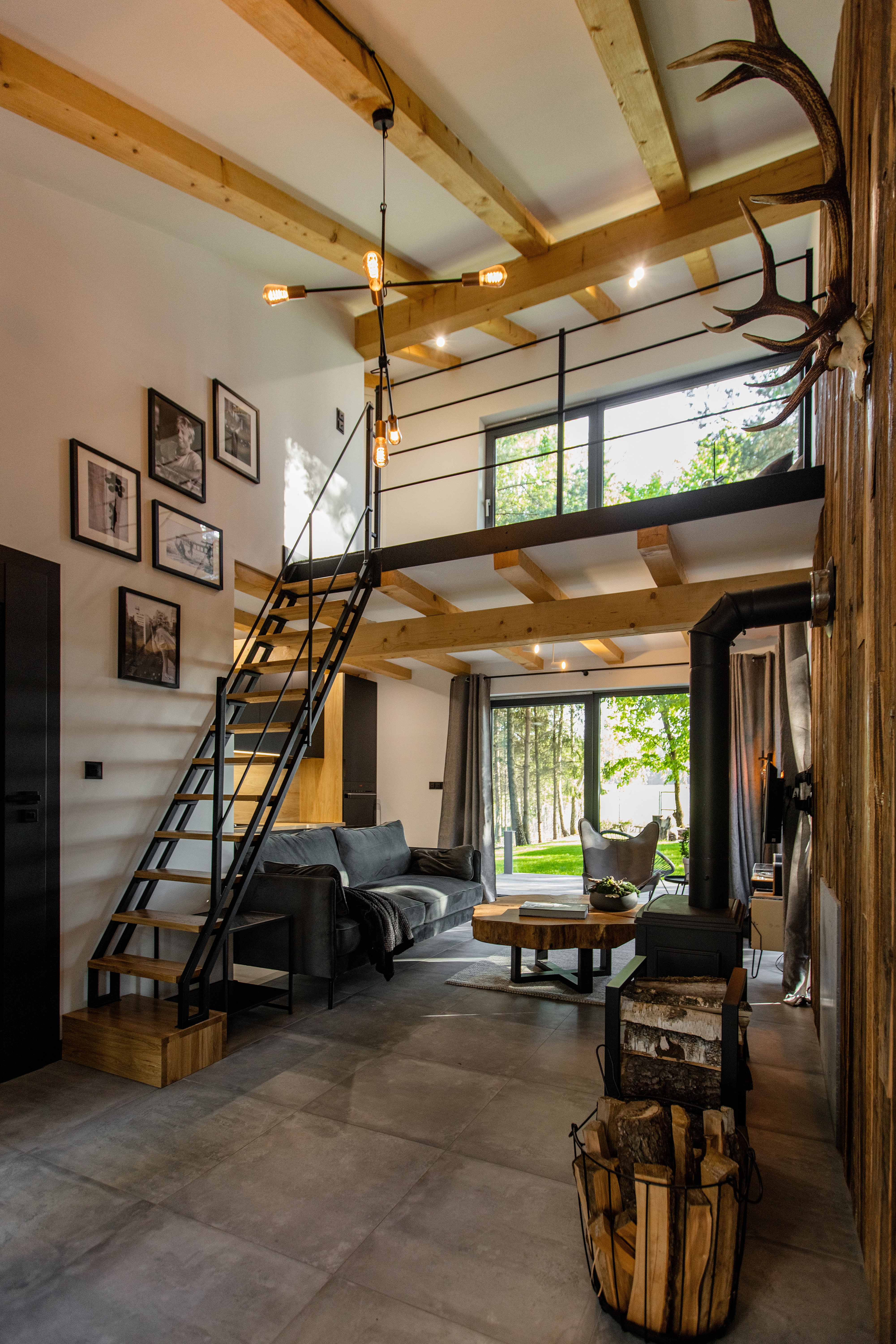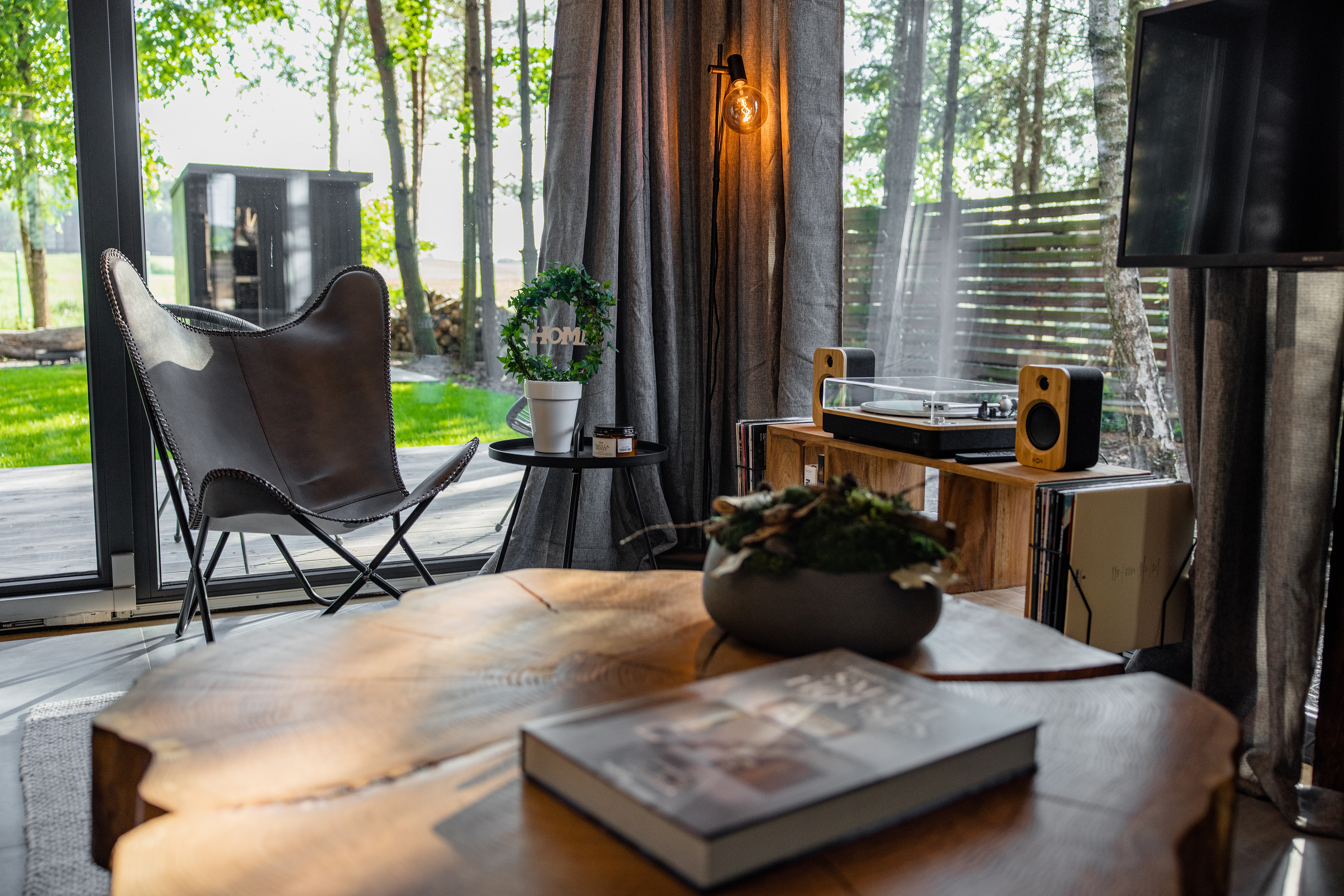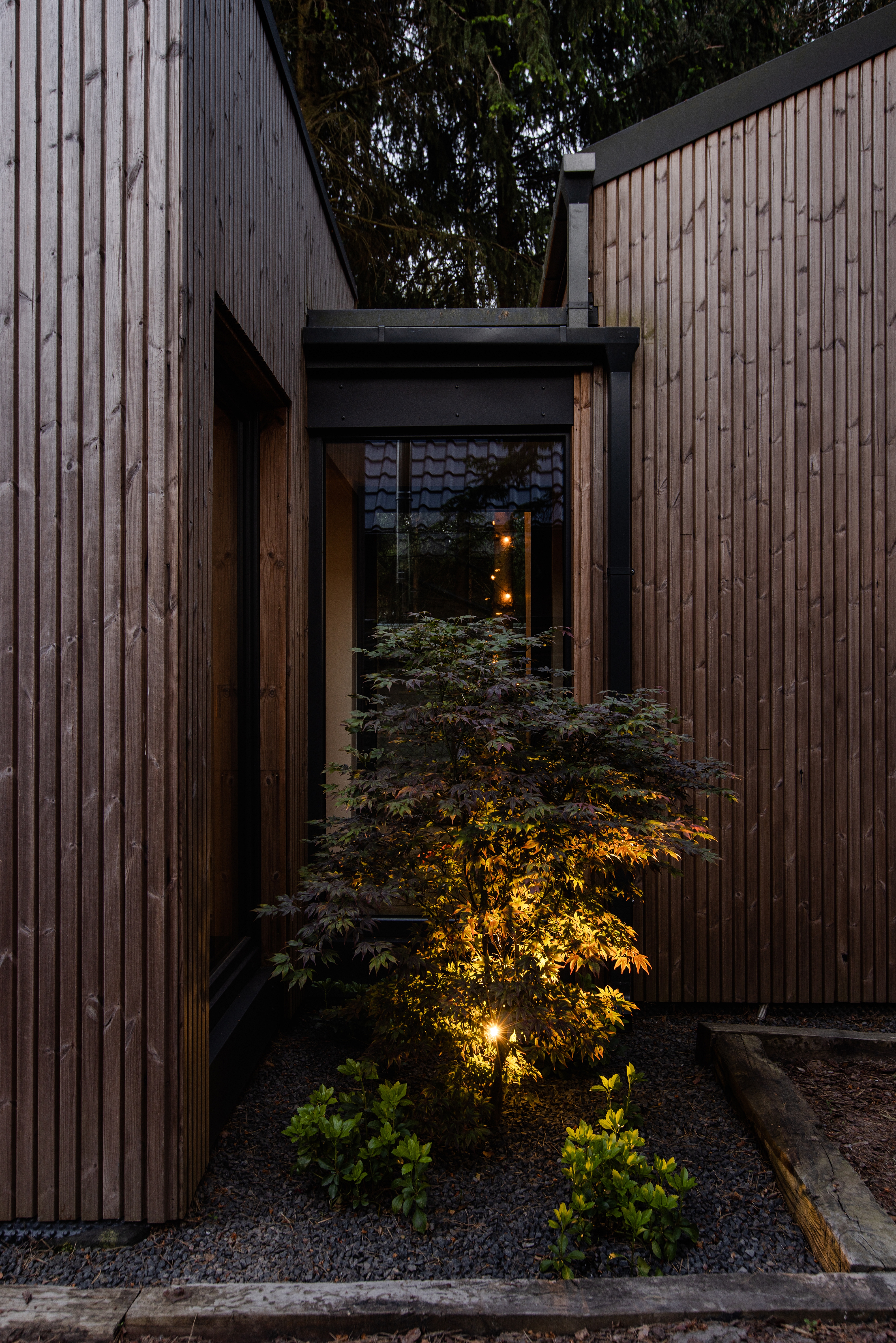 Mamy tutaj dwie bryły połączone łącznikiem. Wyższa część składa się z przestrzeni dziennej oraz antresoli, w niższej zaprojektowaliśmy sypialnię – wszystko otoczyliśmy dużymi przeszkleniami, tak aby zewnętrze zaprosić do środka. Wewnątrz natomiast dominują elementy drewniane wraz z ciepłym oświetleniem. Celowo zastosowaliśmy różne rodzaje desek, faktur oraz kolorów drewna, tak aby wywołać interakcję między tym co na zewnątrz, a tym co w środku. Elewacja ukształtowana z pionowych desek, wysoka fasada od strony ogrodu daje wrażenie „ściany lasu” pod którą można usiąść i odpocząć. Od zaplecza natomiast znalazł się taras, którego zadaszeniem są drzewa – taras to „salon” tego założenia, wnętrze jest „ciepłą” sypialnią, a ogród jest idealnym miejscem do czytania książki.
