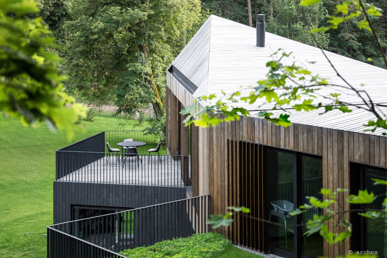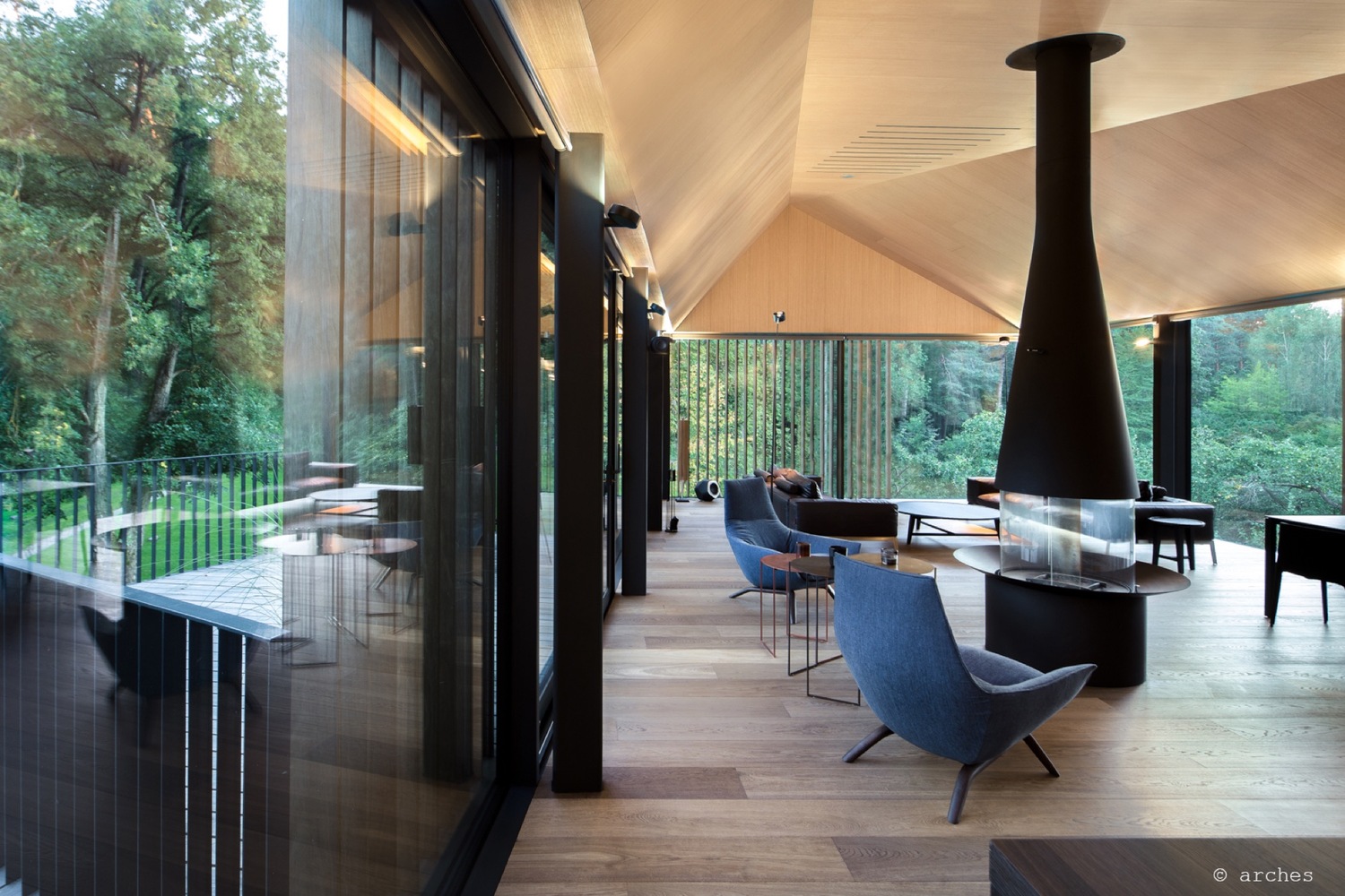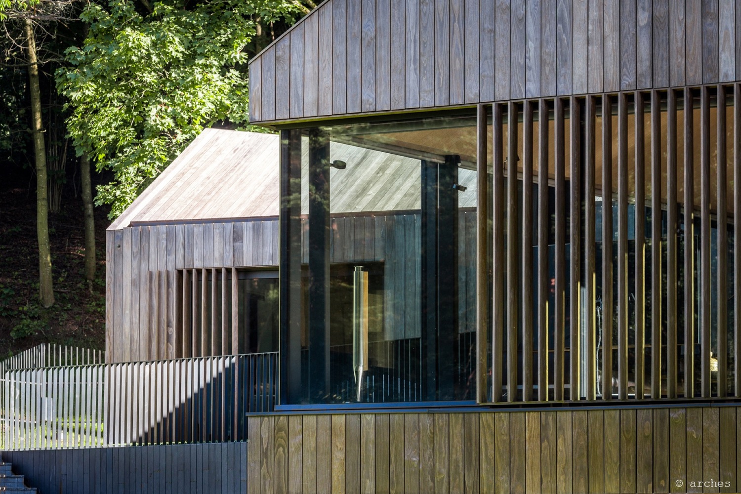 Budynek został „zawieszony” nad doliną, umożliwiając wprowadzenie wyjątkowego krajobrazu do wnętrza. Parter ukryty w skarpie, wykończony czarnym łupkiem, zlewa się z tłem, podczas gdy bryła pierwszego piętra, wykończona naturalnym drewnem, przyciąga wzrok. Zróżnicowane formy i proporcje, harmonia szkła i drewna, tworzą wrażenie lekkości. Drewno sosnowe oraz technologia Kebony sprawiają, że budynek jest odporny, trwały i ekologiczny, idealnie wpasowując się w otoczenie.