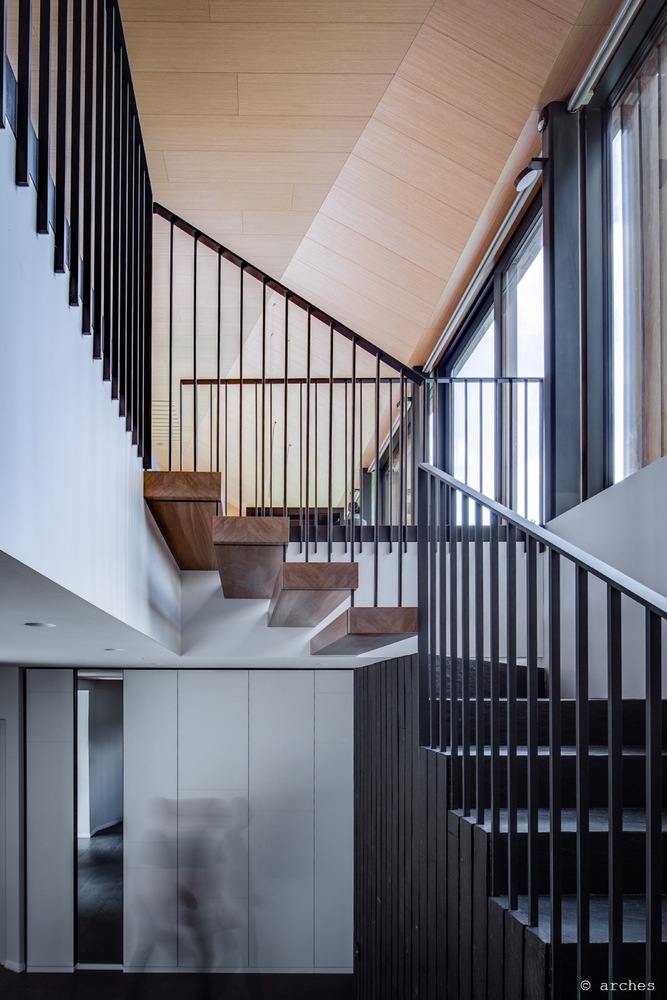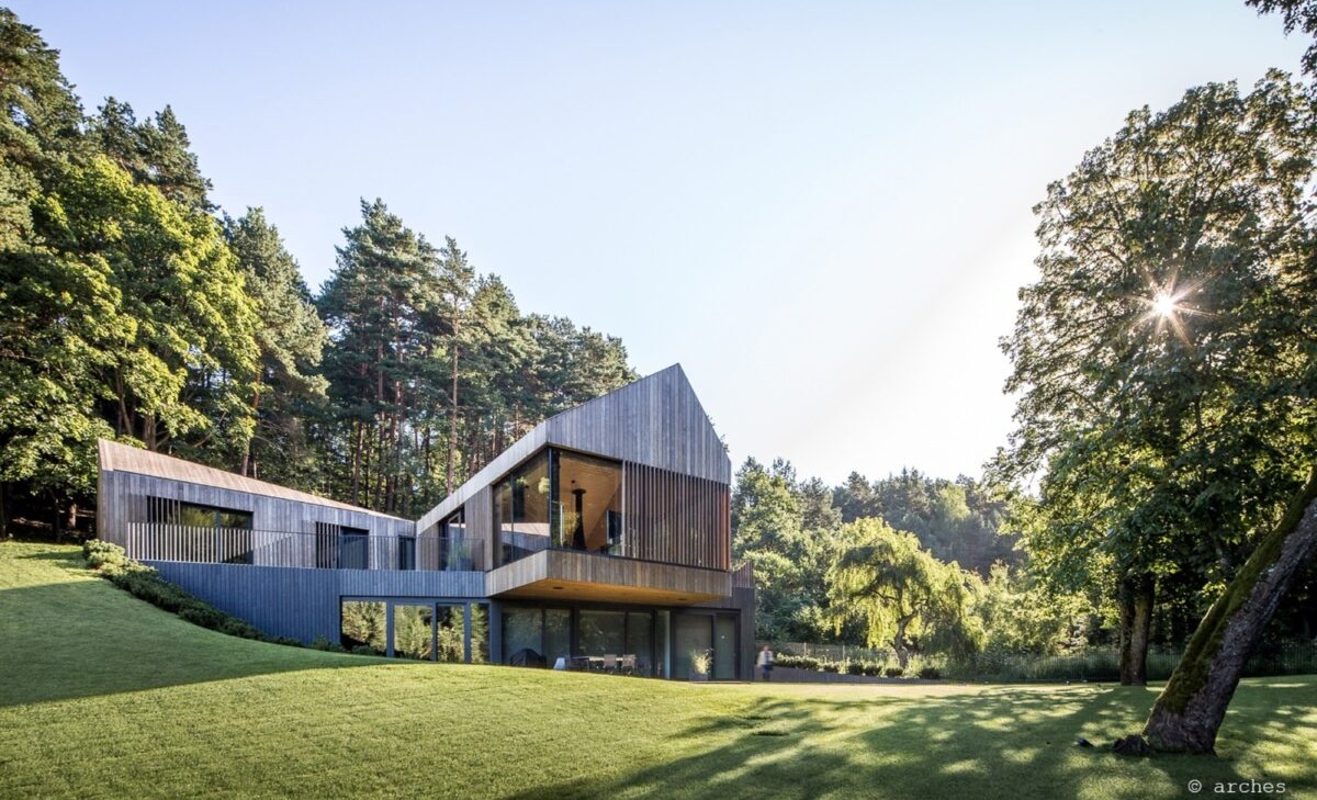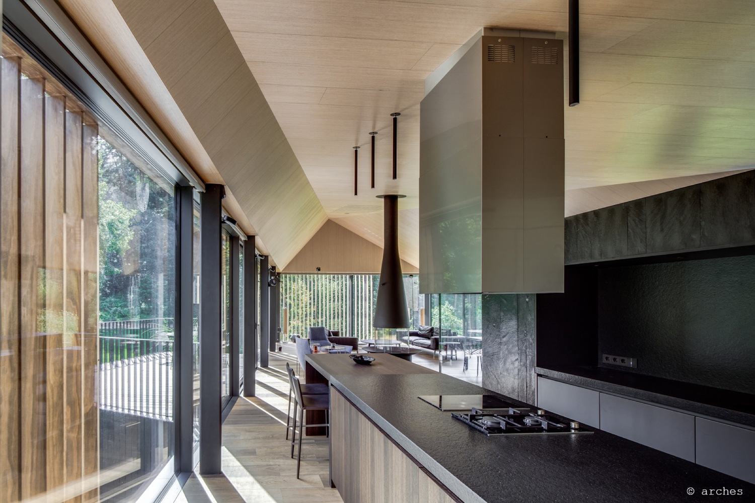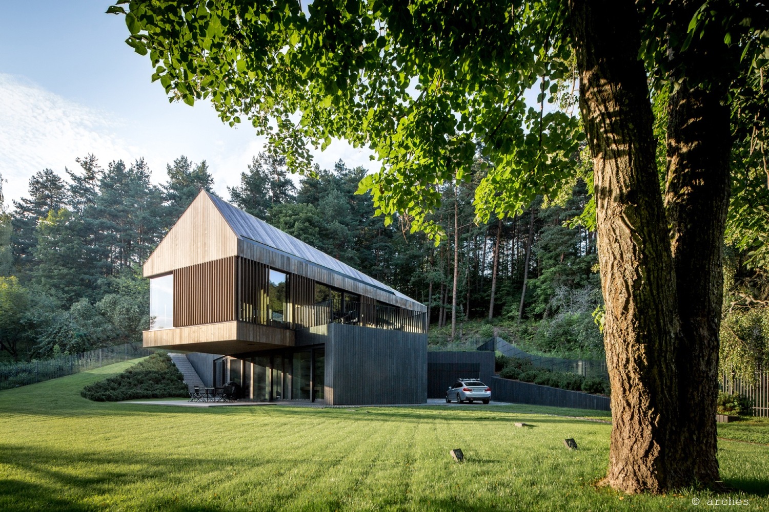 Budynek został „zawieszony” nad doliną, umożliwiając wprowadzenie wyjątkowego krajobrazu do wnętrza. Parter ukryty w skarpie, wykończony czarnym łupkiem, zlewa się z tłem, podczas gdy bryła pierwszego piętra, wykończona naturalnym drewnem, przyciąga wzrok. Zróżnicowane formy i proporcje, harmonia szkła i drewna, tworzą wrażenie lekkości. Drewno sosnowe oraz technologia Kebony sprawiają, że budynek jest odporny, trwały i ekologiczny, idealnie wpasowując się w otoczenie.
