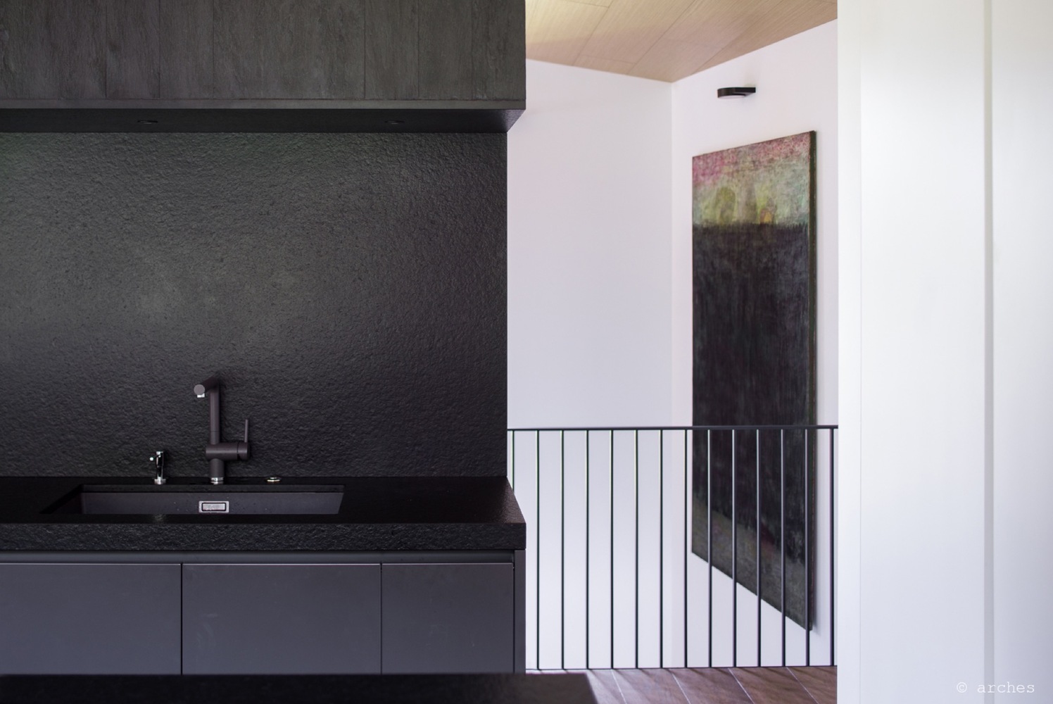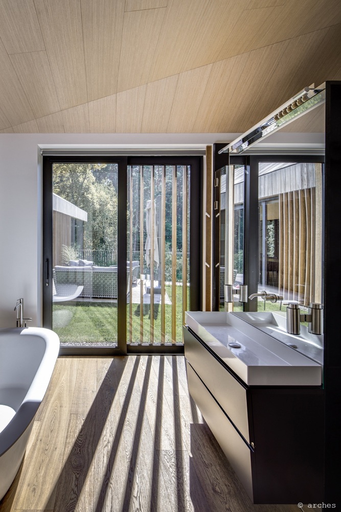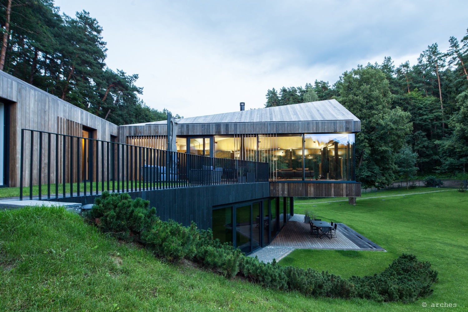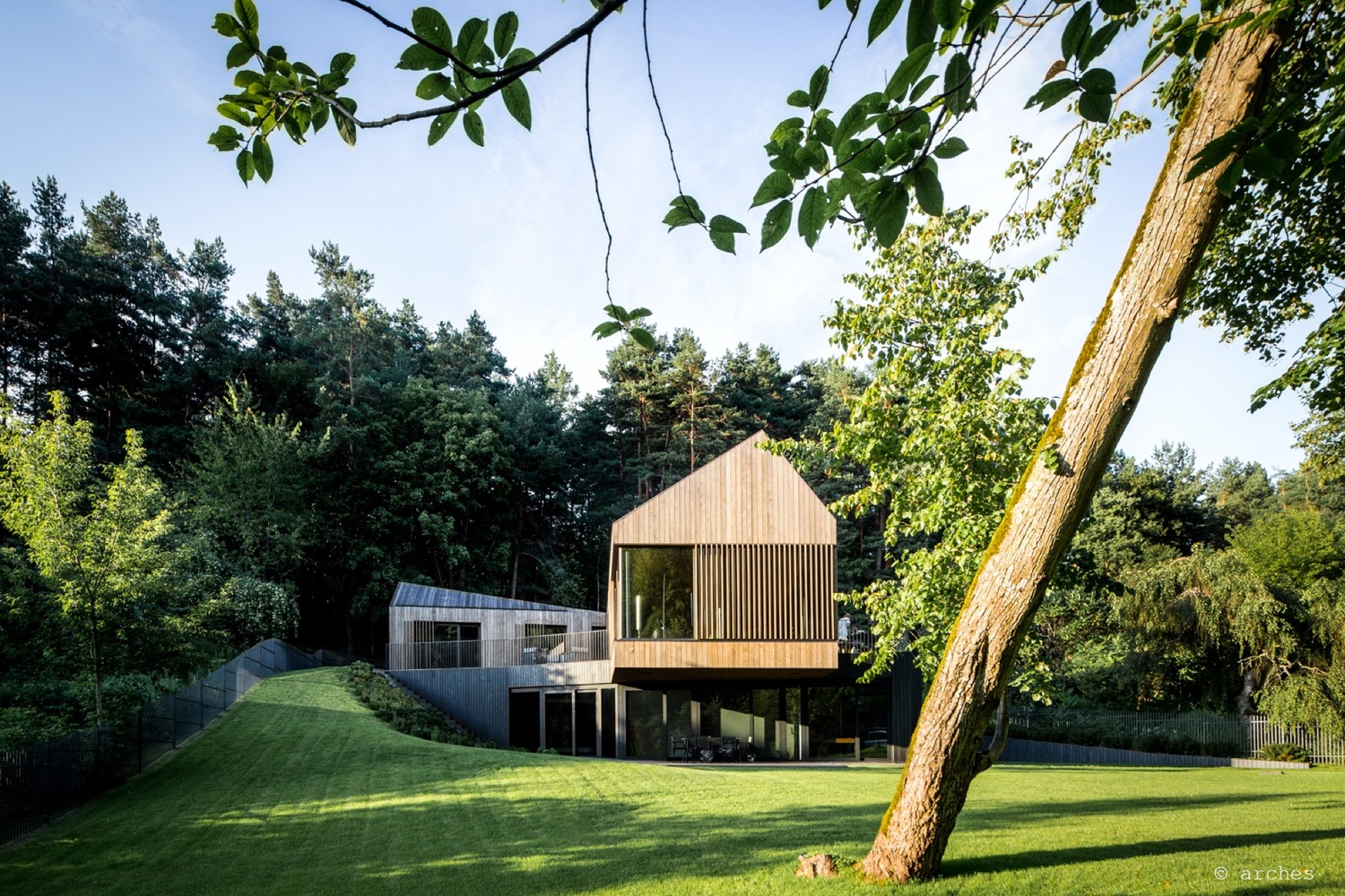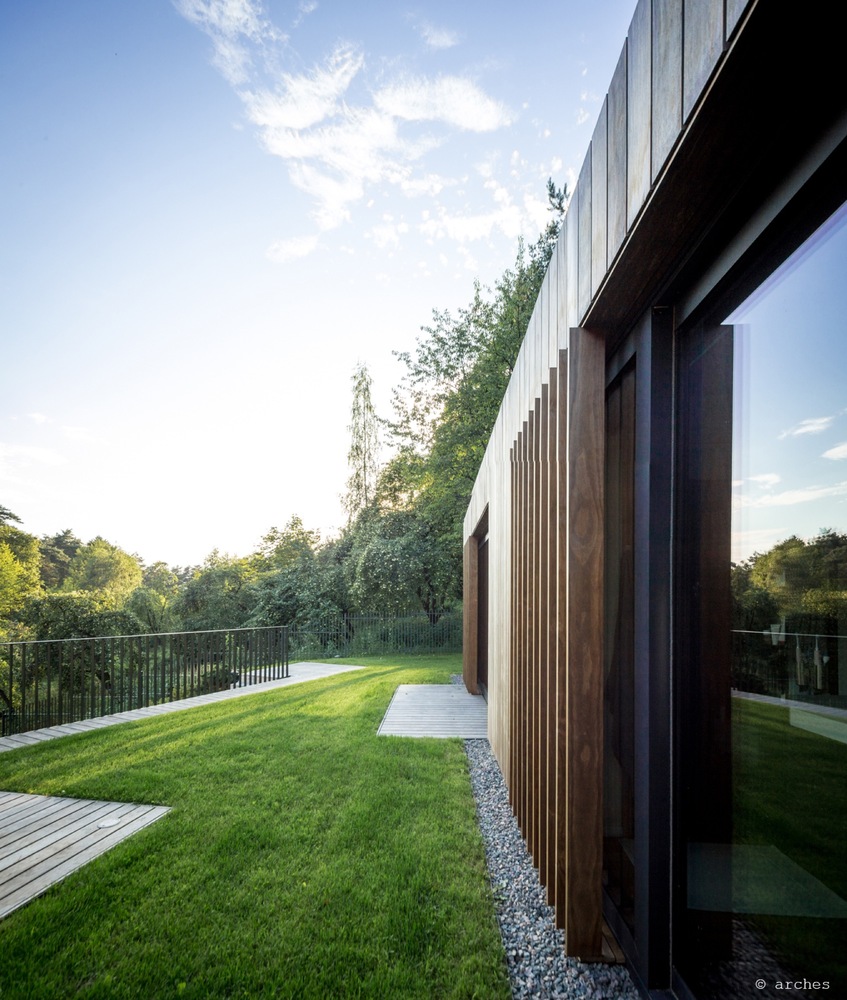 Bryła dzieli przestrzenie wewnętrzne, zapewniając wejścia do przestrzeni zewnętrznych – dziedzińców, które tworzą poczucie prywatności w zależności od pory dnia. Taras z pierwszego piętra oraz drewniane lamówki chroniące okna parteru zapewniają komfort oraz integrację z naturą. Do wykończenia zastosowano granitową drogę i ażurowy płot.