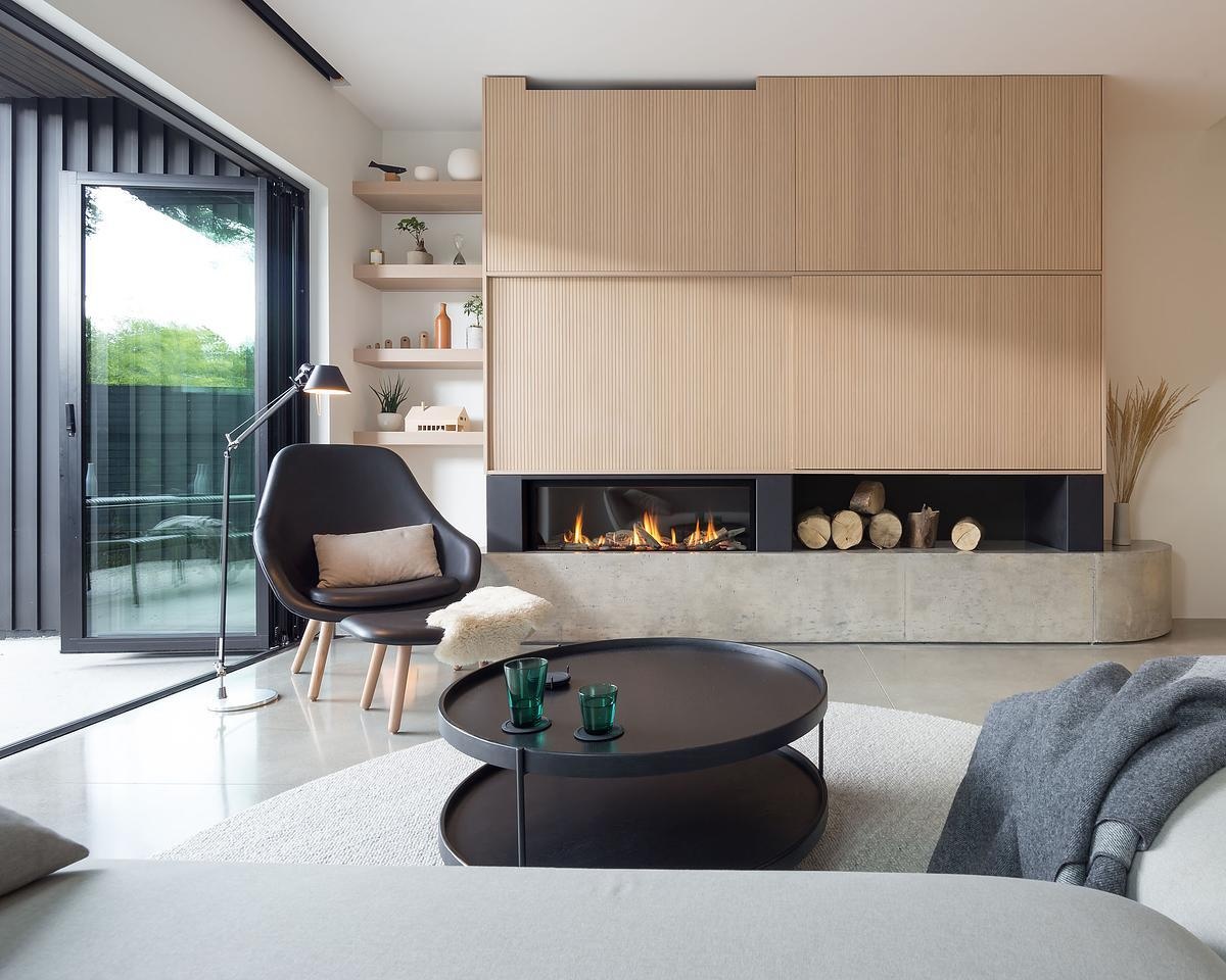 W środku dom zachwyca spokojem, detalem i materiałami. Posadzki z polerowanego betonu, a nad nimi zróżnicowane wysokości stropów – od kameralnych do imponujących, jak w gabinecie z drewnianym sklepieniem. W salonie głównym centrum stanowi kominek z betonową podstawą, a schowane za frontem mebla TV nie zakłóca czystości kompozycji. Detale wykończenia, jak tamburowe fornirowanie ścian jadalni, wprowadzają miękkość i fakturę.
