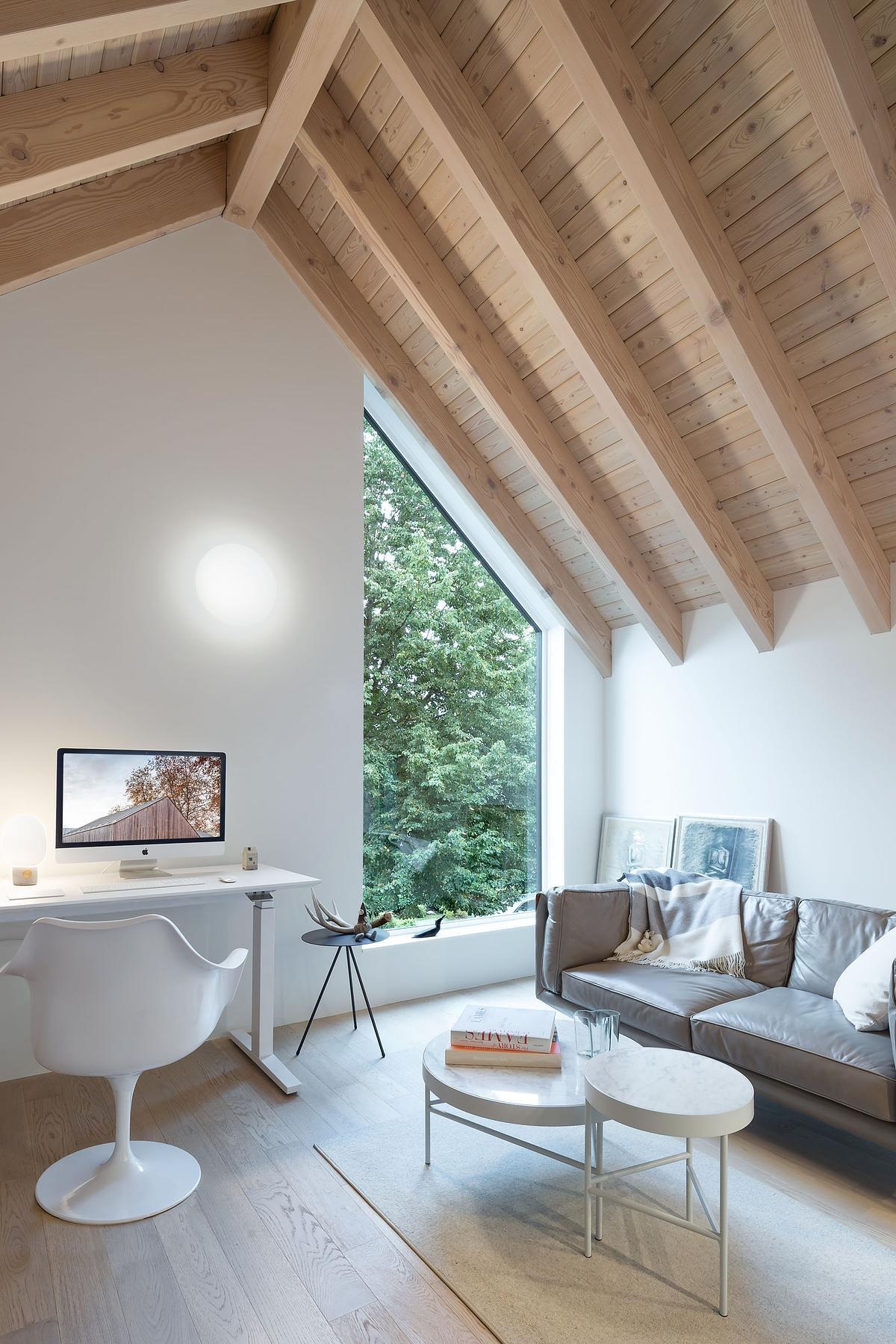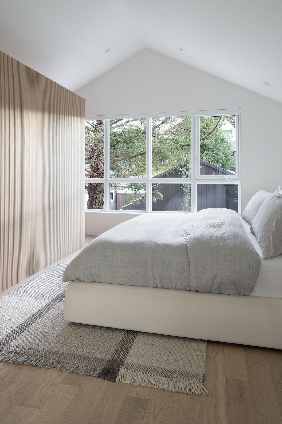 Na piętrze gabinet znajduje się pod odsłoniętym drewnianym sufitem, co nadaje mu domowy i spokojny charakter. Sypialnia z kolei to studium minimalizmu – białe ściany, jasne światło i drewniana przegroda, która oddziela strefę snu od garderoby, nie zamykając przestrzeni. Główna łazienka kontynuuje stylistykę domu – marmur, prostota i spokojny luksus.