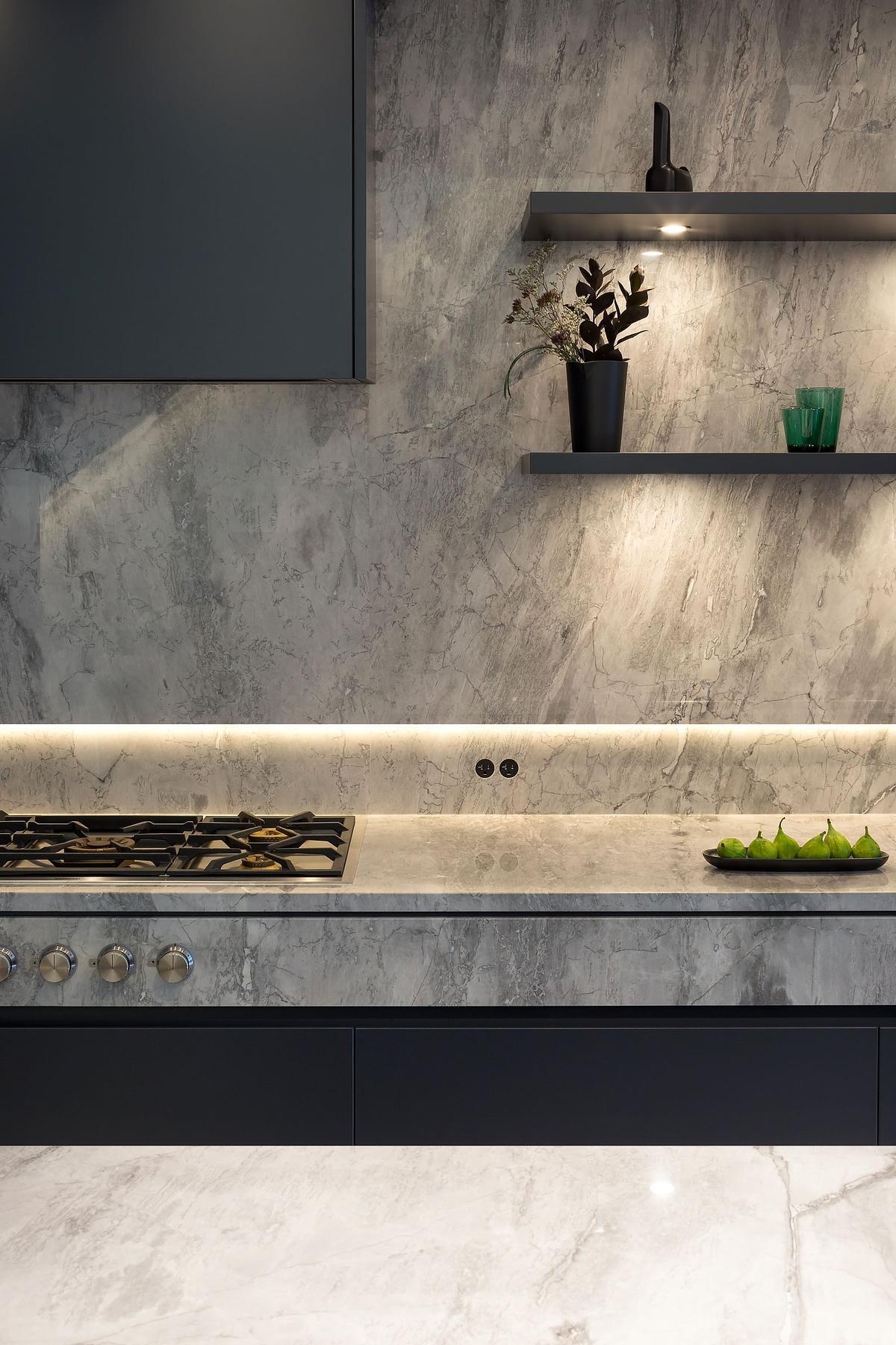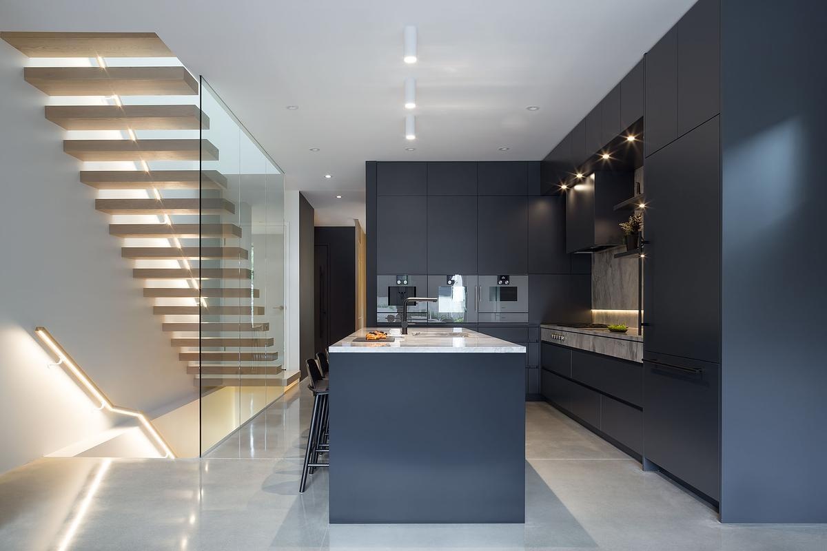 Kuchnia to przestrzeń graficzna i elegancka: czarne fronty, marmurowe blaty, urządzenia Gaggenau. Lodówka została zintegrowana z zabudową, a schody – lekkie, wspornikowe – zdają się unosić, z ukrytym oświetleniem LED w balustradzie. To moment architektoniczny, który spina wizualnie przestrzenie parteru. Łazienka dla gości jest niewielka, ale efektowna – marmur z żyłkami gra tu główną rolę, a oszczędne wyposażenie pozwala skupić się na tonie i fakturze.
