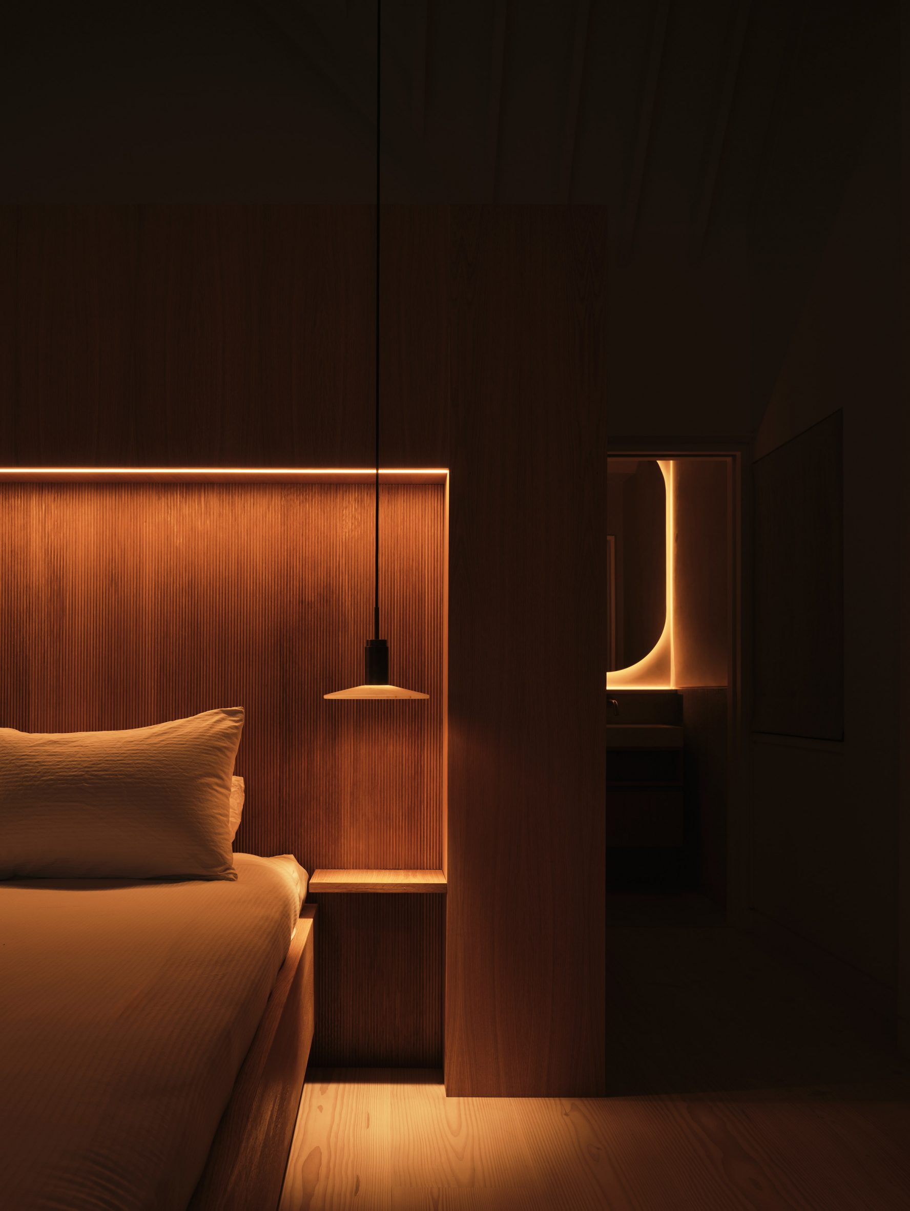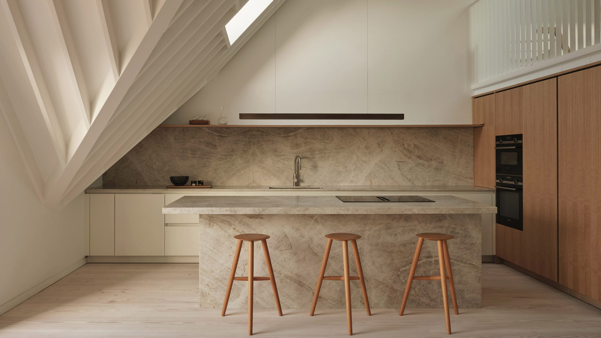 Kontrast stanowi centralny blok z odsłoniętego dębu oraz ciemniejsze drewno zastosowane w strefach sypialnianych. W kuchni pojawia się kamień Taj Mahal Quartzite, wykorzystany na blatach i ścianie nad blatem, który wprowadza subtelny rysunek i elegancki detal materiałowy. Powściągliwa paleta barw pozwala, aby to architektura i światło odgrywały główną rolę.